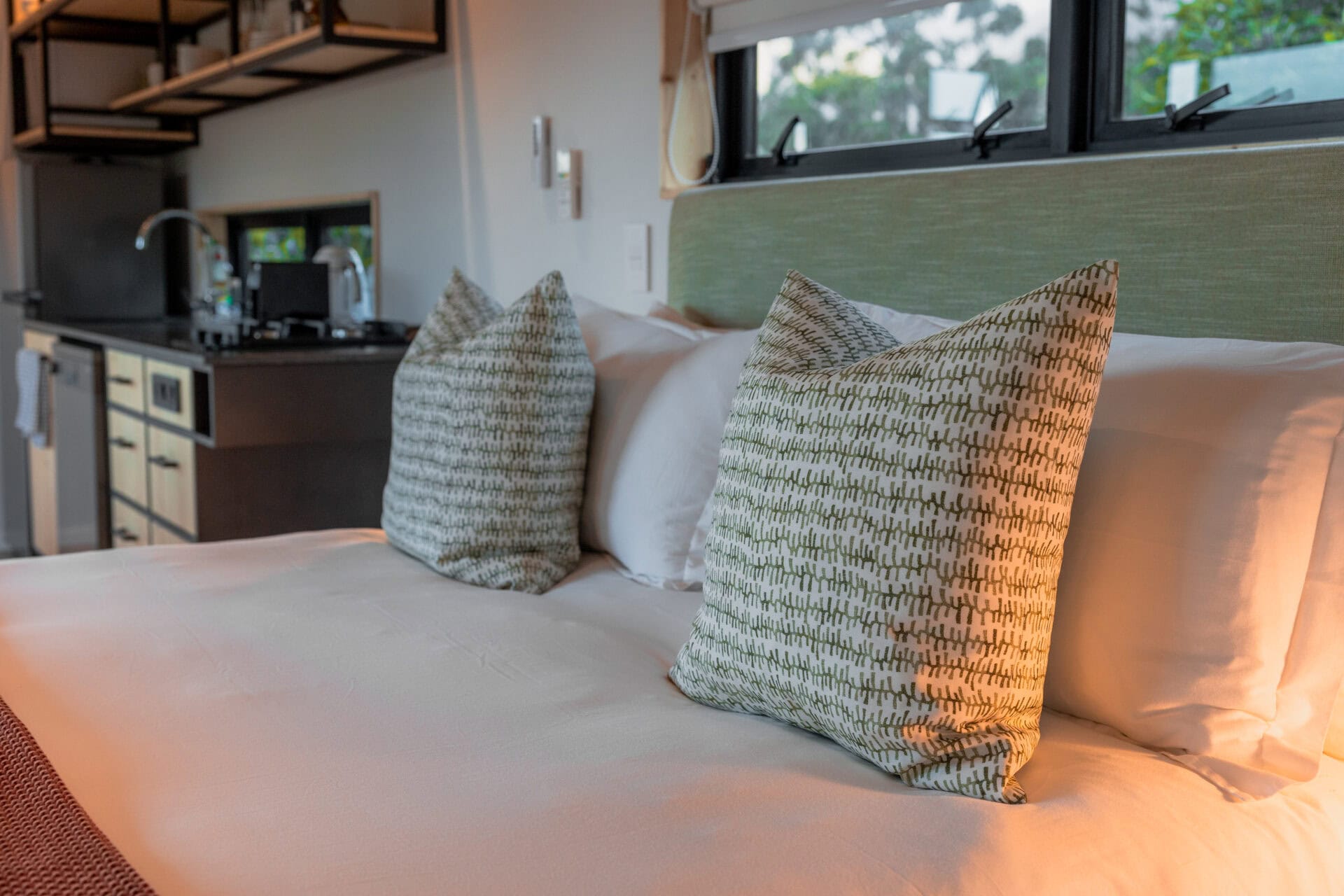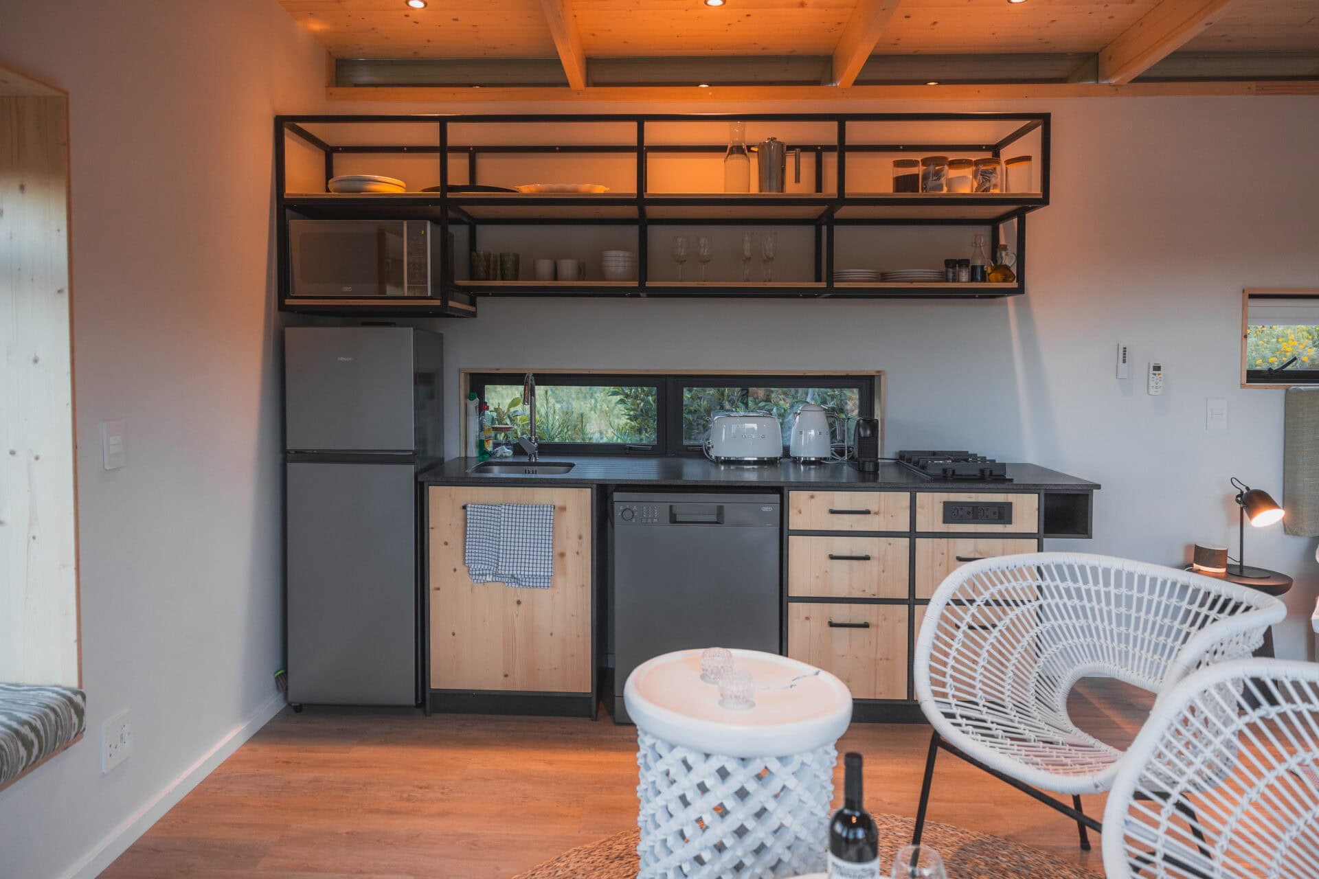 The queen size bed comes with luxurious Egyptian cotton linen and a Mungo throw for a good night’s sleep. There is also an aircon for the summer months and an industrial-style open wardrobe for storage.