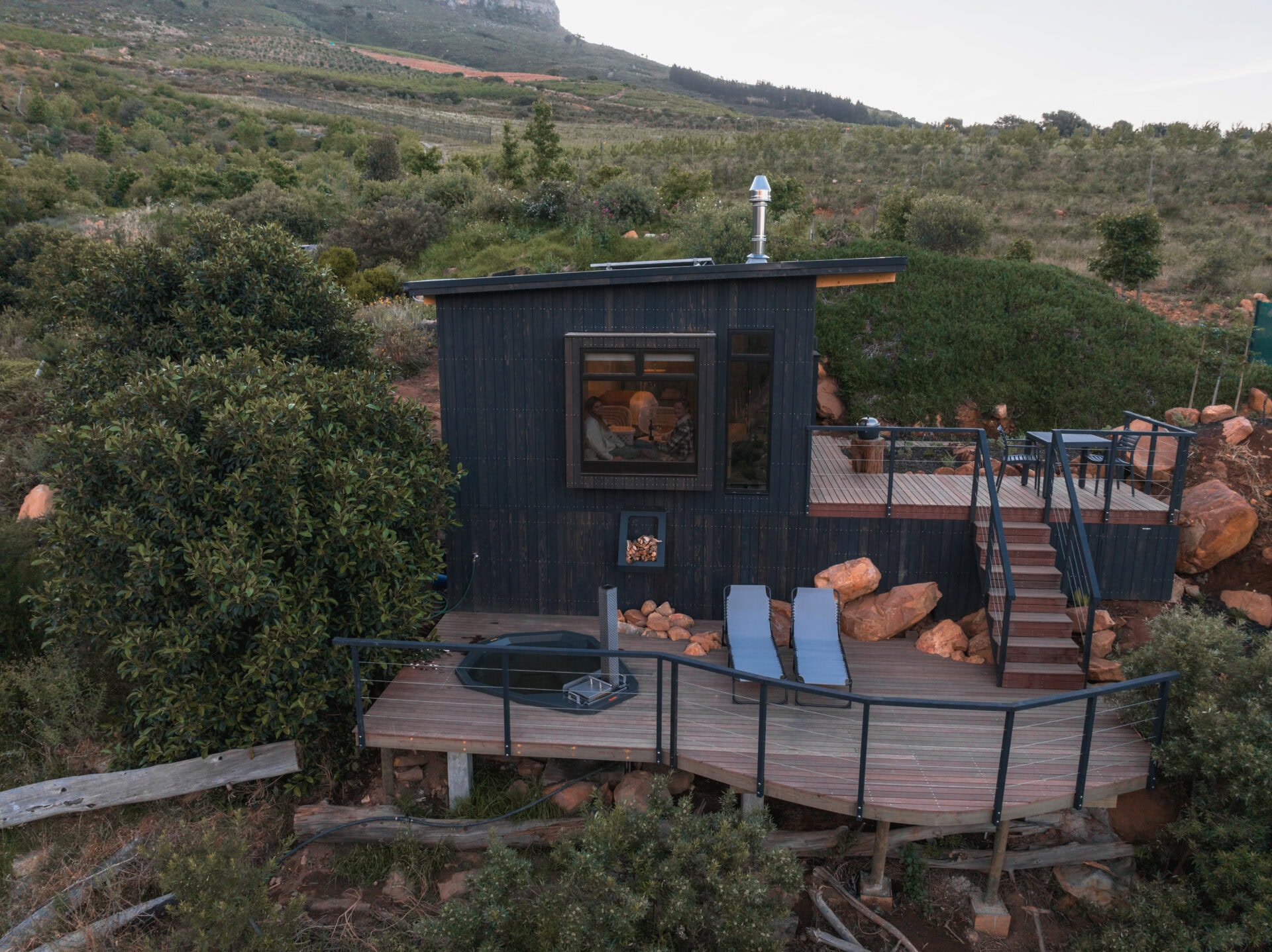 This off grid, open-plan Scandinavian-style wood cabin perfectly embodies the lizard it’s named after – perched on a rock and basking in the sun. It’s set apart from the other cabins on the farm to ensure privacy and comes with a fully equipped kitchenette, an indoor fireplace, and the cutest little window nook – perfect for snuggling up with a good book or a glass of wine. The deck is divided into two levels, with a dining table on the upper deck and a wood fired hot tub and sun loungers on the lower deck. It’s also perfect for working remotely as there’s high speed WiFi and no load shedding.