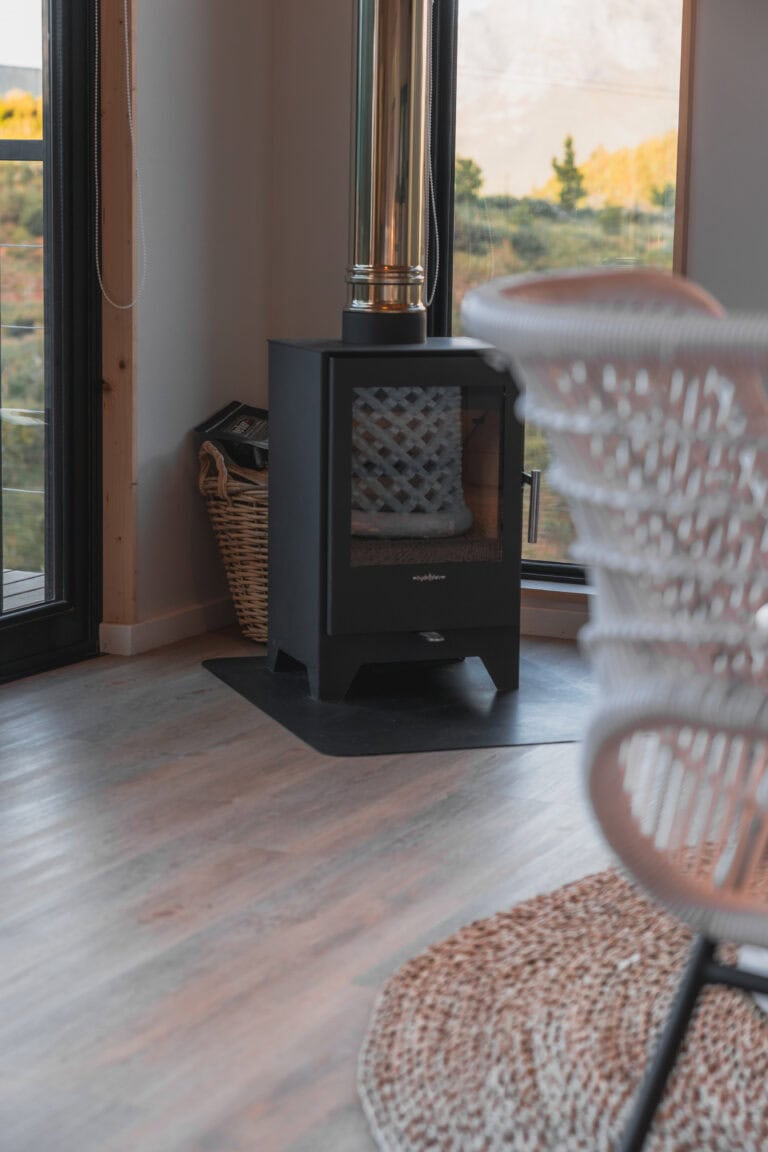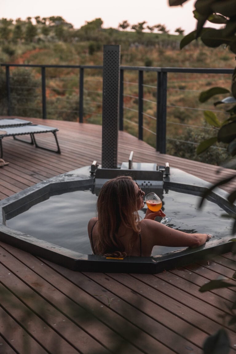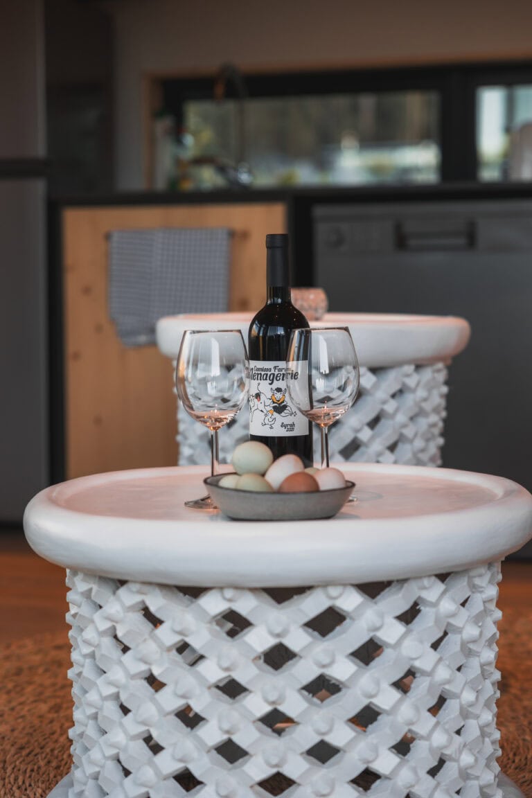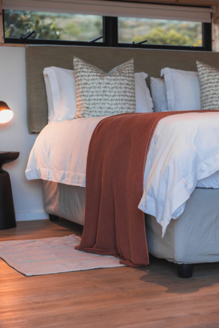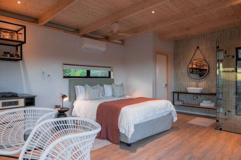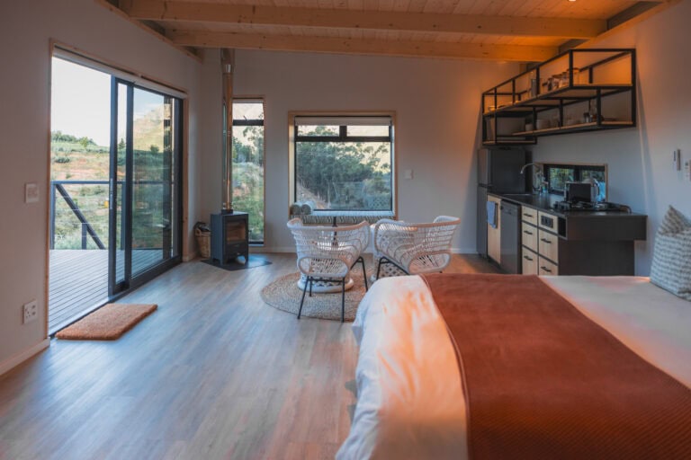 This off grid, open-plan Scandinavian-style wood cabin perfectly embodies the lizard it’s named after – perched on a rock and basking in the sun. It’s set apart from the other cabins on the farm to ensure privacy and comes with a fully equipped kitchenette, an indoor fireplace, and the cutest little window nook – perfect for snuggling up with a good book or a glass of wine. The deck is divided into two levels, with a dining table on the upper deck and a wood fired hot tub and sun loungers on the lower deck. It’s also perfect for working remotely as there’s high speed WiFi and no load shedding.
