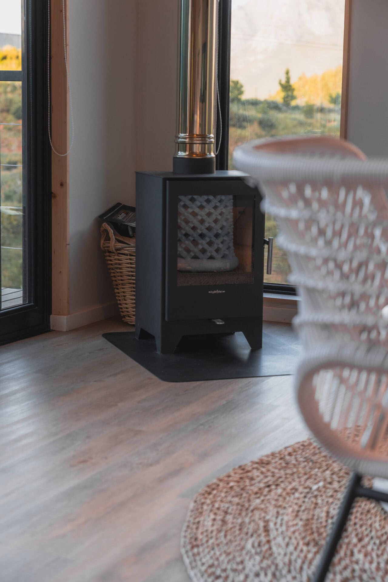 The open-plan living space boasts an inviting indoor fireplace, accompanied by two cozy bucket chairs and a comfy bench seat framing the stunning mountain views. There is an outdoor dining area perfect for summer evenings, as well as a small portable braai and a hot tub with two sun loungers.