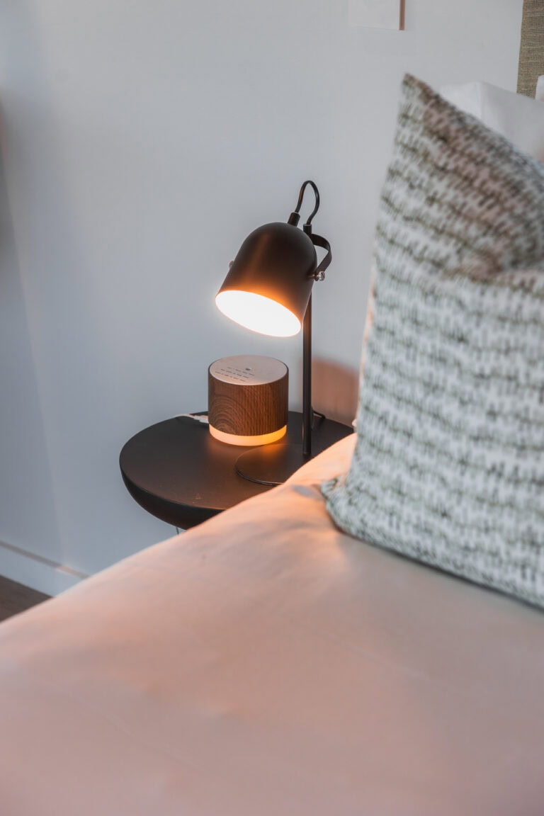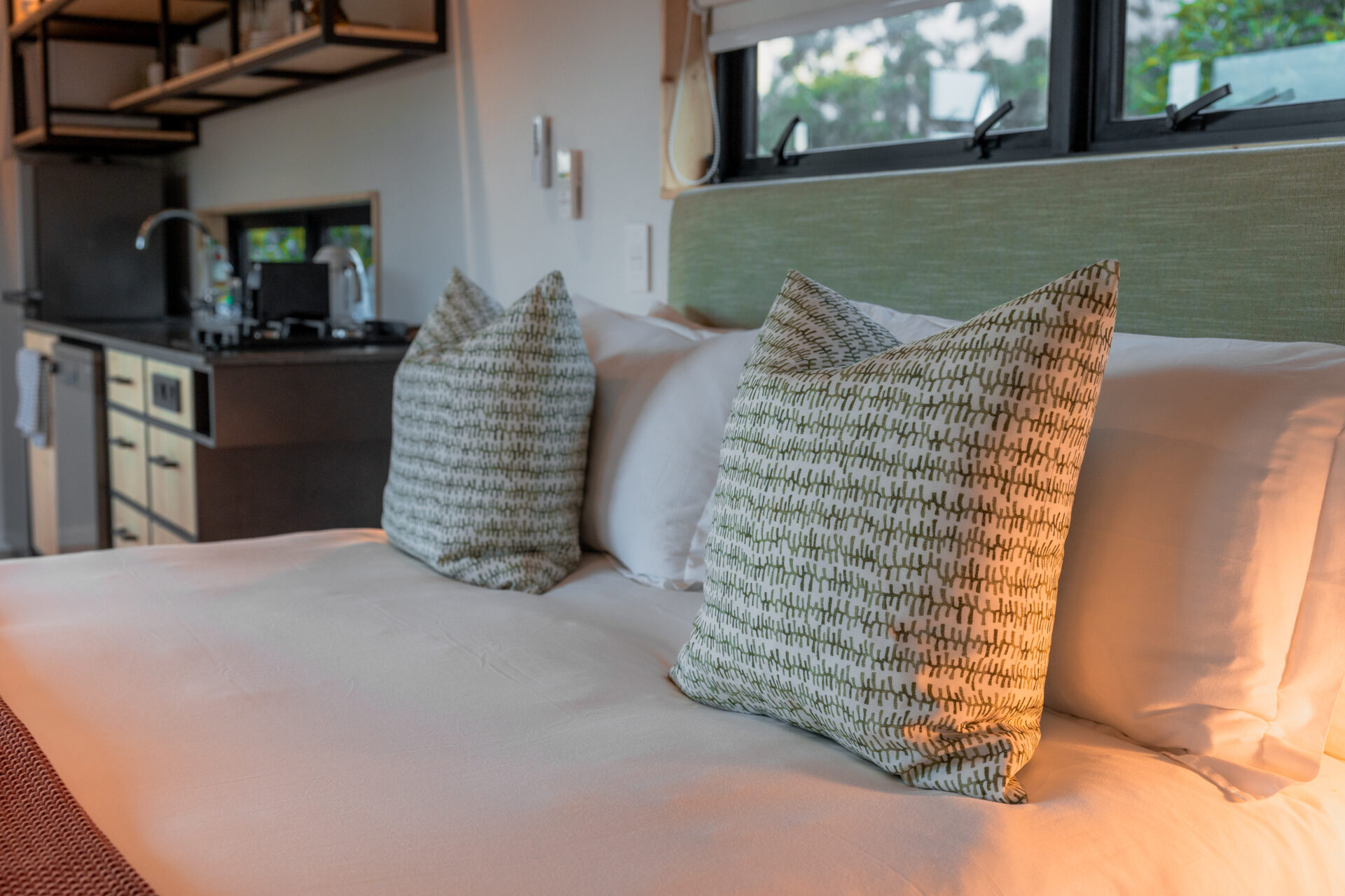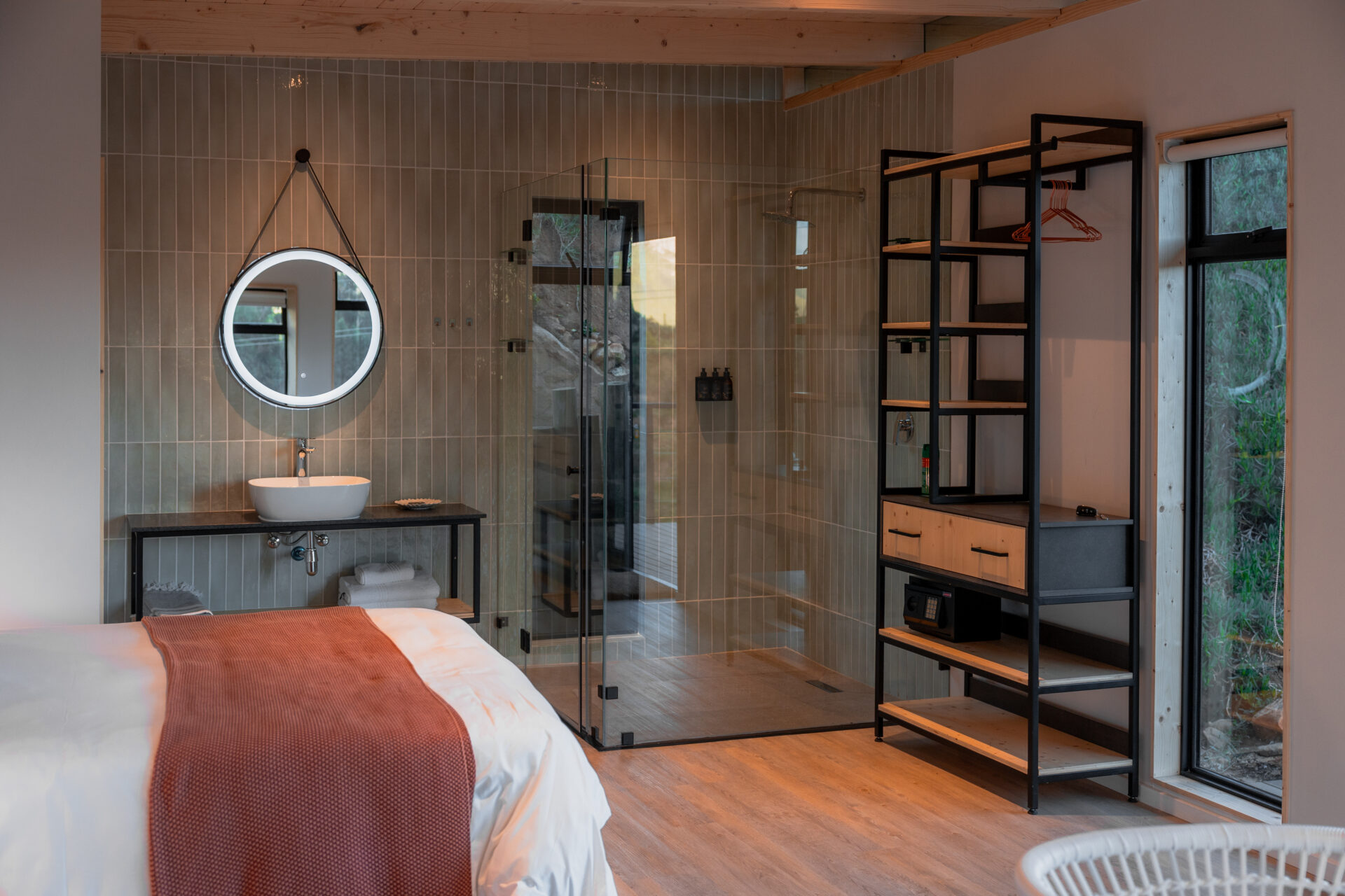 The queen size bed comes with luxurious Egyptian cotton linen and a Mungo throw for a good night’s sleep. There is also an aircon for the summer months and an industrial-style open wardrobe for storage.