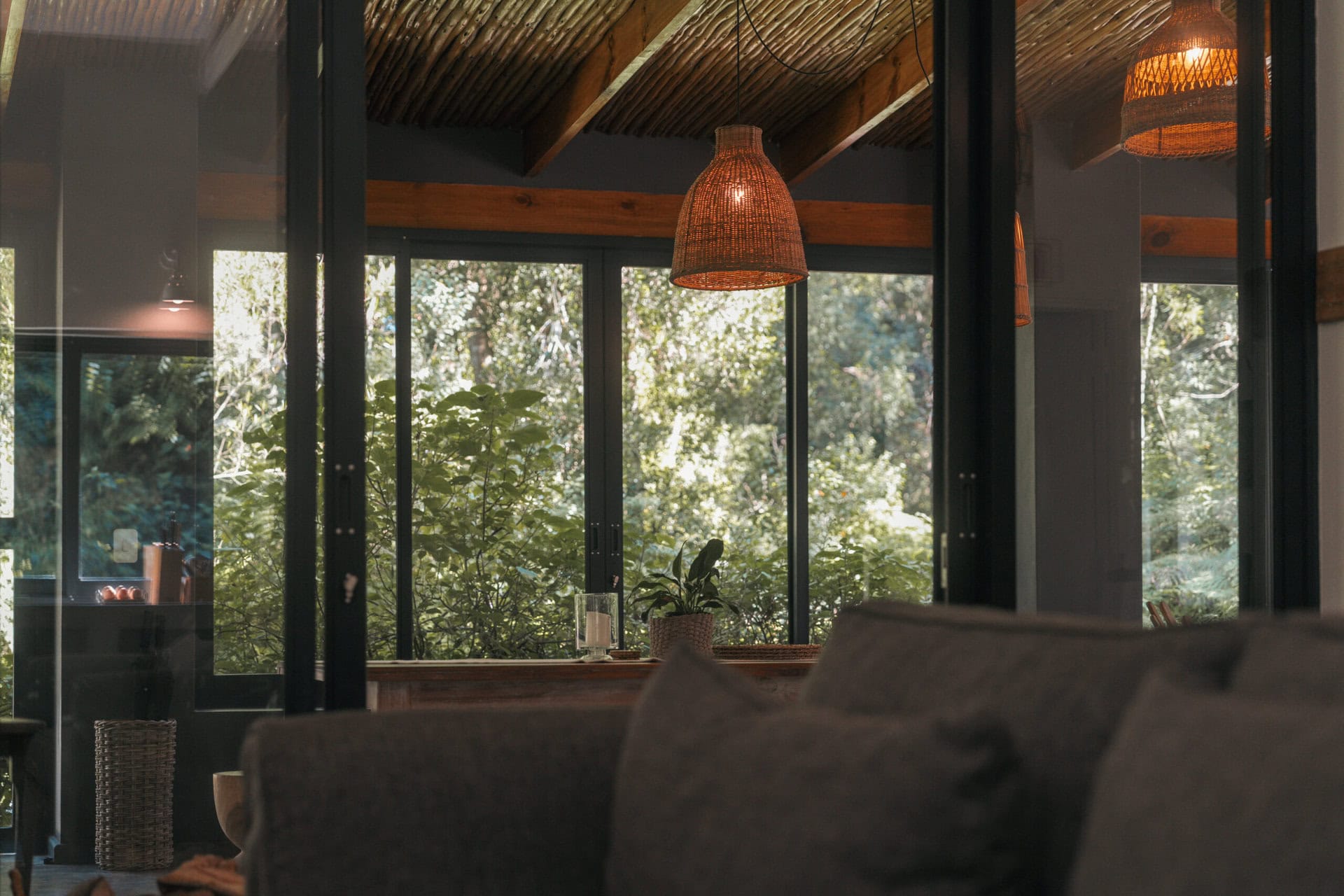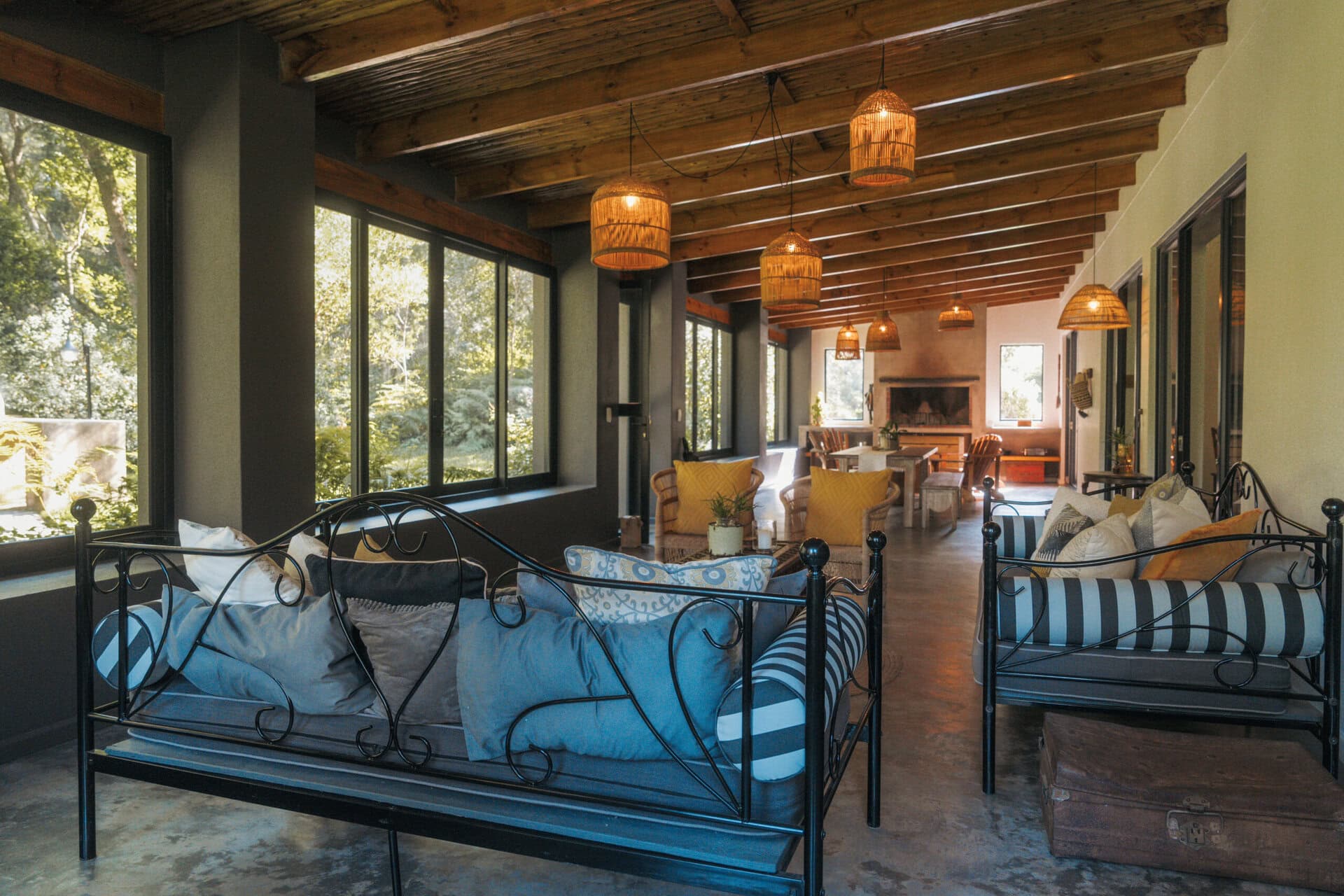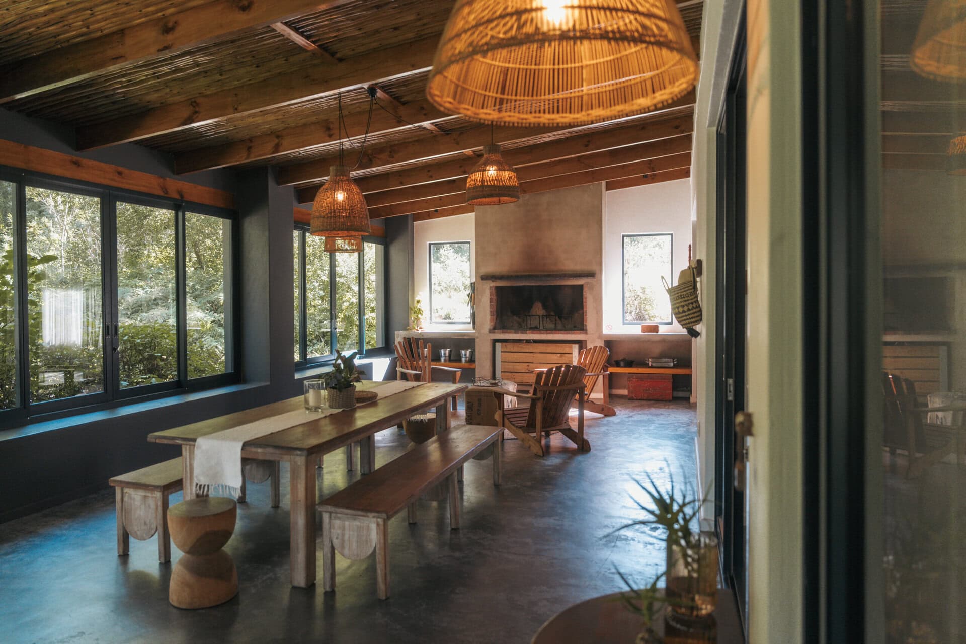 There are multiple living spaces to enjoy – there is a cozy lounge with two double couches by the fireplace, alongside a dining area for shared meals. The enclosed patio provides an additional living and dining space, complete with forest views and an indoor braai, so you can braai comfortably all year round. Board games and books are also provided.