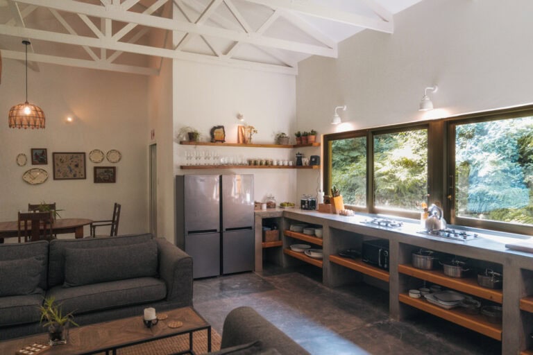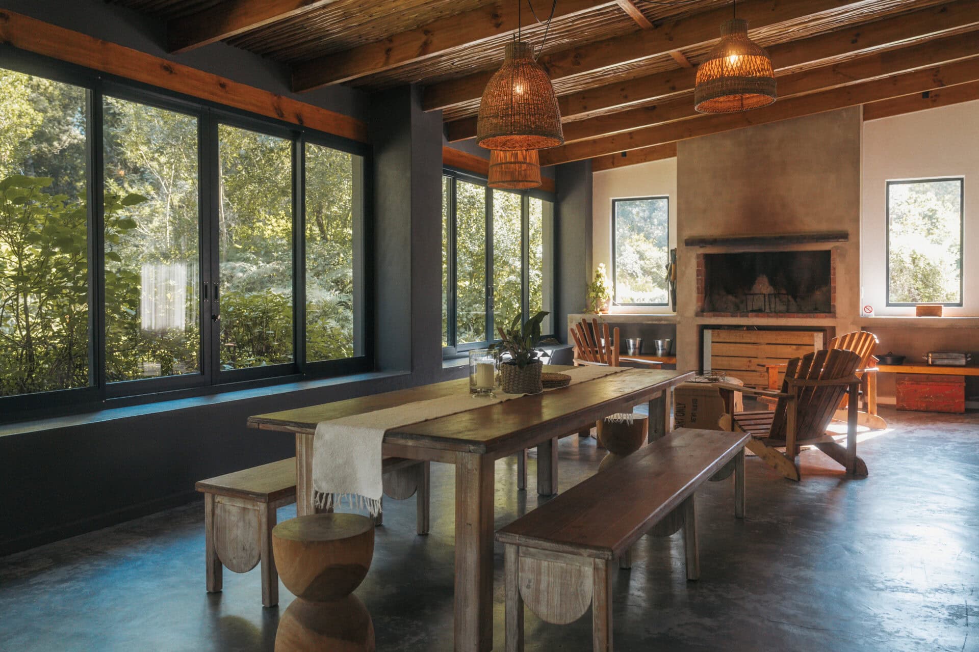 There are multiple living spaces to enjoy – there is a cozy lounge with two double couches by the fireplace, alongside a dining area for shared meals. The enclosed patio provides an additional living and dining space, complete with forest views and an indoor braai, so you can braai comfortably all year round. Board games and books are also provided.