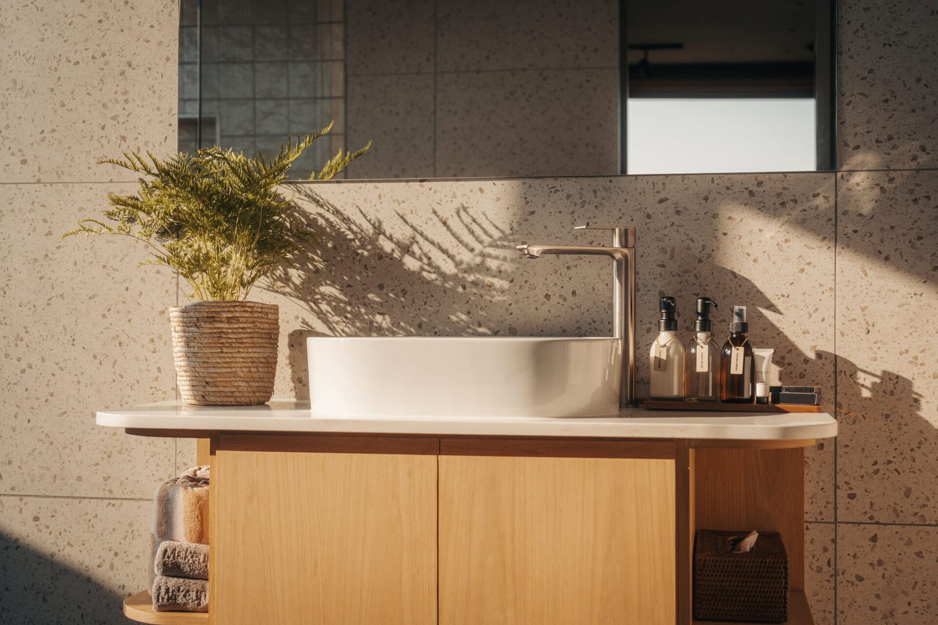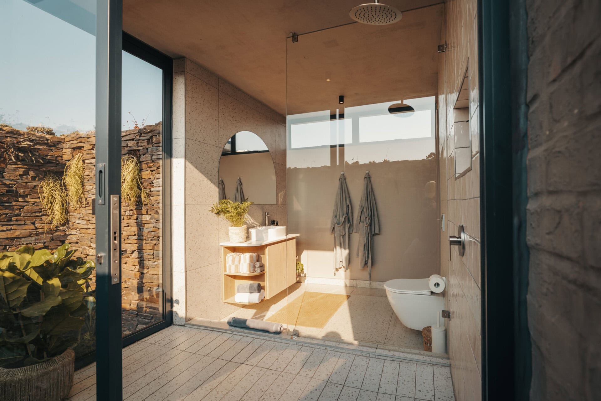 The spacious bathroom features a large indoor shower, and there’s also an outdoor garden shower surrounded by succulents. Charlotte Rhys amenities and gowns are provided.