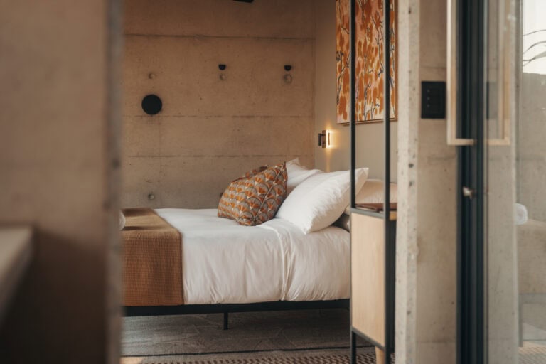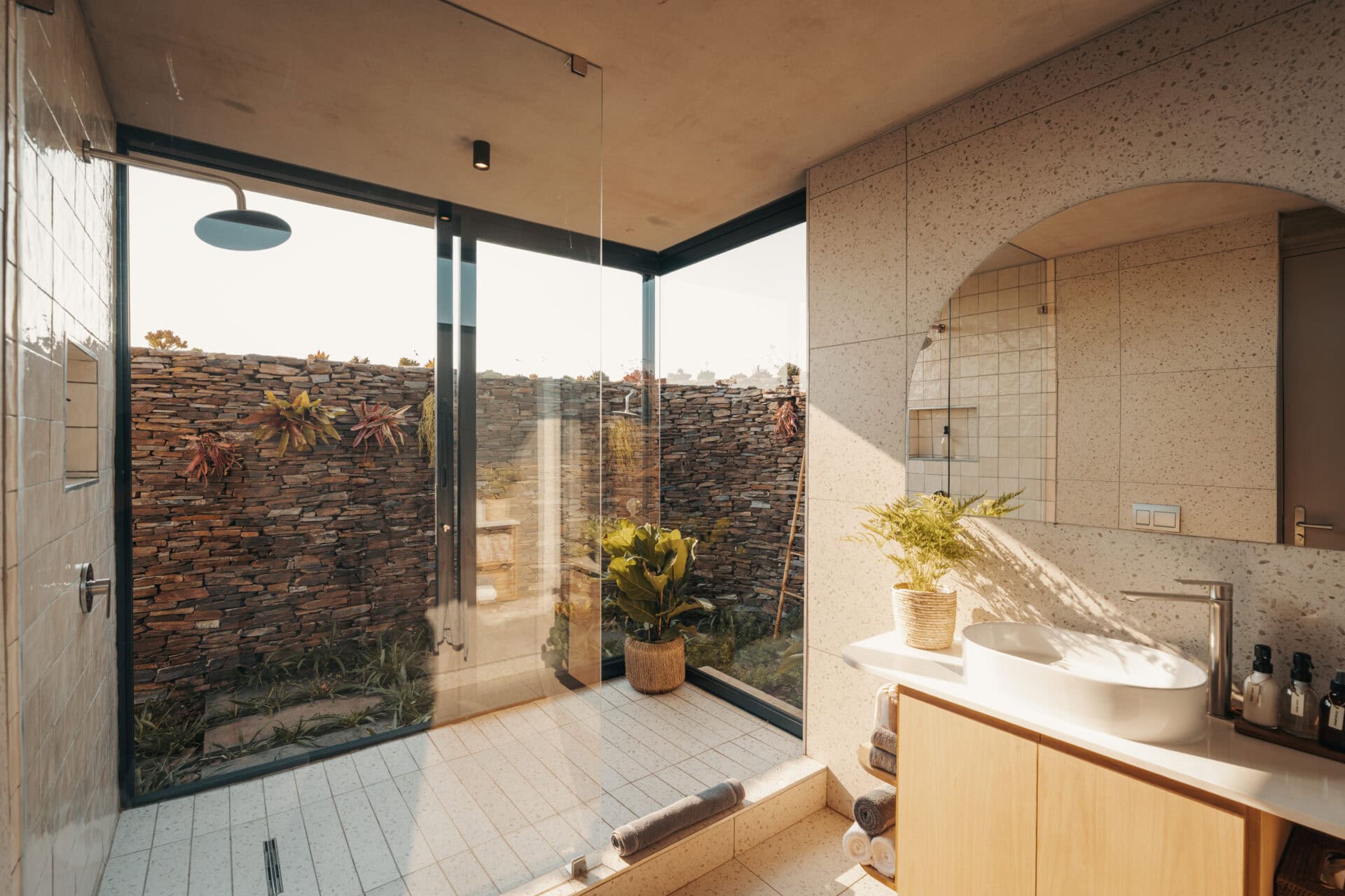 The spacious bathroom features a large indoor shower, and there’s also an outdoor garden shower surrounded by succulents. Charlotte Rhys amenities and gowns are provided.