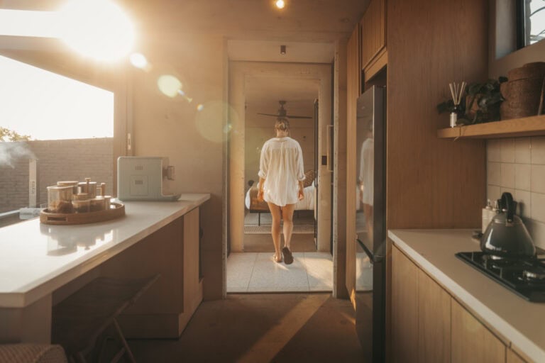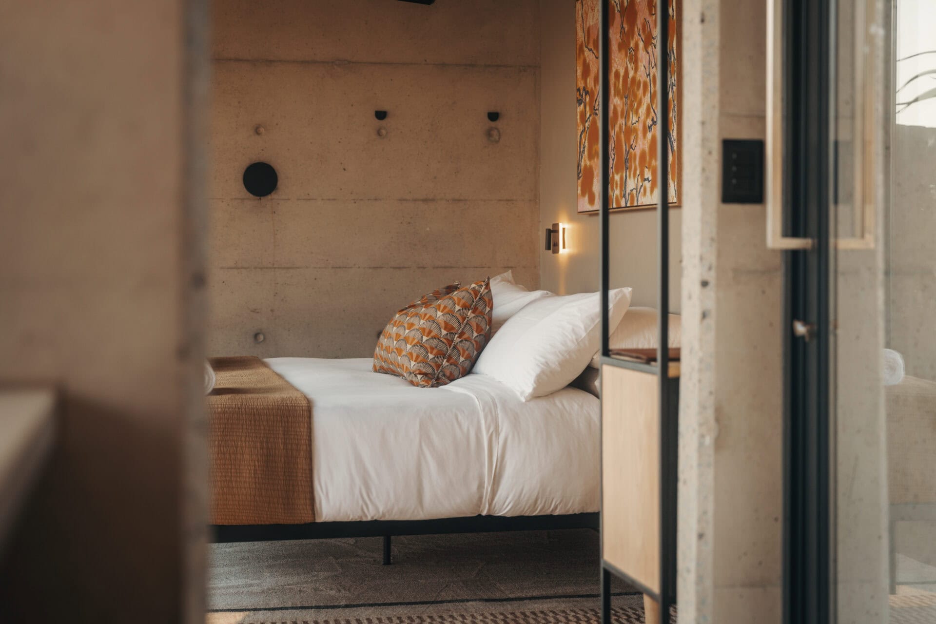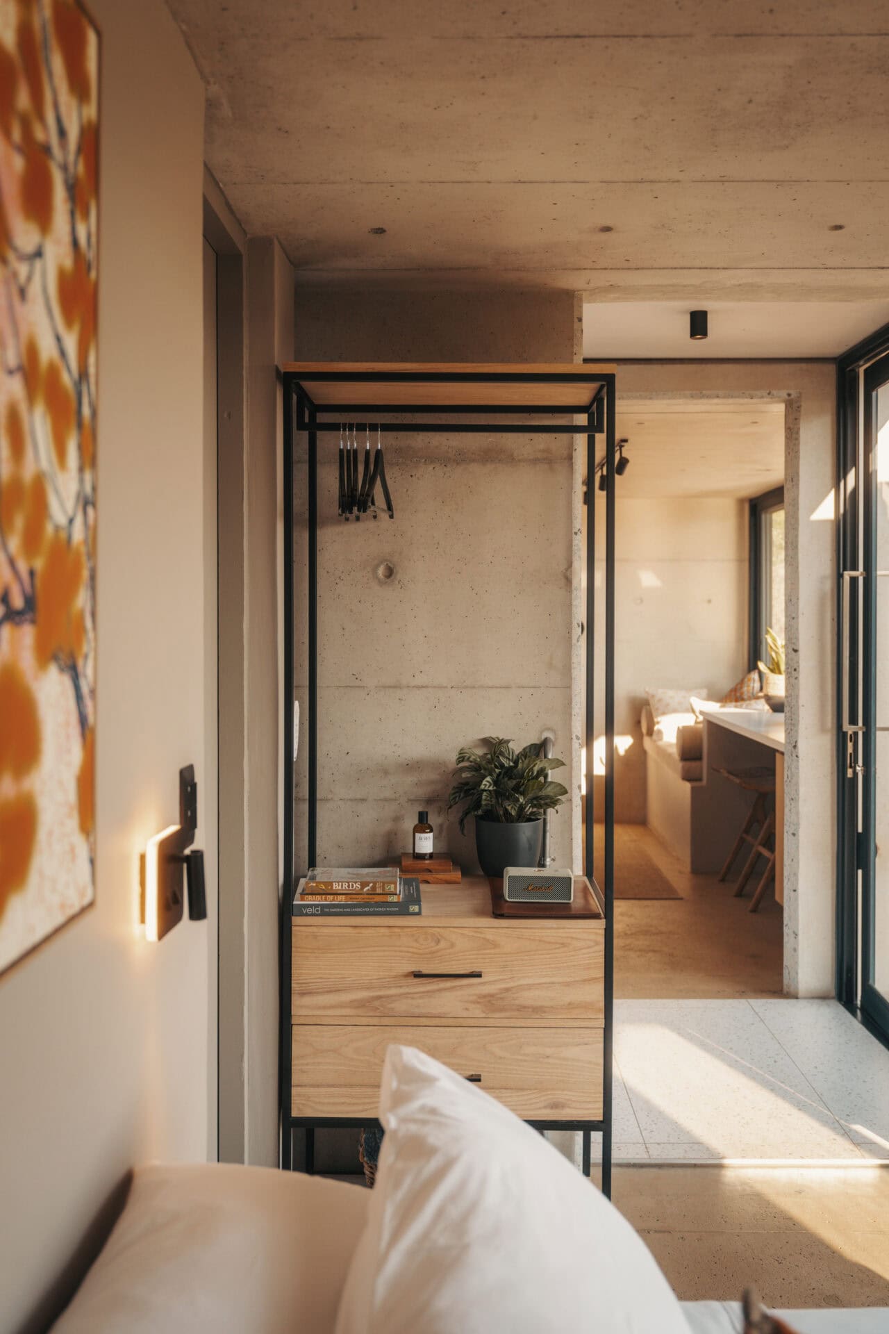 The bedroom opens onto the deck, allowing you to throw the doors wide open and take in the breathtaking views right from your bed. The king-sized bed features luxurious linen, extra blankets for winter, and even a fireplace to keep things cozy. There’s also a clothes rail with drawers for storage, and a fan to keep you cool during the summer months.