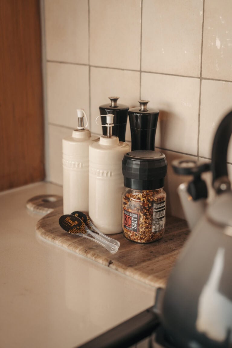 There’s a fully equipped kitchen with a gas hob, microwave, fridge/freezer, whistling kettle, SMEG coffee machine and toaster. Instant coffee, ground coffee, coffee beans, tea, sugar, rusks, 250ml milk, olive oil, balsamic vinegar and salt & pepper are provided.