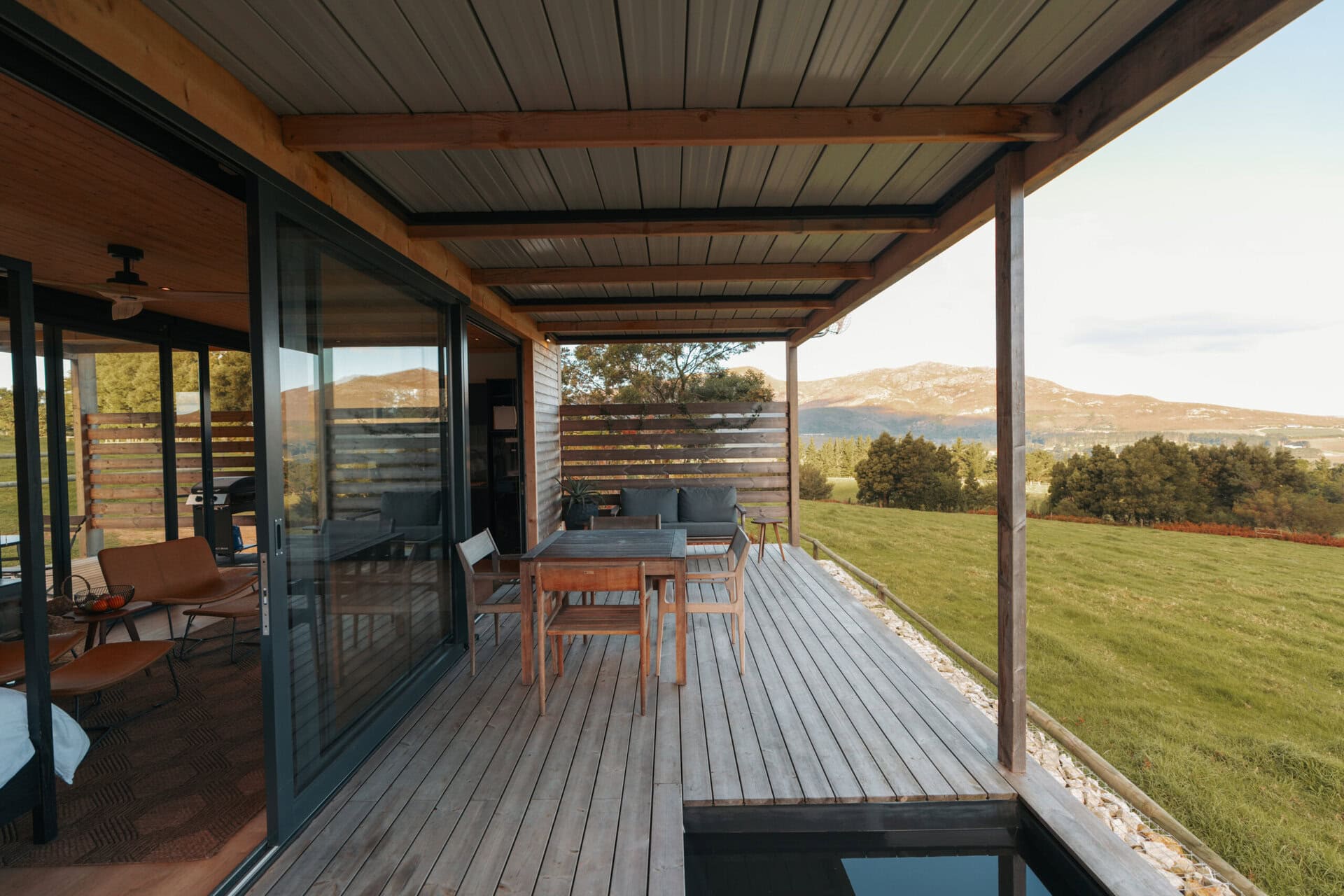 The cabin has decks on both sides, allowing you to soak in the views from every angle. The front deck offers a wood-fired hot tub, a dining table and a comfy lounge area – perfect for meals, sunsets, or simply unwinding. The back deck is a quieter spot, ideal for curling up with a book, and comes with a bench seat and a gas braai.