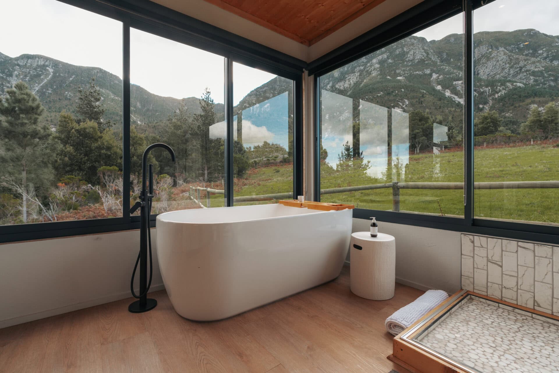 The spacious bathroom is surrounded by windows, flooding the space with natural light and offering beautiful views. It features a massive bath (big enough for two!) and a separate shower. The windows also open wide if you want to relax more in nature.