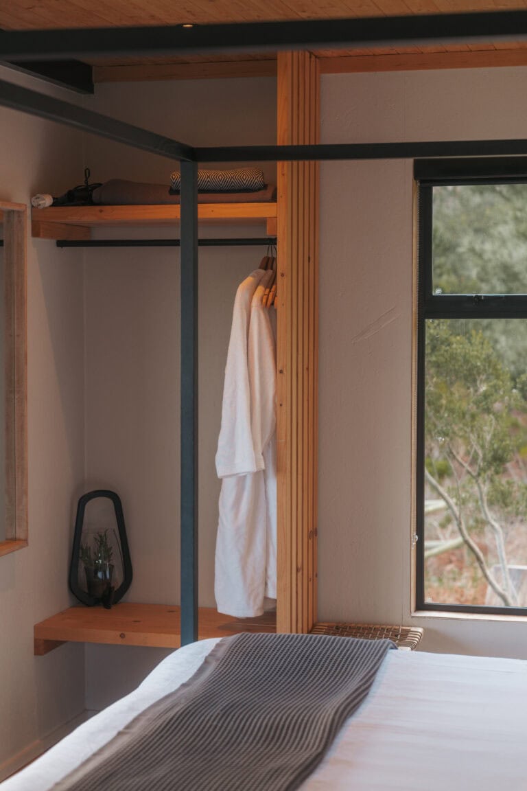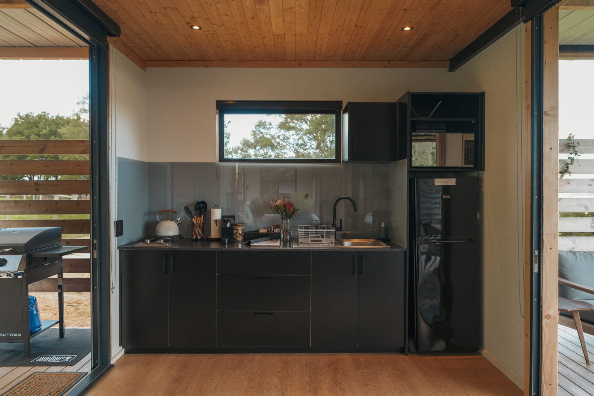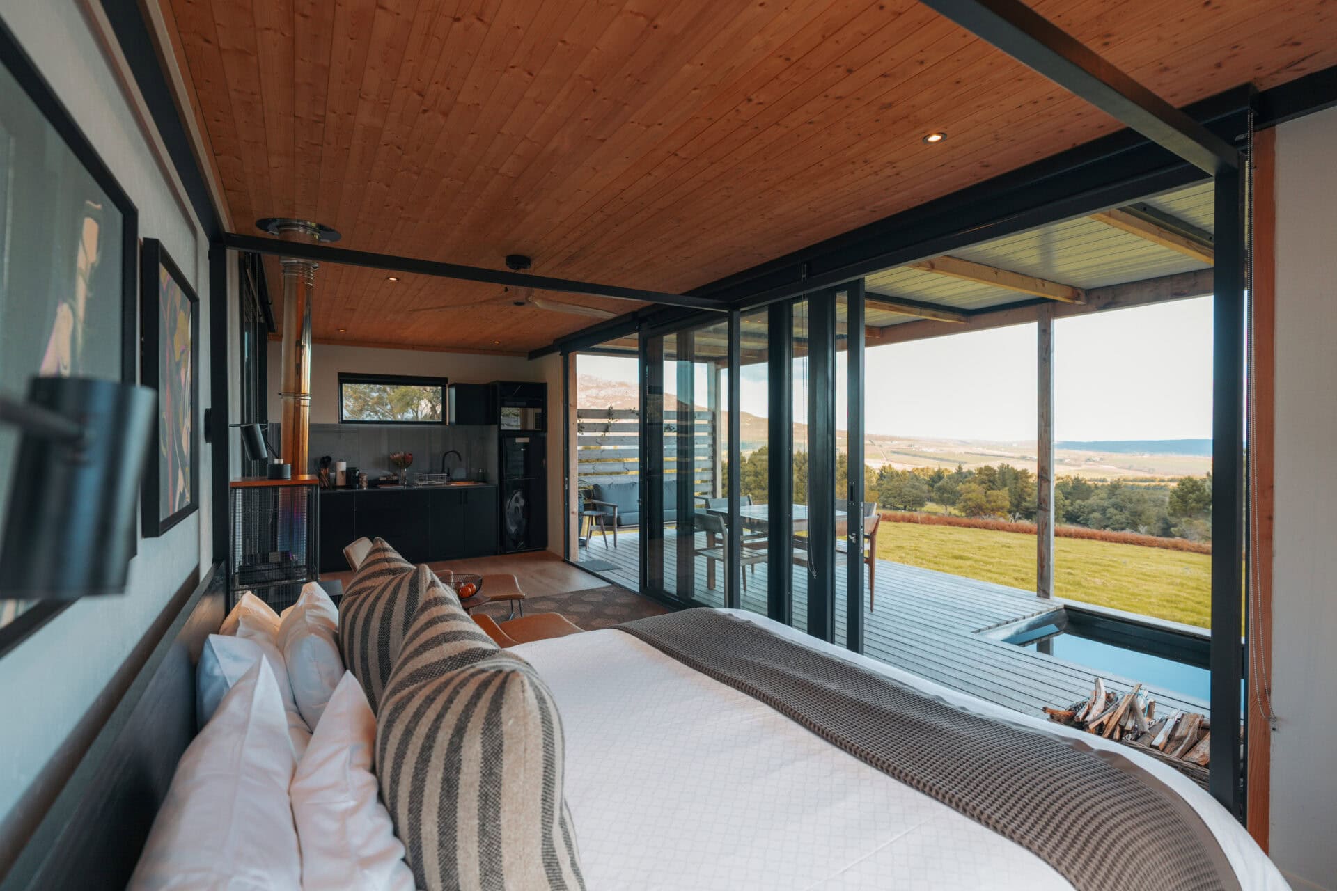 The cabin has decks on both sides, allowing you to soak in the views from every angle. The front deck offers a wood-fired hot tub, a dining table and a comfy lounge area – perfect for meals, sunsets, or simply unwinding. The back deck is a quieter spot, ideal for curling up with a book, and comes with a bench seat and a gas braai.