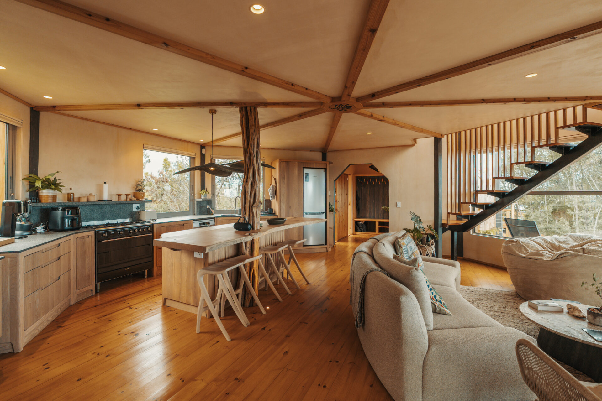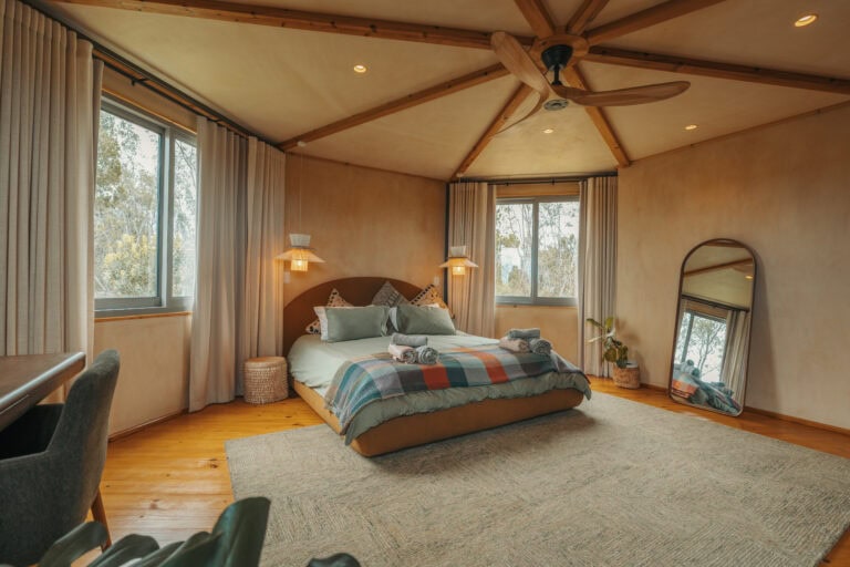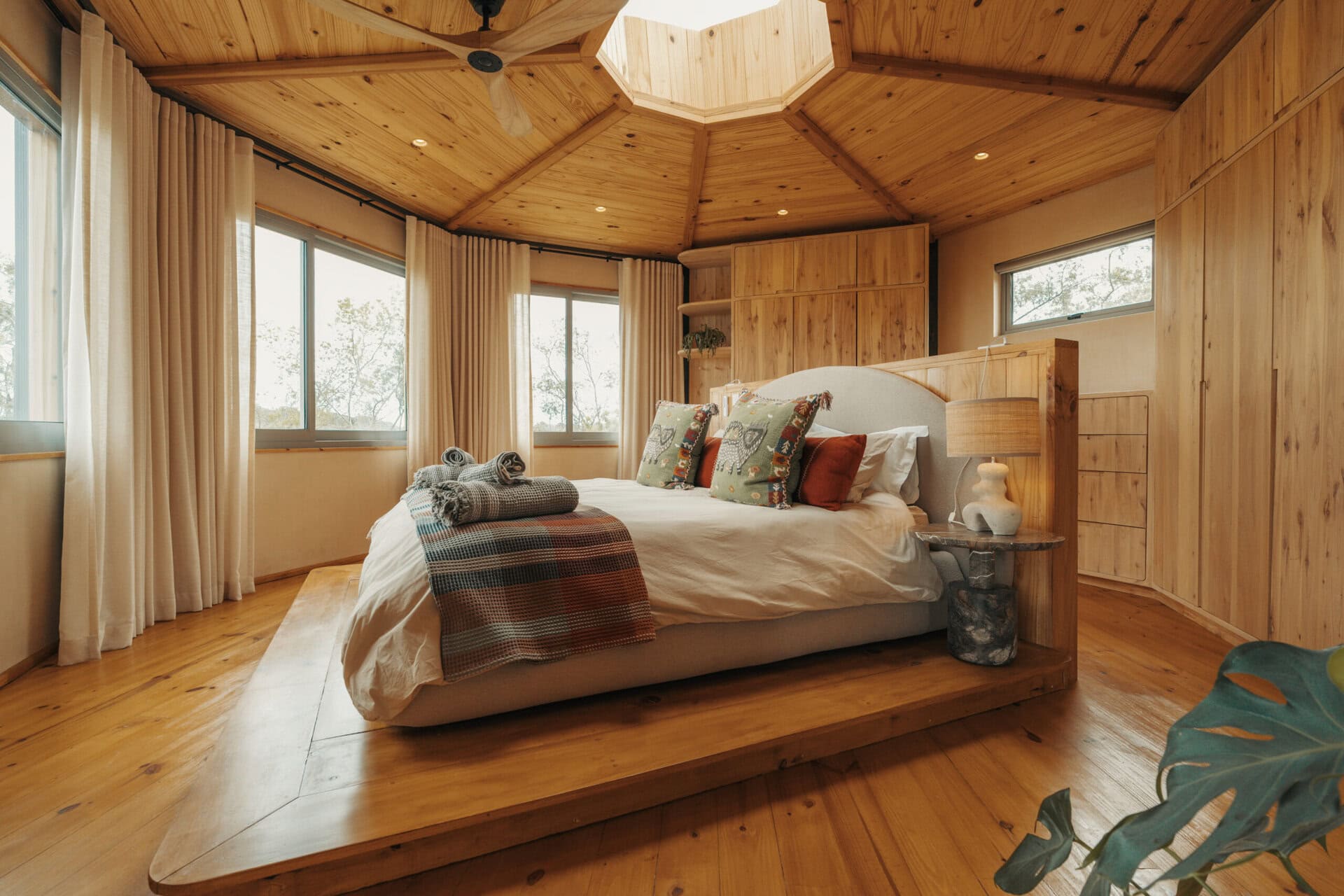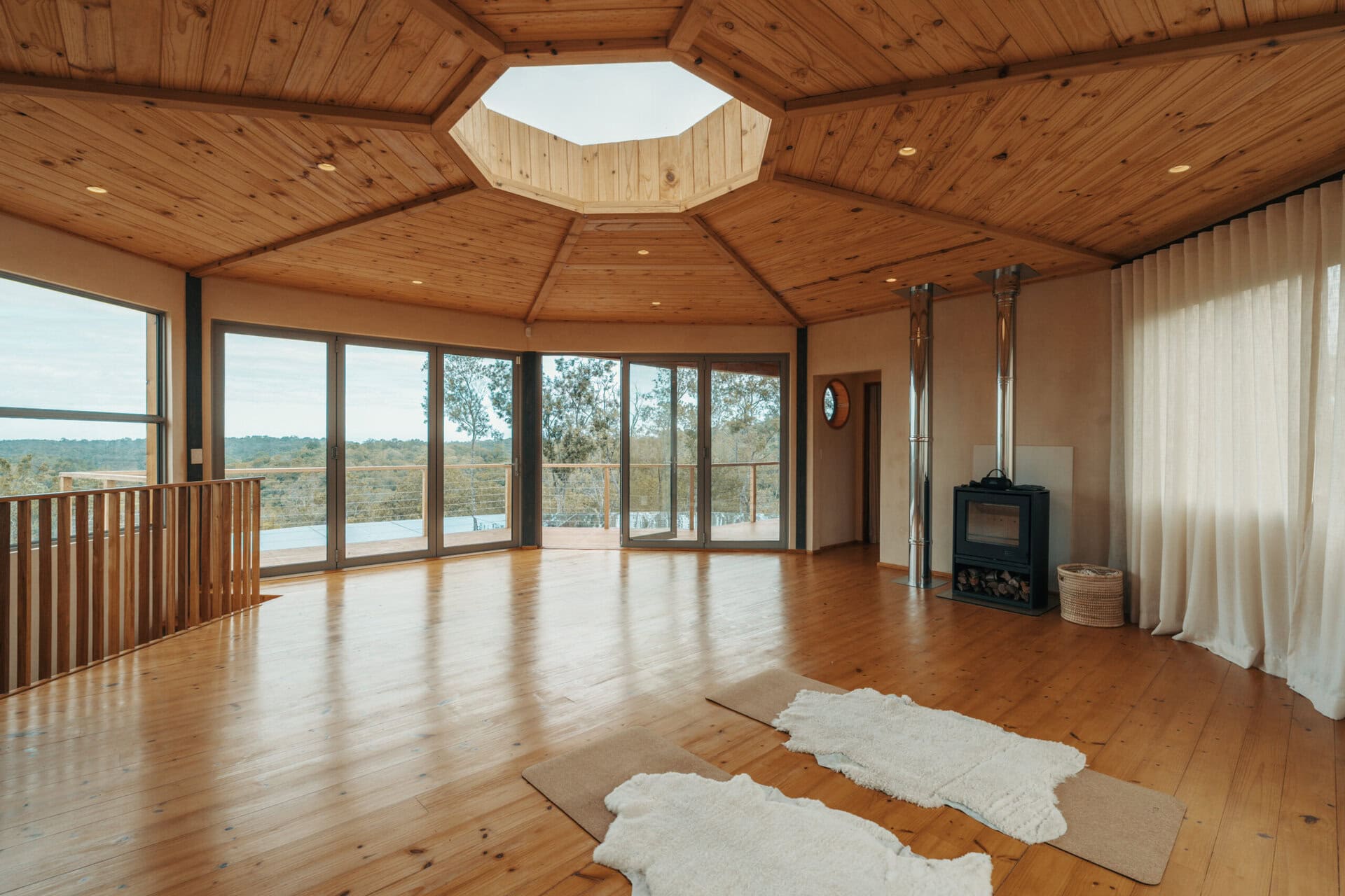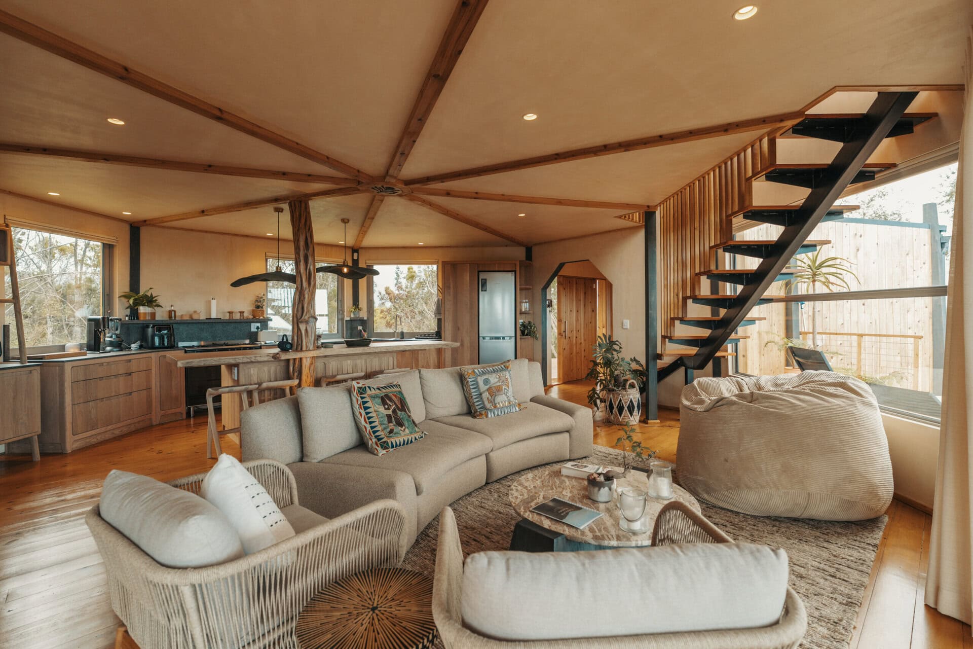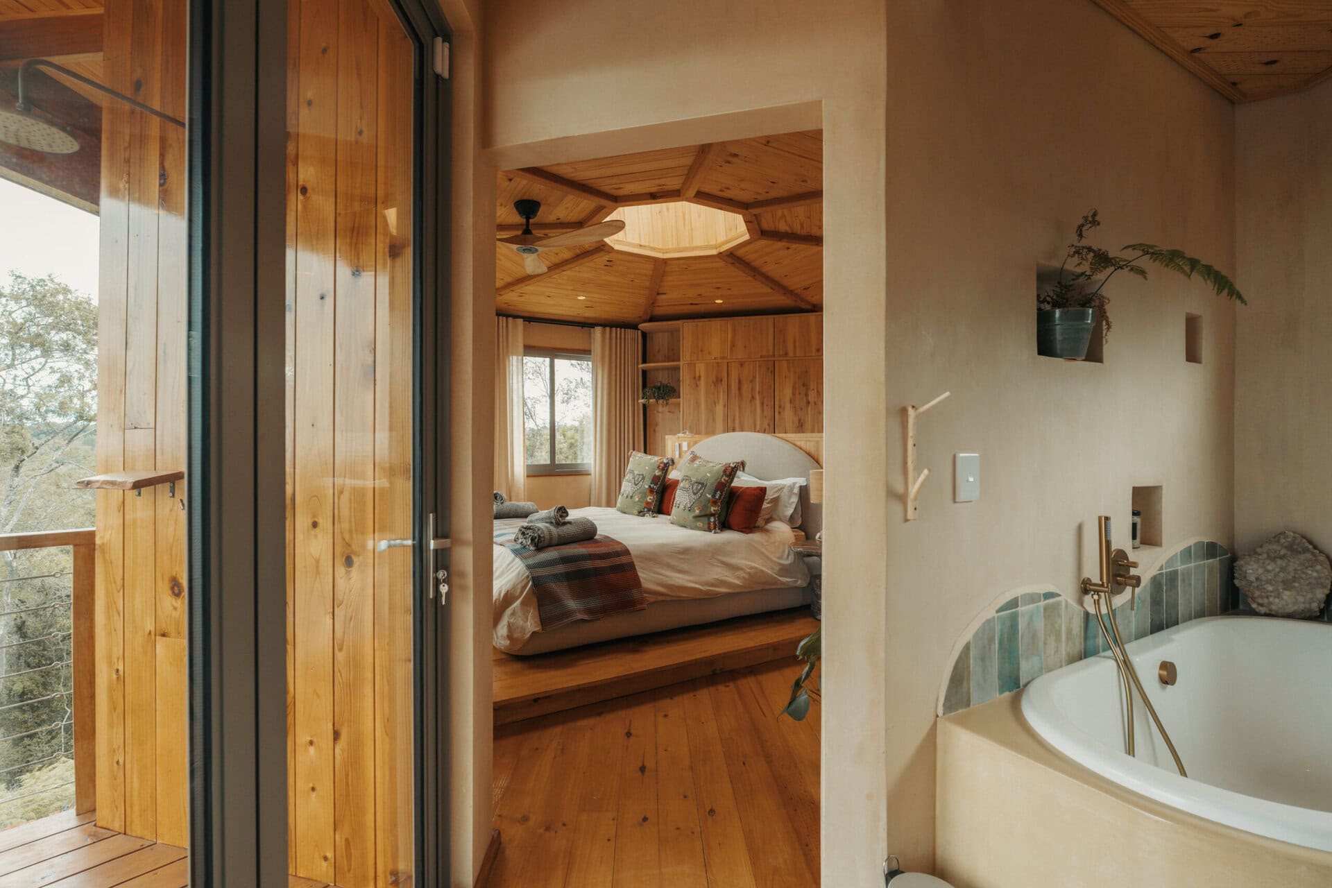 The open-plan living area has a warm, natural feel – think timber, earthy tones, and big windows that blur the line between inside and out. There’s a large couch, two armchairs, a fireplace, and a large Vetsak beanbag for ultimate chilling. Upstairs you’ll find one of the most special features of Emerald Ravine, the yoga shala, complete with yoga mats, a mother drum, and a gong.