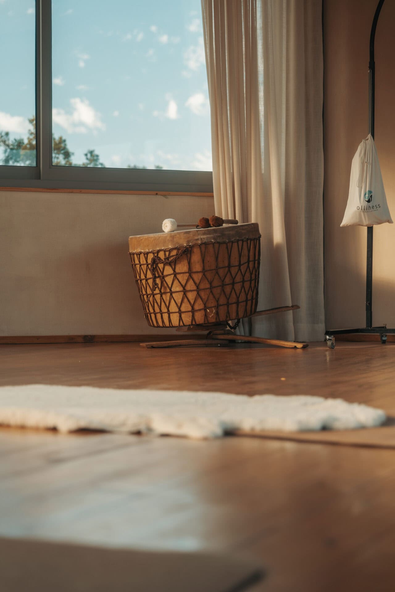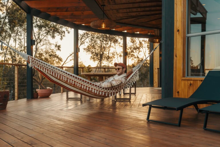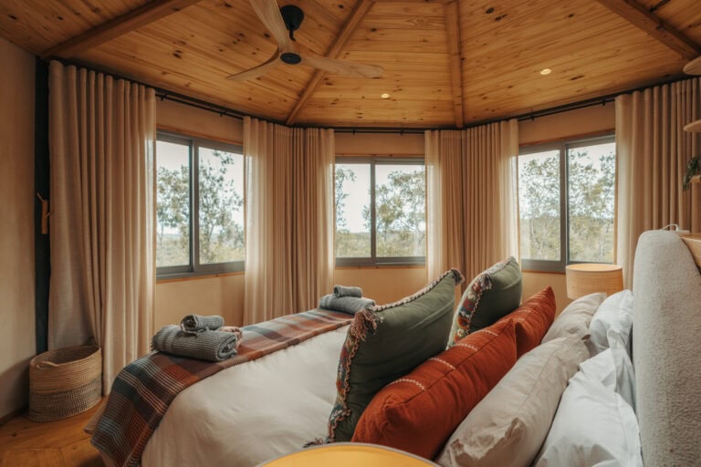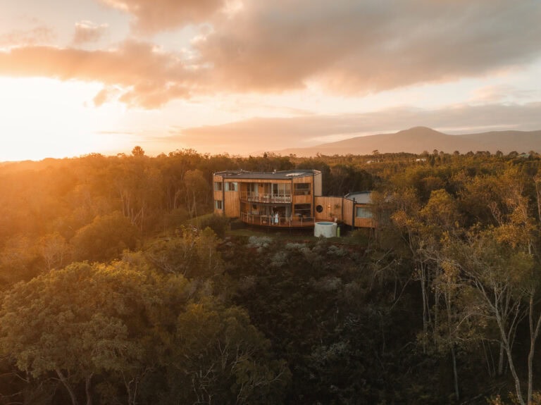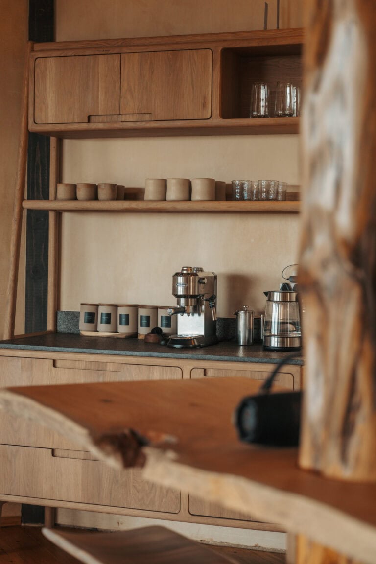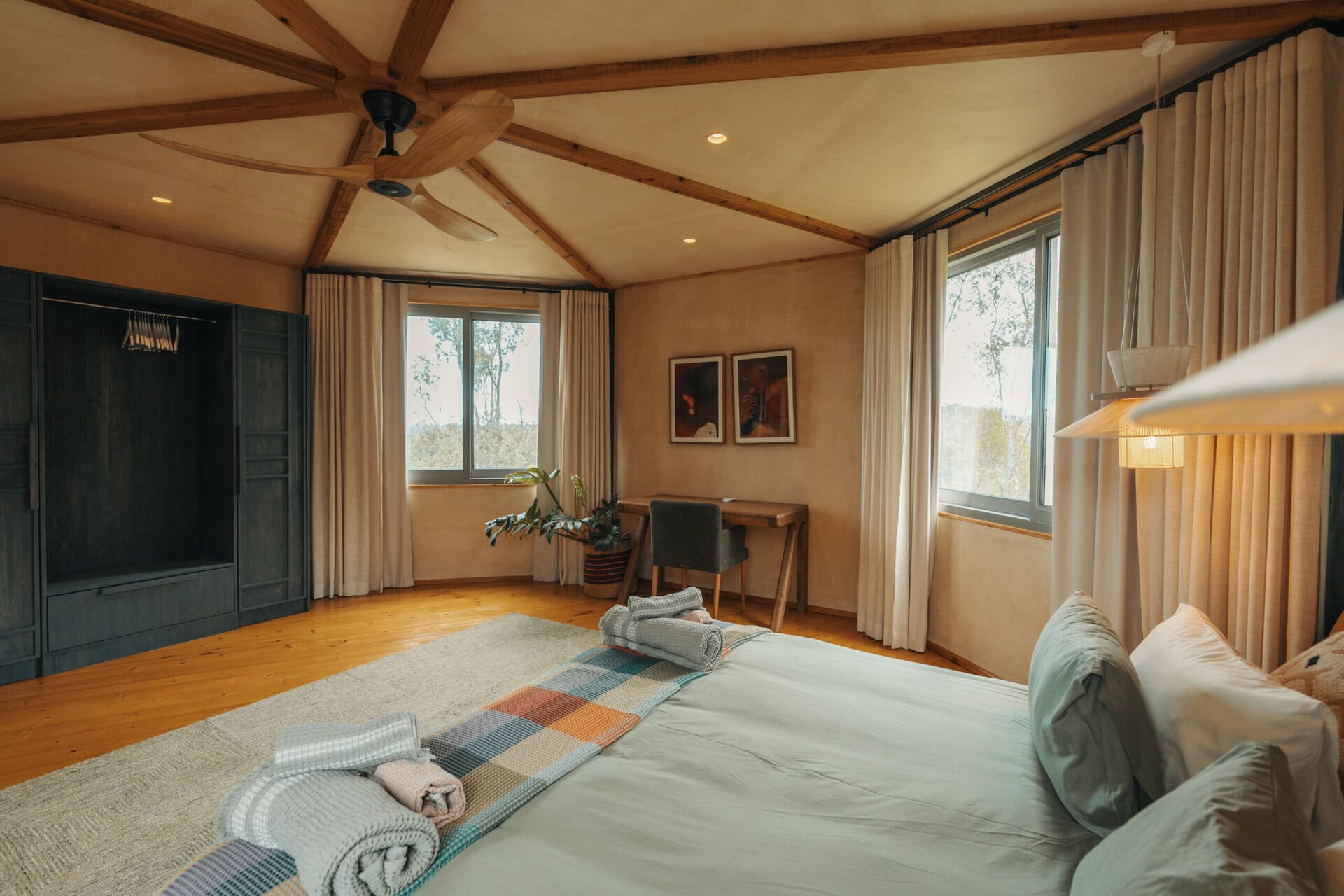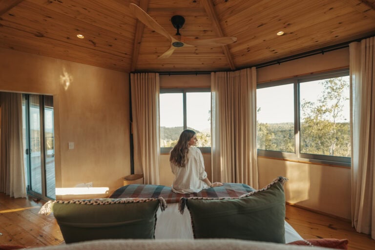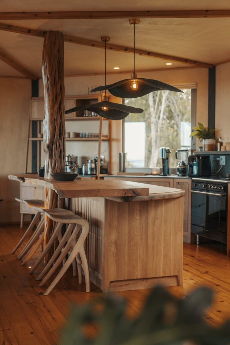 The open-plan living area has a warm, natural feel – think timber, earthy tones, and big windows that blur the line between inside and out. There’s a large couch, two armchairs, a fireplace, and a large Vetsak beanbag for ultimate chilling. Upstairs you’ll find one of the most special features of Emerald Ravine, the yoga shala, complete with yoga mats, a mother drum, and a gong.