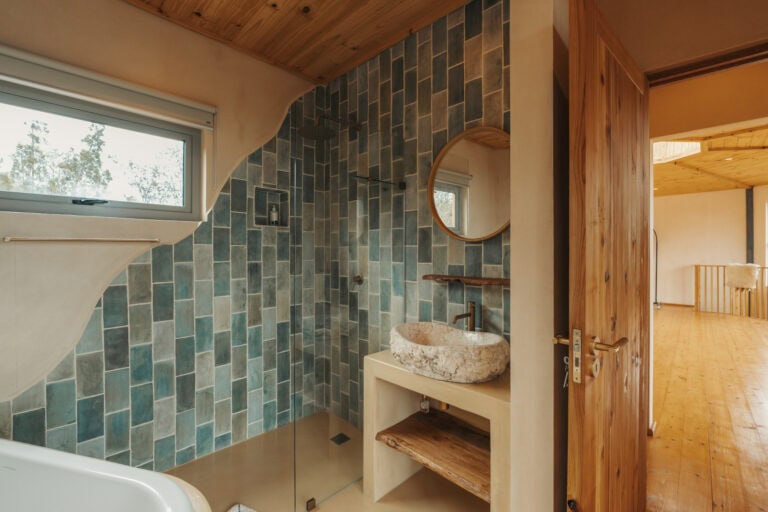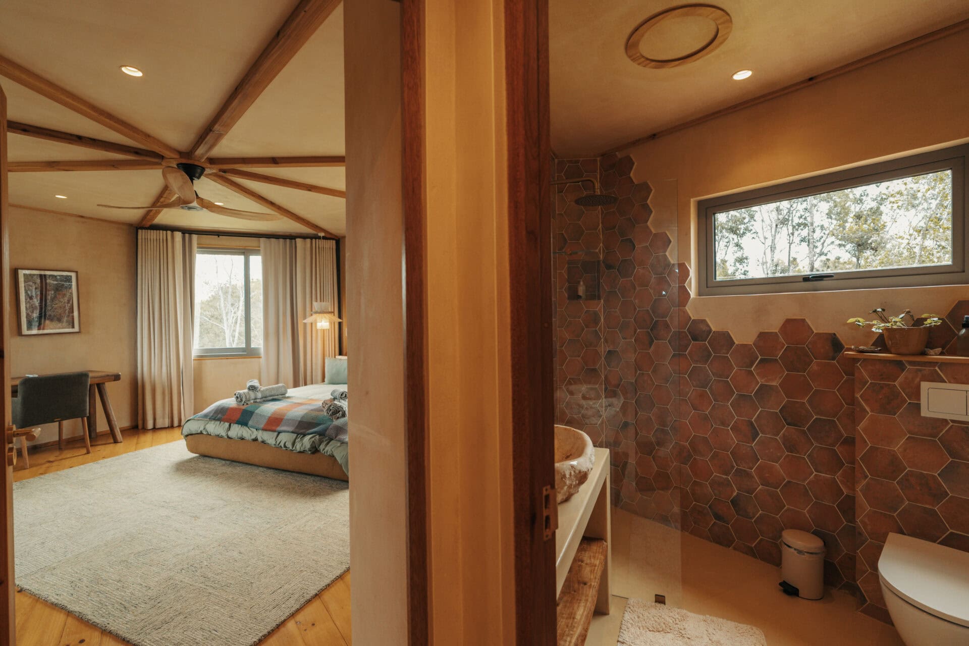 The main bedroom comes with a large soaking bath as well as an indoor and outdoor shower for a more immersive, nature-filled experience. The toilet is separate for privacy. The downstairs bathroom has a walk-in shower, and there’s an additional loo near the front door.