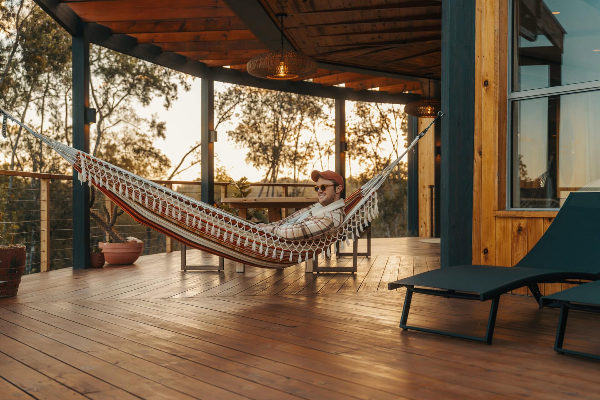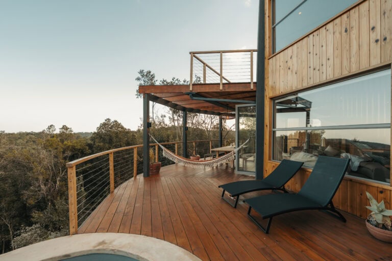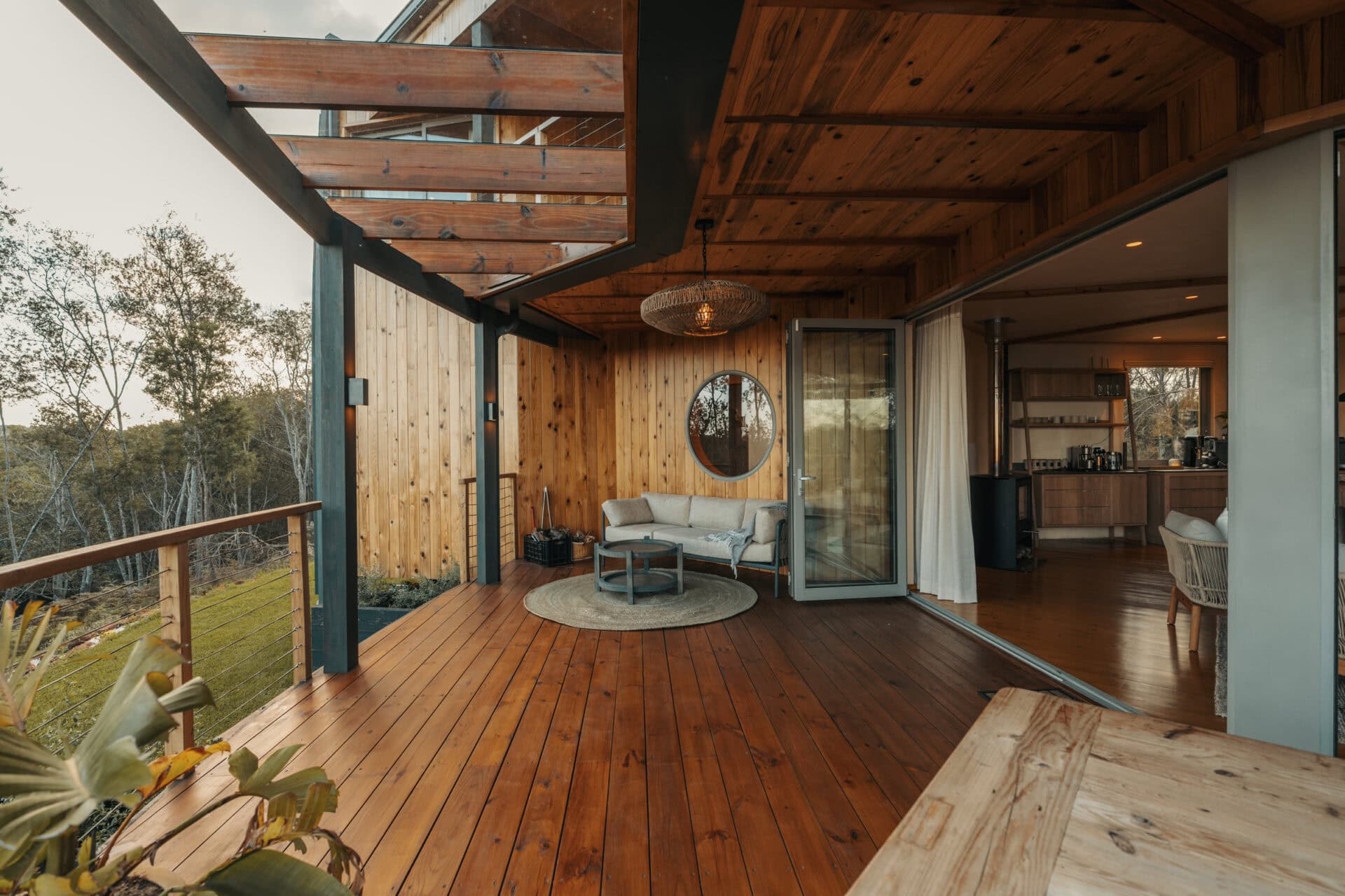 You’ll want to spend most of your time outside on the partially covered deck, taking in the forest views and listening to the sounds of nature. There’s a large dining table, a hammock, a couch, and a plunge pool for cooling off on warmer days. There’s also an upstairs deck with even better ocean views, along with an outdoor shower. Steps lead down to a fire pit, perfect for evenings under the stars.