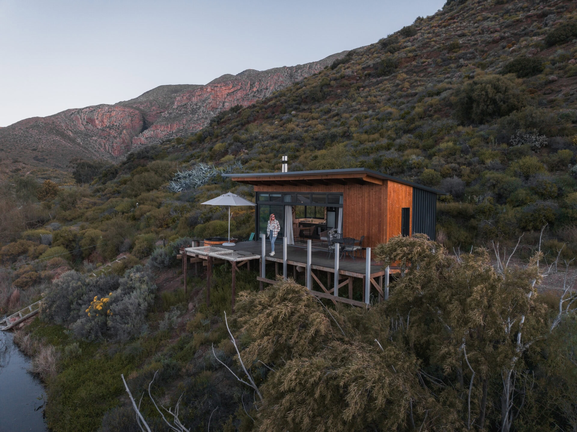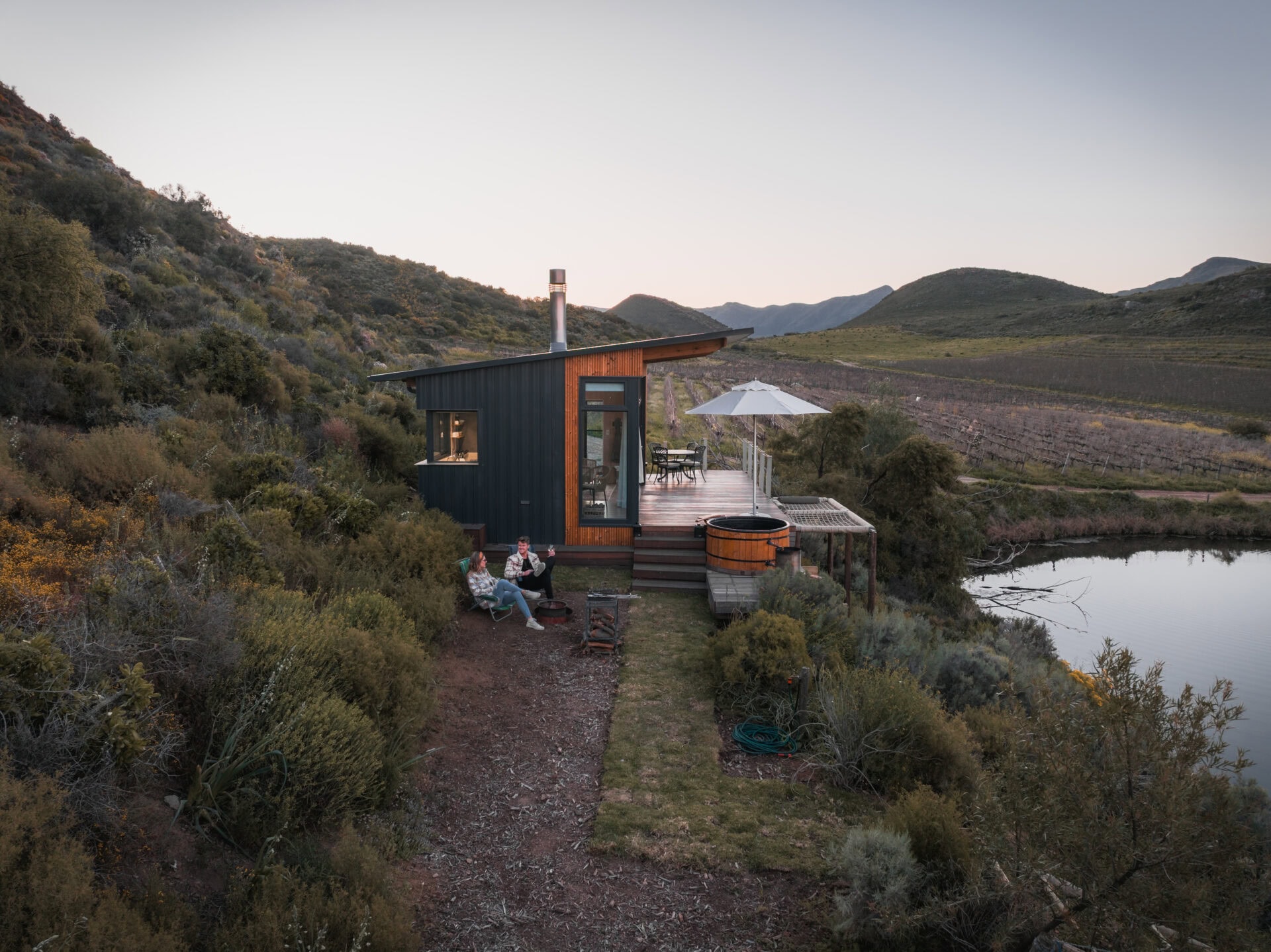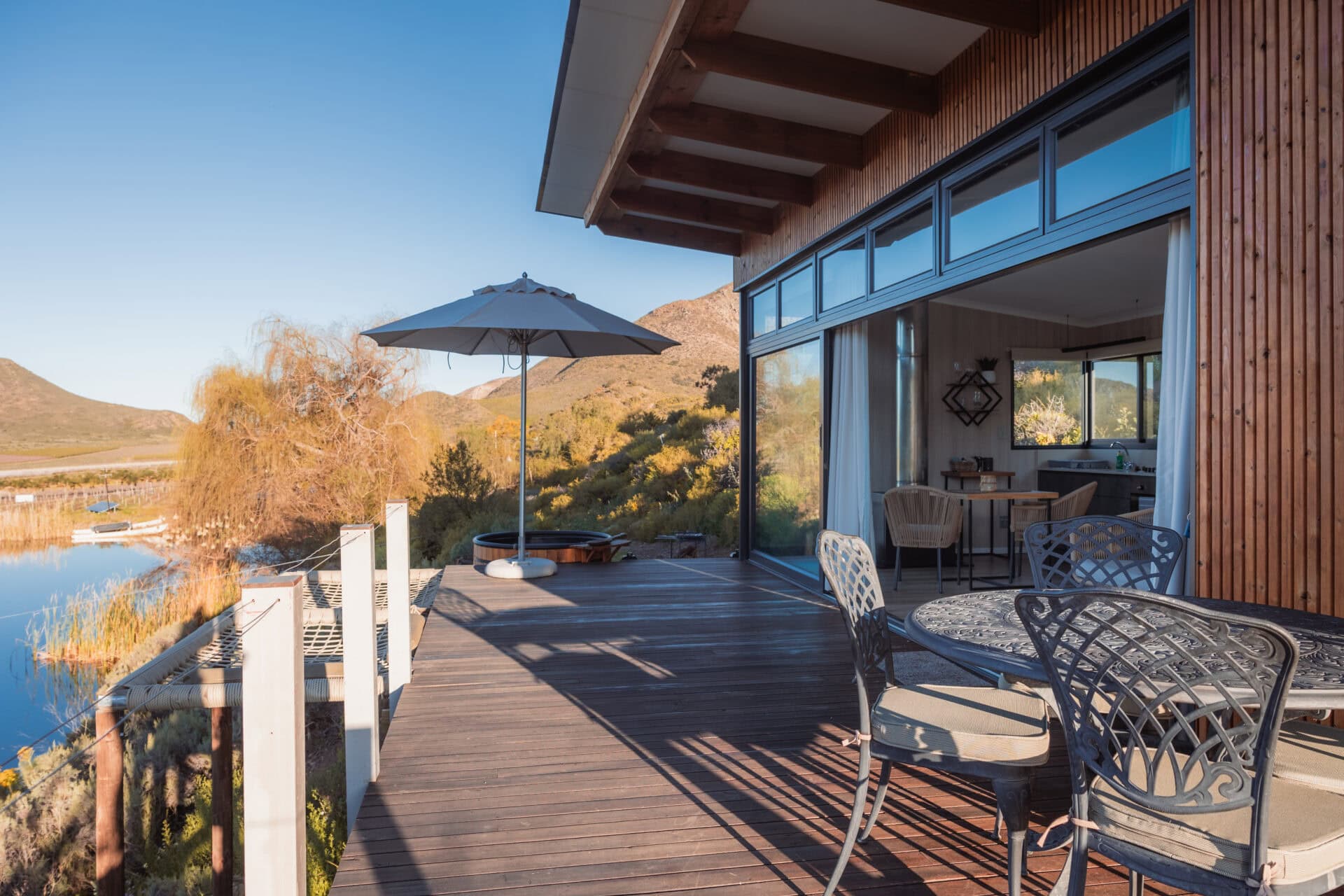 The outdoor deck features a wood-fired hot tub, double cargo nets (so you each have your own) suspended over the dam, an outdoor dining area, and a fire pit/braai area.