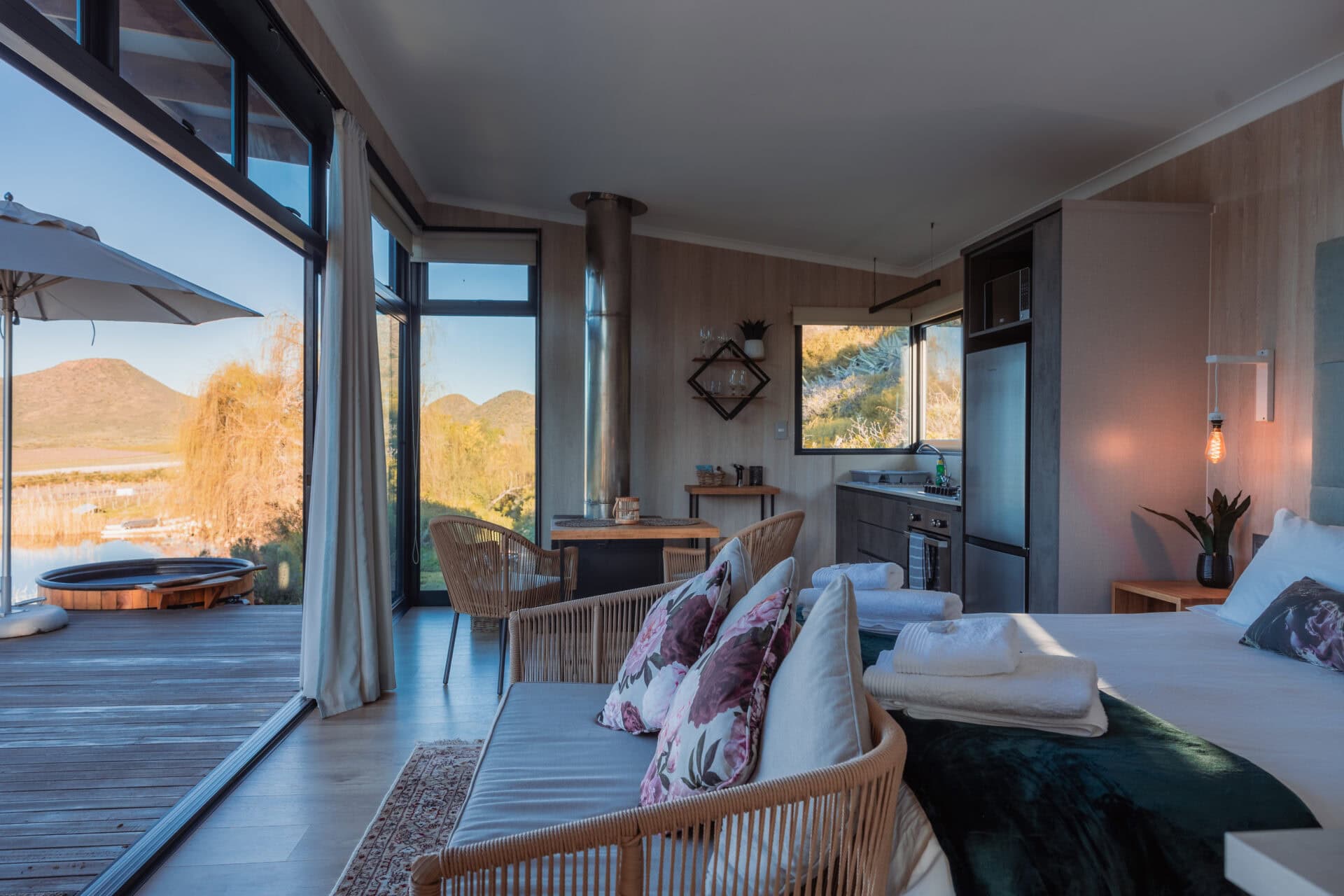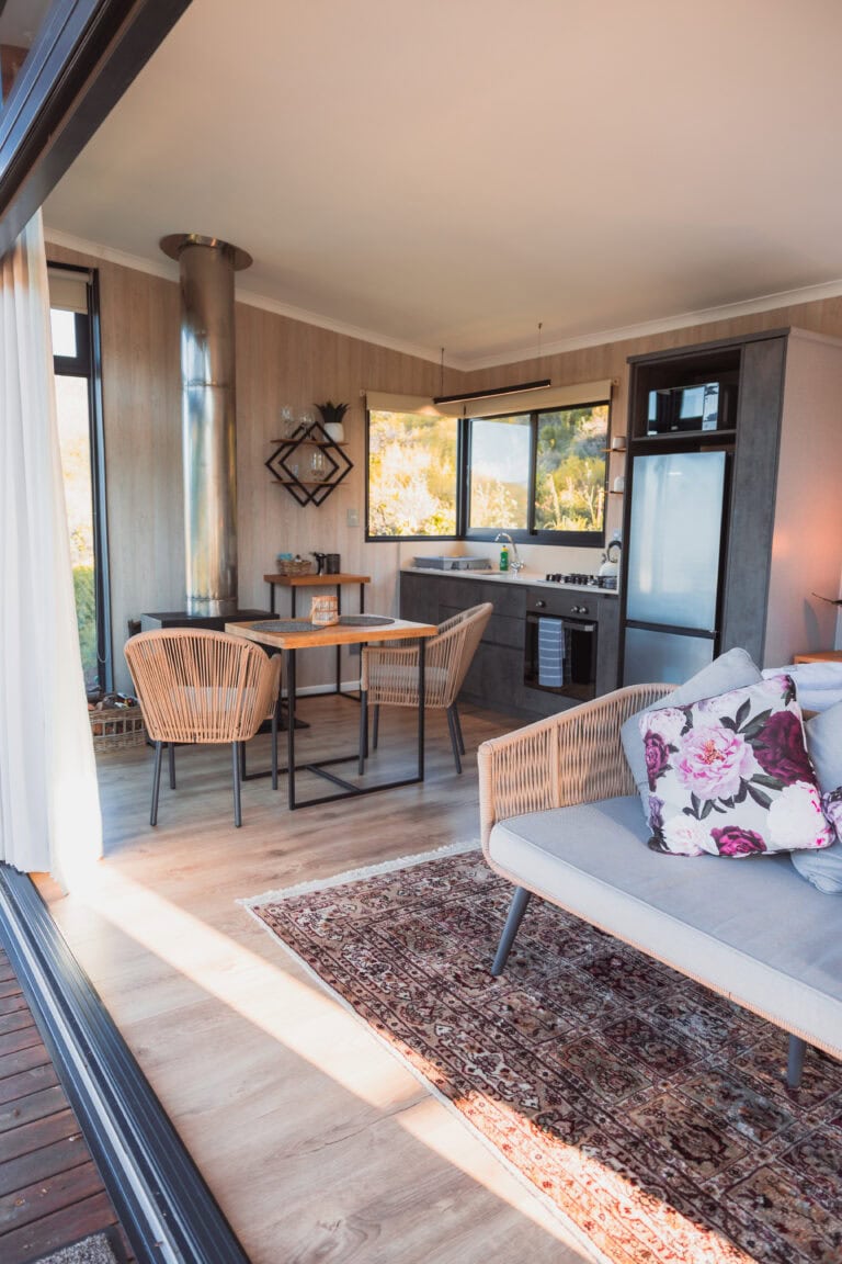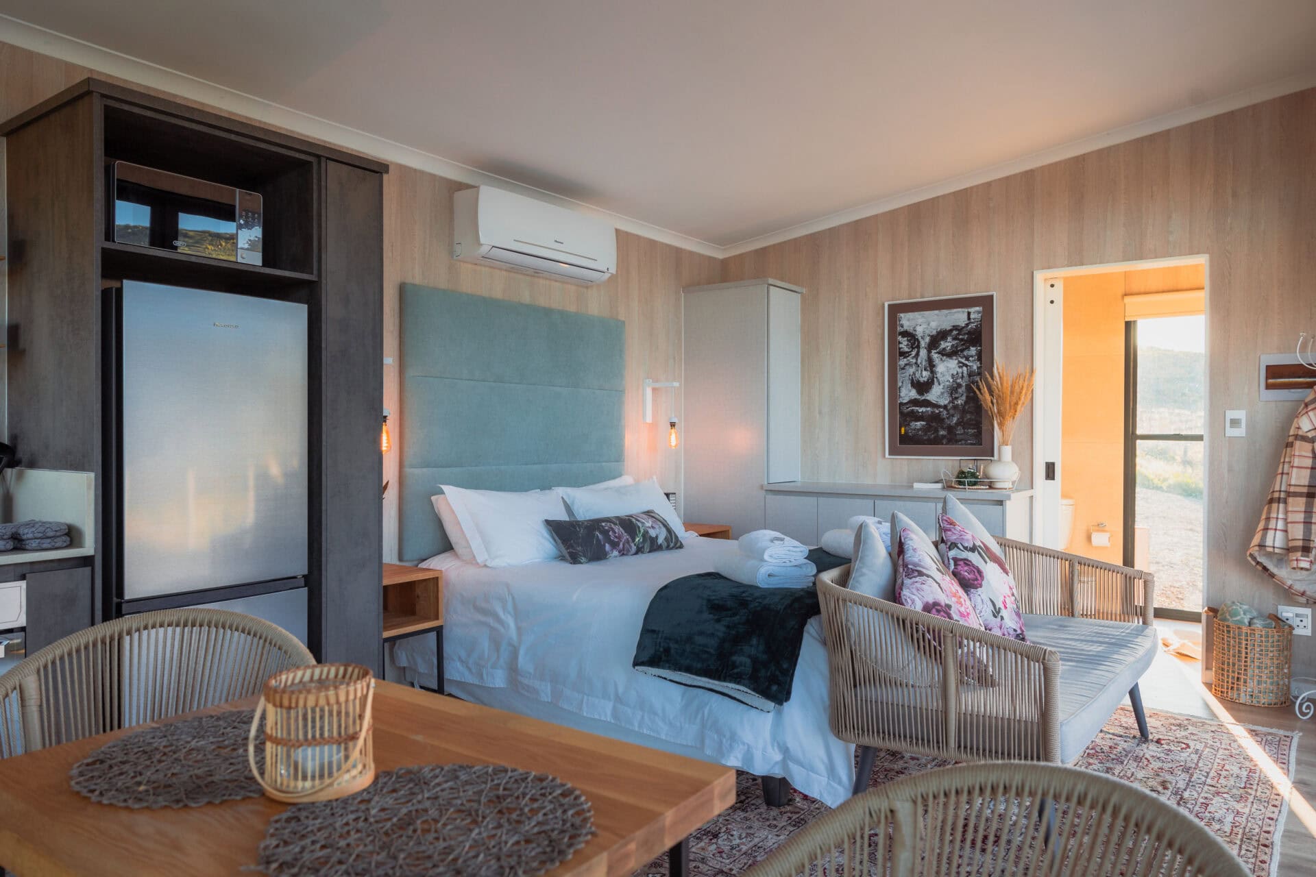 The bedroom opens onto the deck, offering stunning views of the mountains, orchards, and dam. The queen-sized bed comes with luxurious linen and electric blankets for winter. There’s also an aircon for those hot summer nights and ample cupboard/storage space.