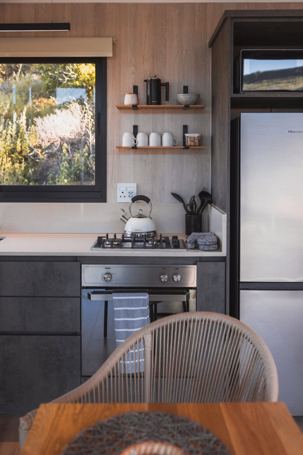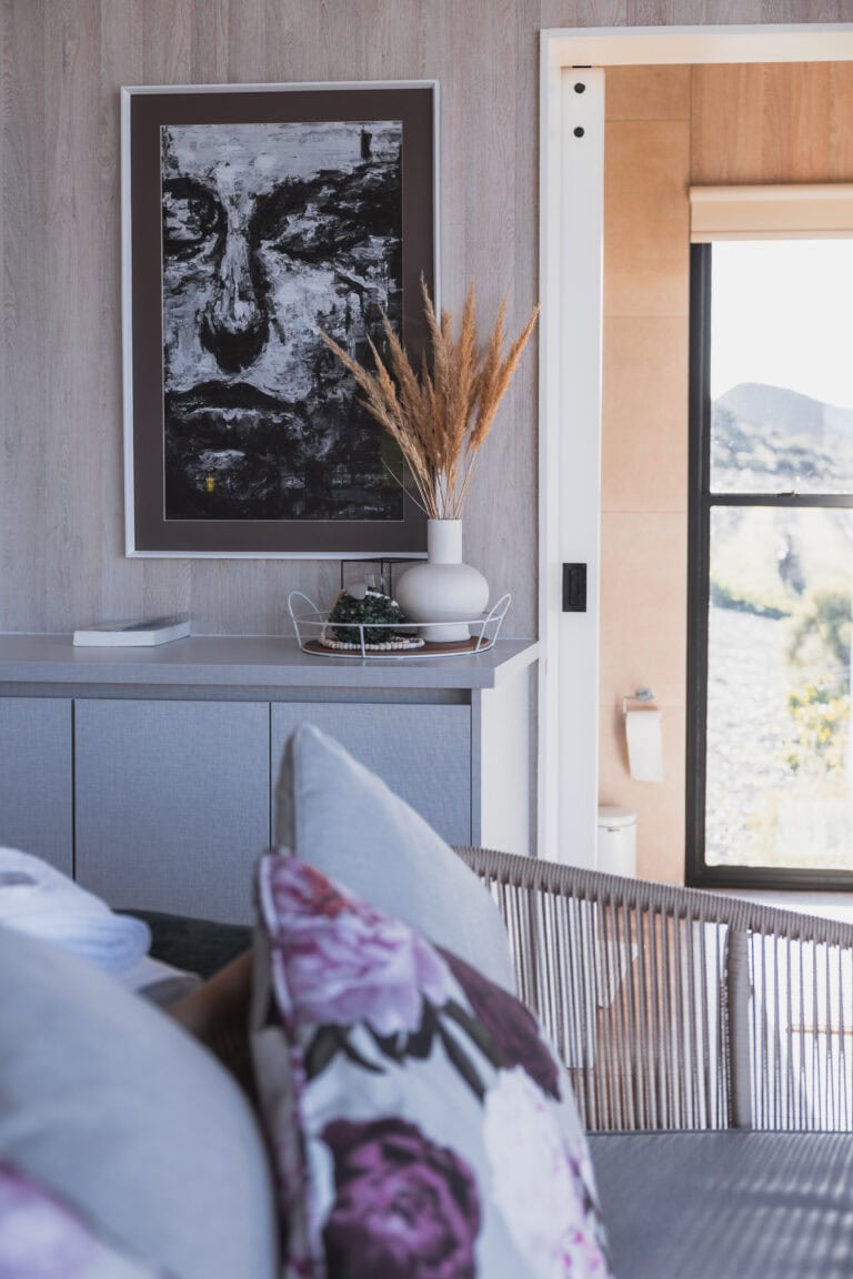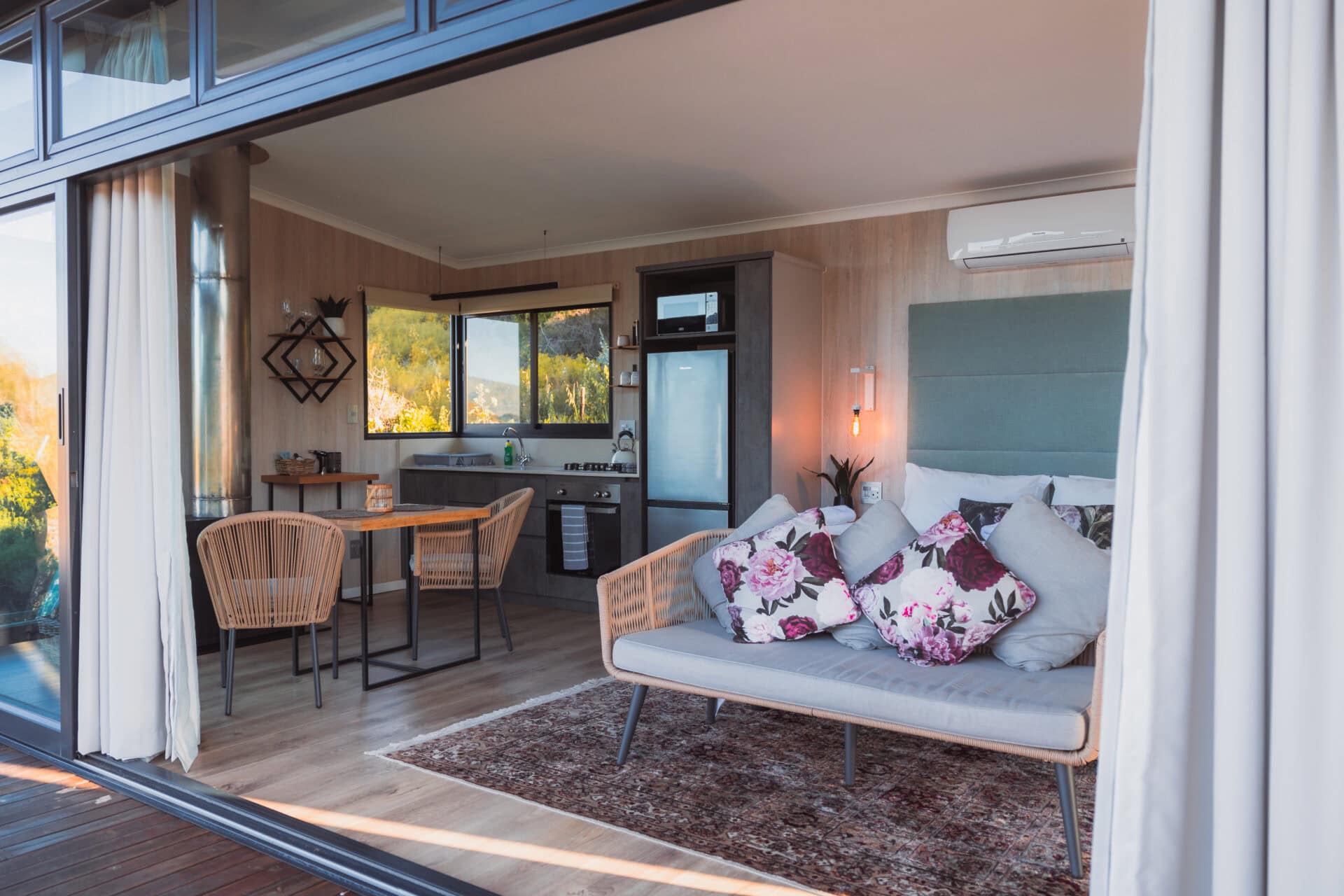 The bedroom opens onto the deck, offering stunning views of the mountains, orchards, and dam. The queen-sized bed comes with luxurious linen and electric blankets for winter. There’s also an aircon for those hot summer nights and ample cupboard/storage space.