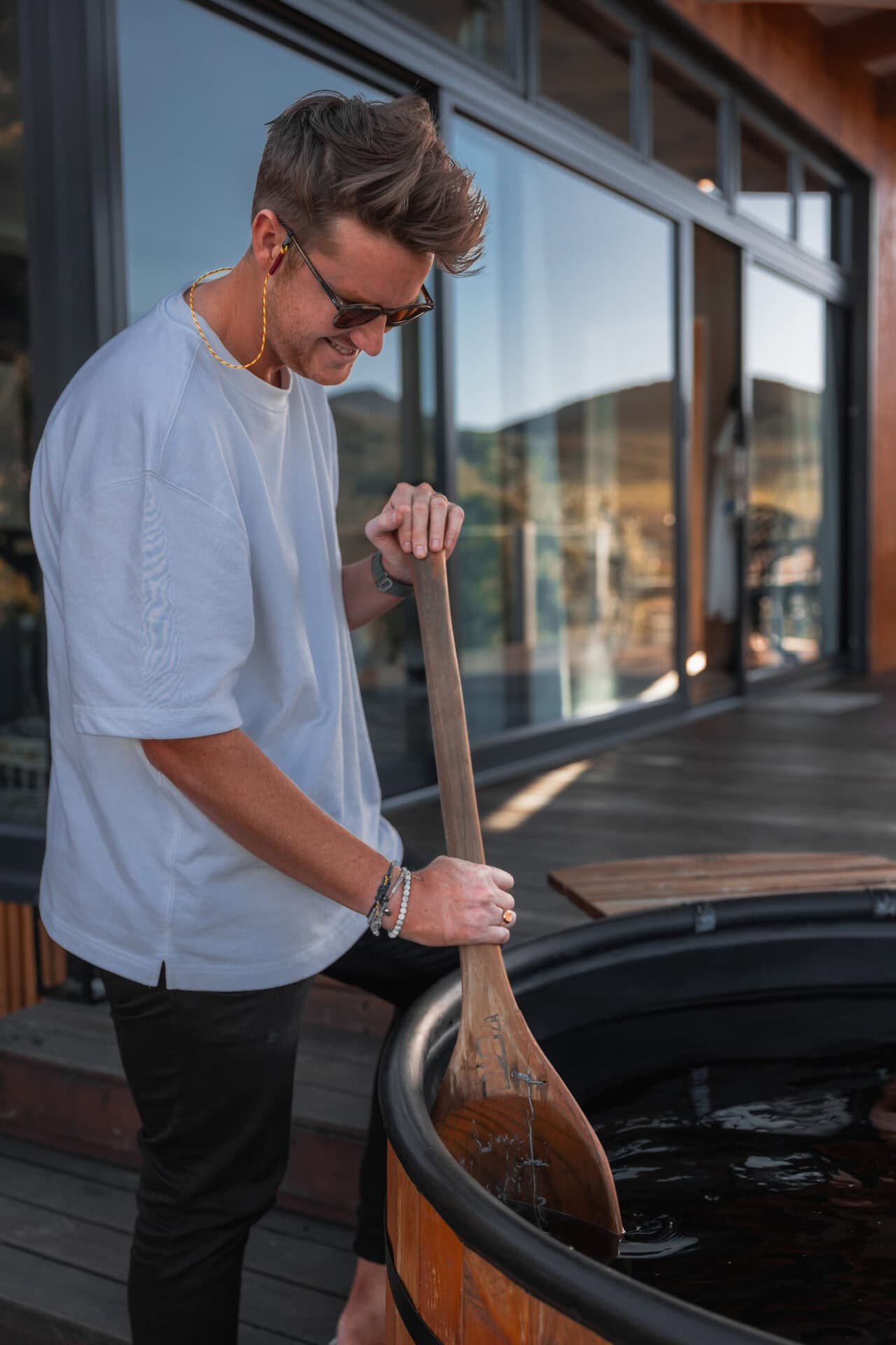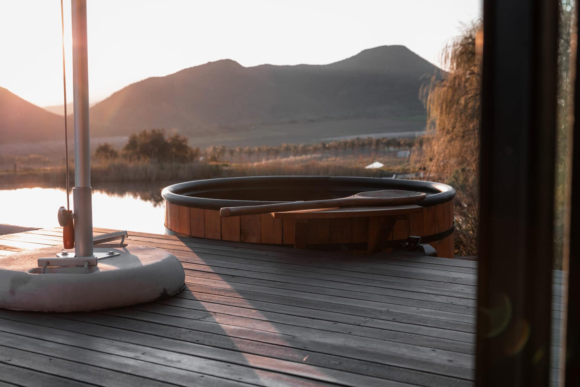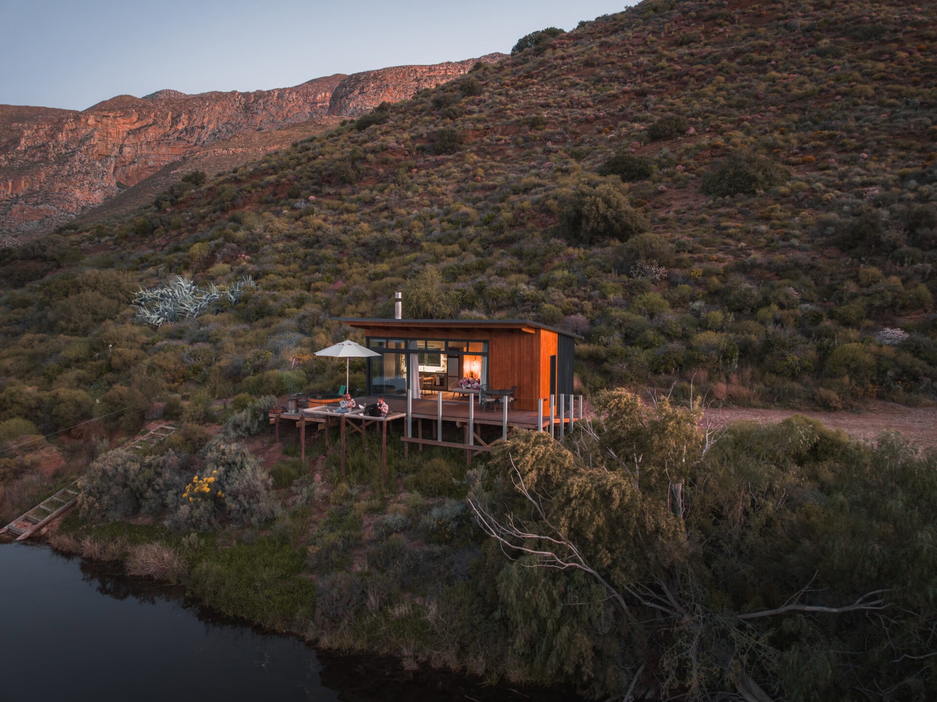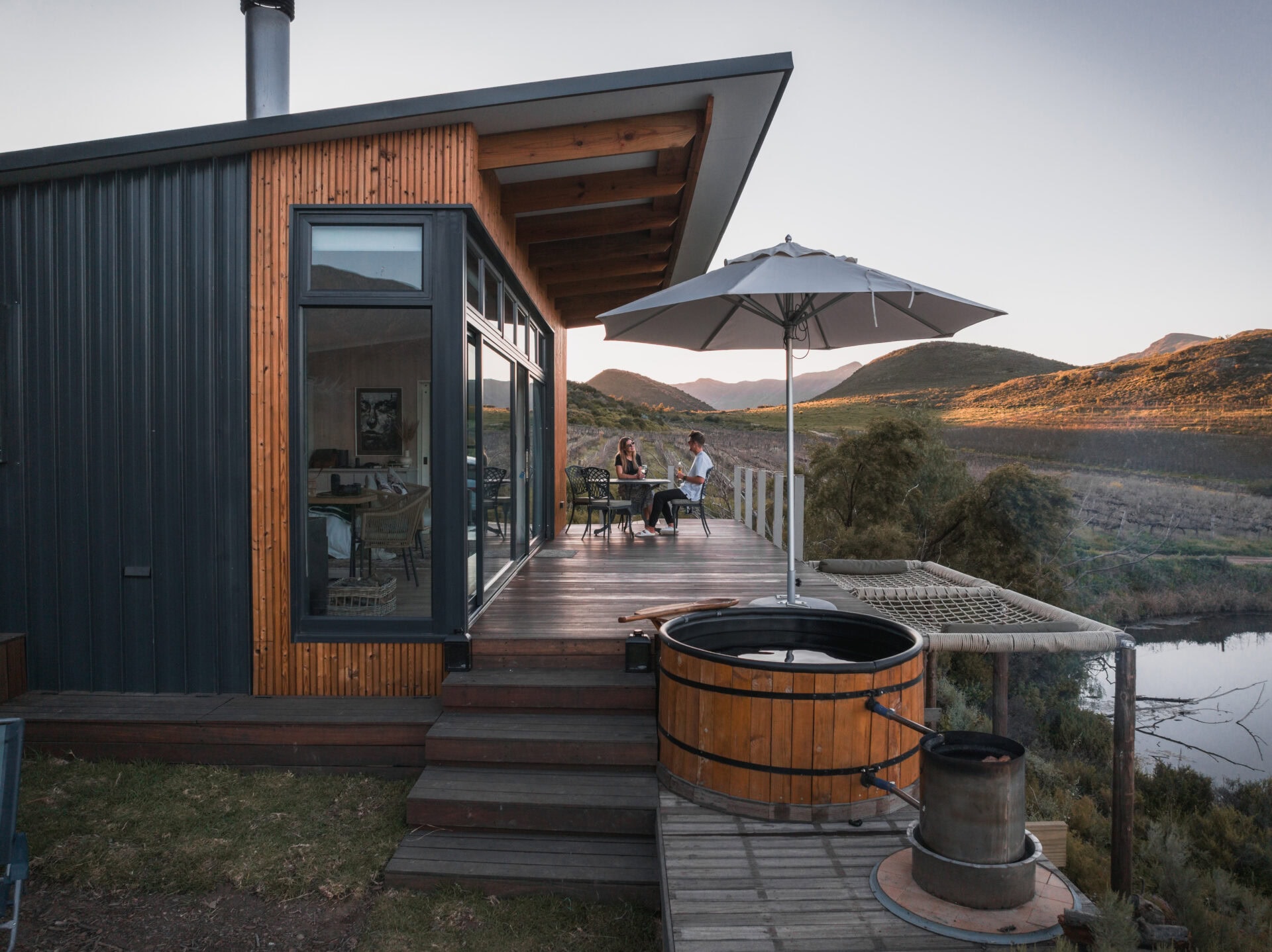 The outdoor deck features a wood-fired hot tub, double cargo nets (so you each have your own) suspended over the dam, an outdoor dining area, and a fire pit/braai area.