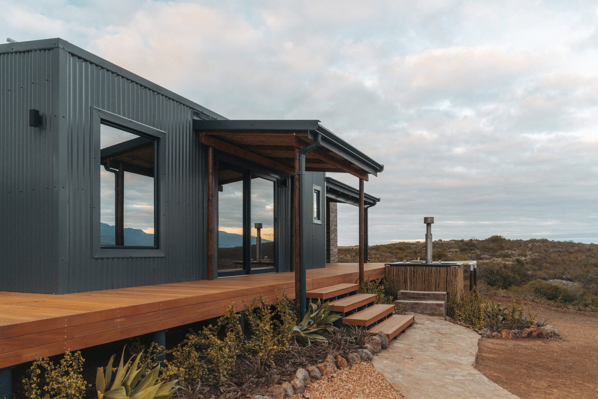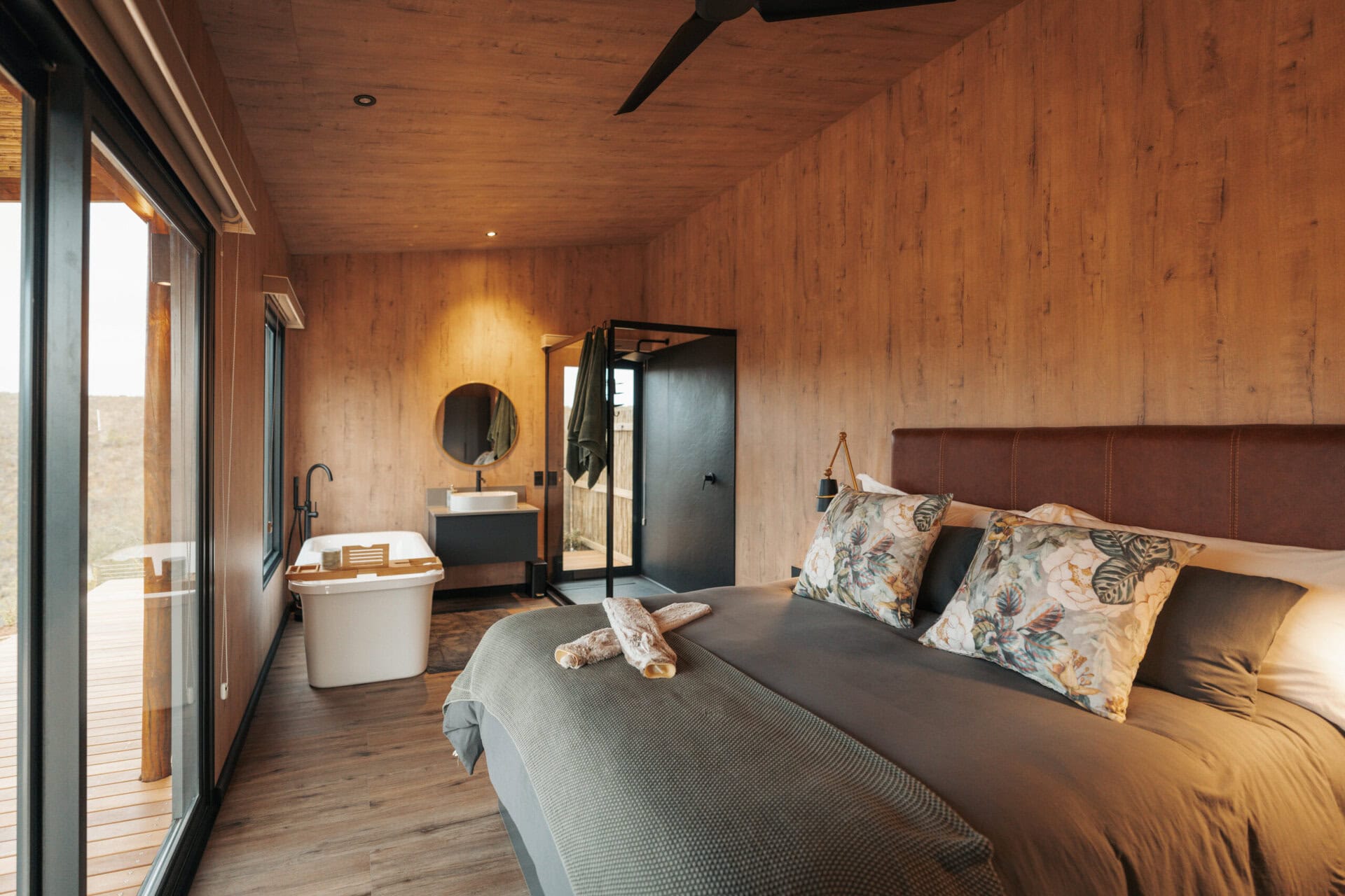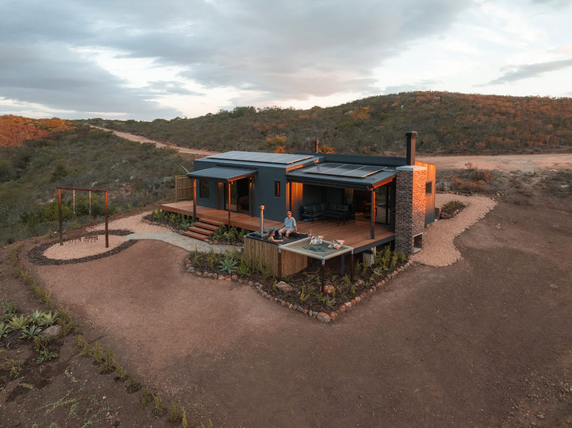 The living space opens out onto a spacious deck with an outdoor lounge area and built in braai. There is also a wood-fired hot tub, cargo nets, and even an outdoor shower! Steps lead down to two bucket swings which look out over the rolling hills.