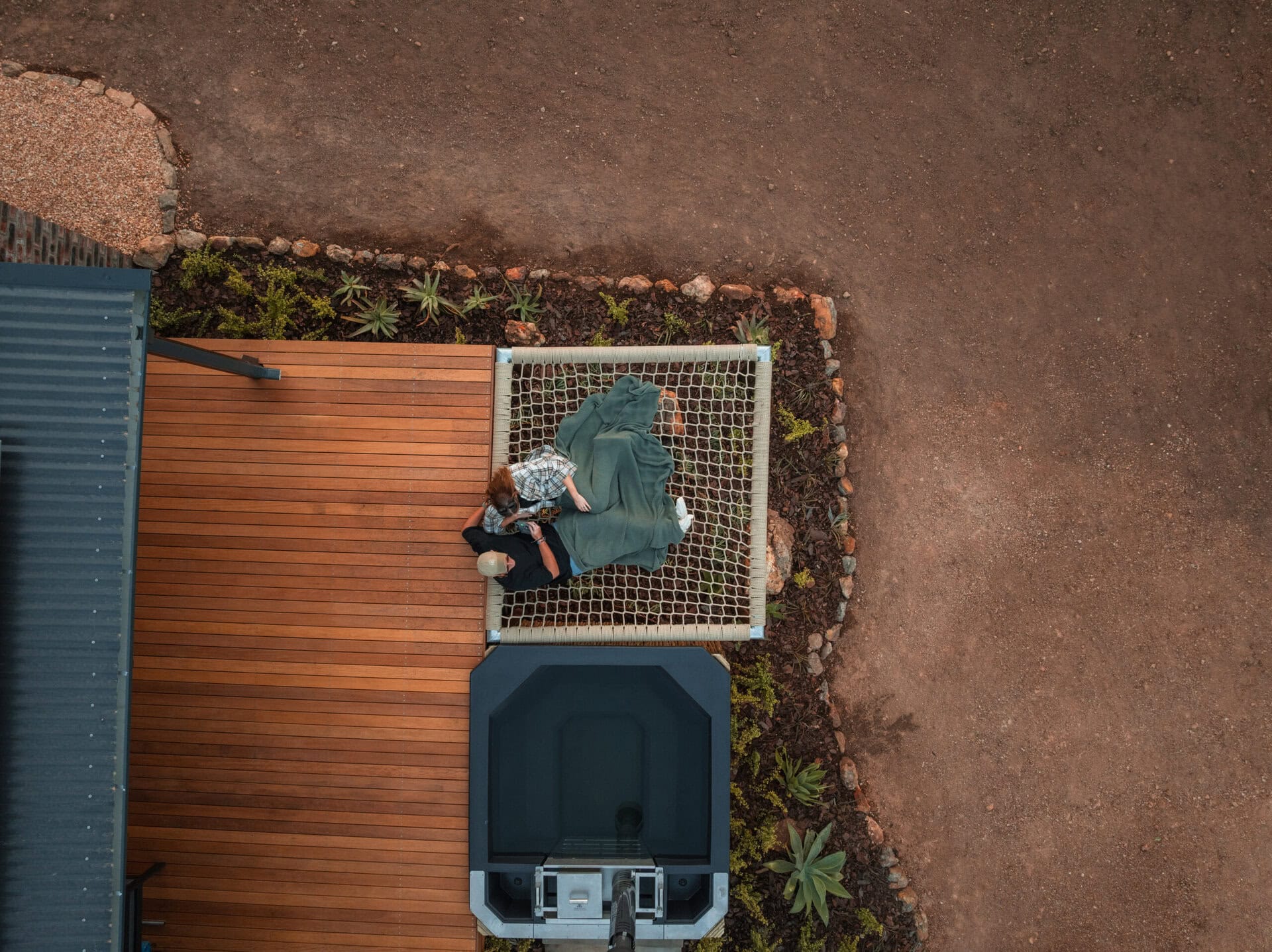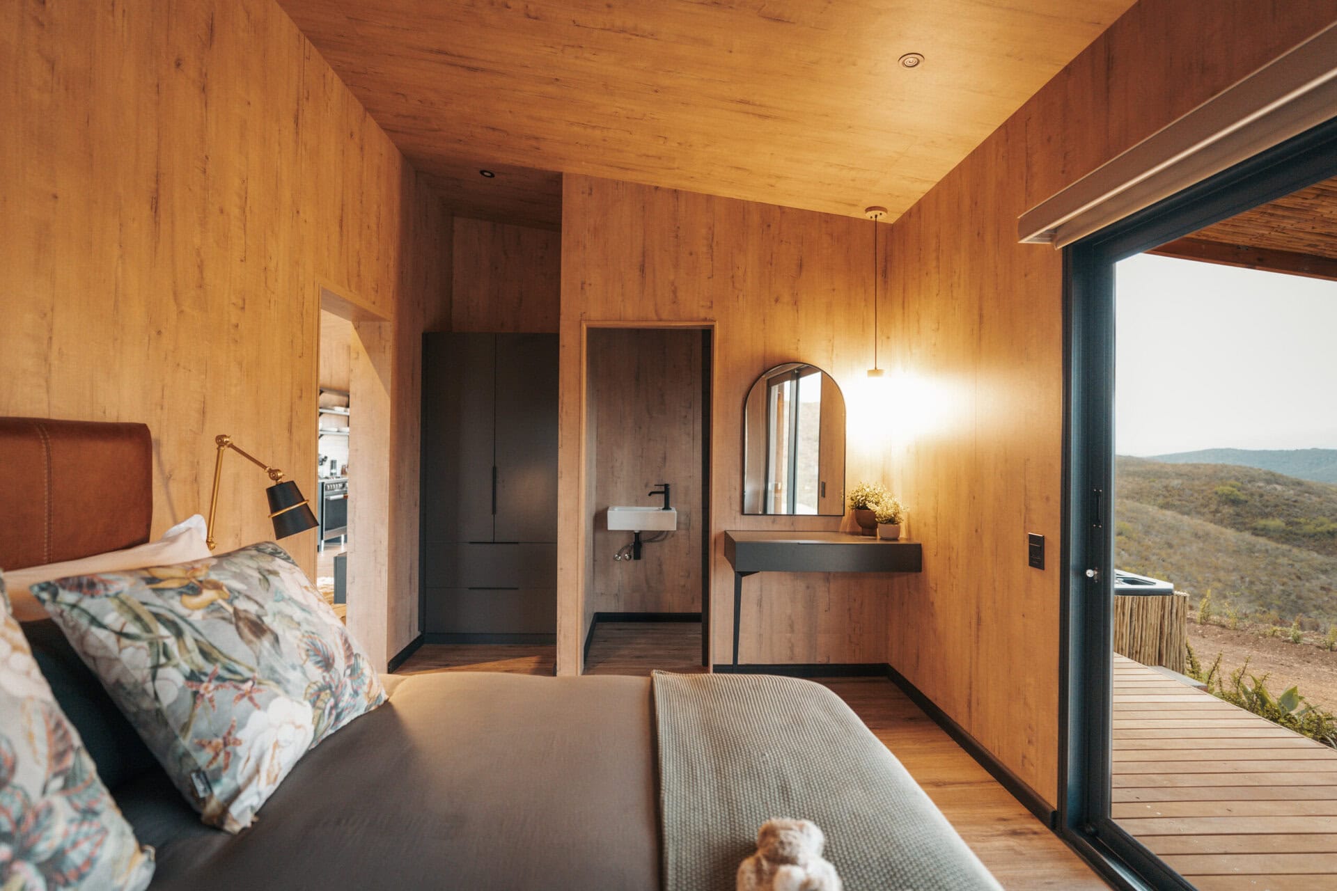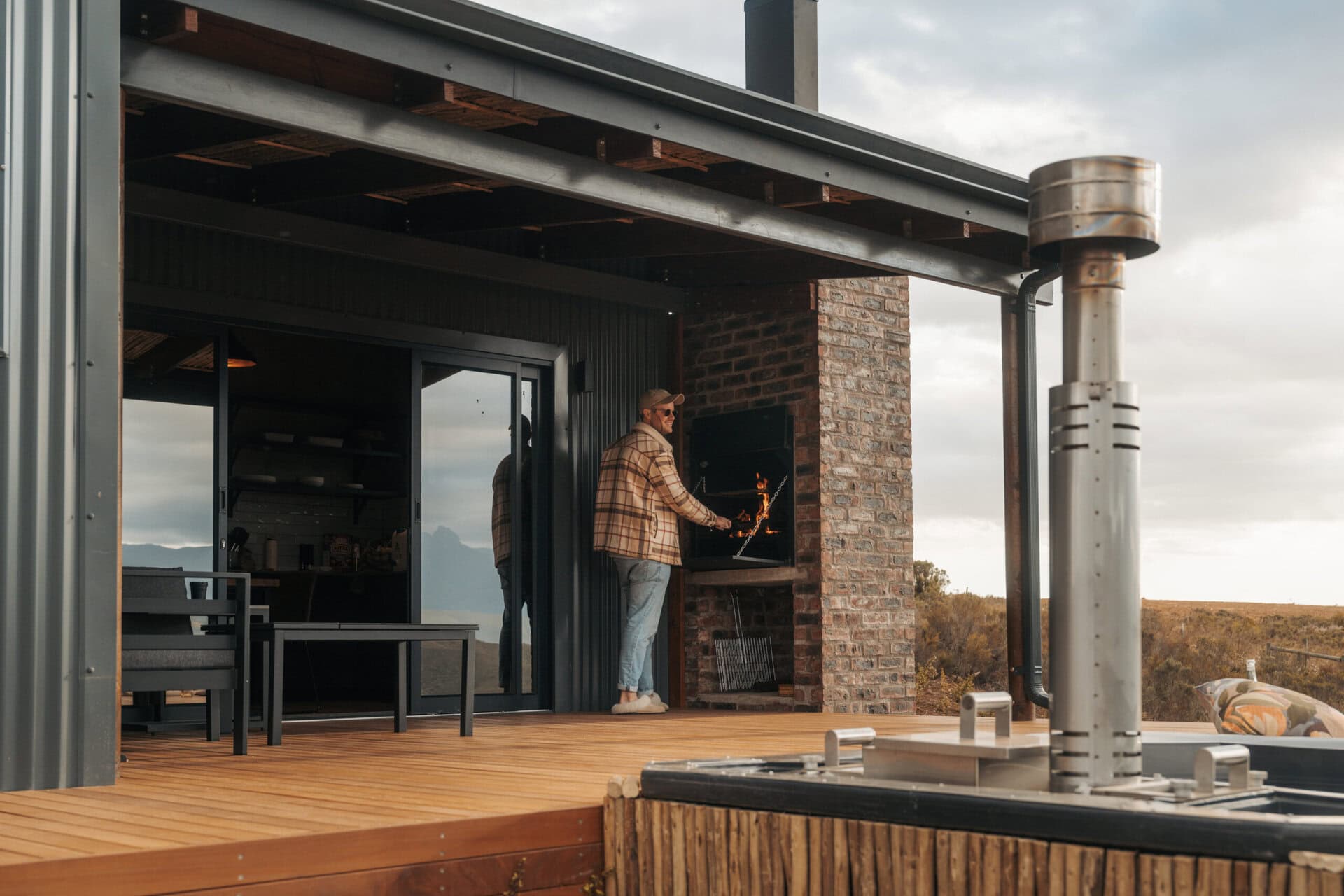 The living space opens out onto a spacious deck with an outdoor lounge area and built in braai. There is also a wood-fired hot tub, cargo nets, and even an outdoor shower! Steps lead down to two bucket swings which look out over the rolling hills.