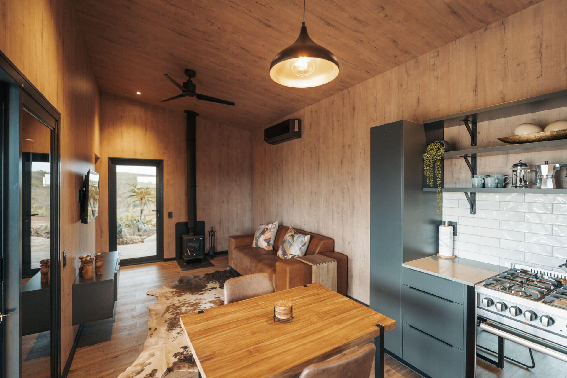 There’s a small dining table, a beautiful leather couch, indoor fireplace, aircon and a Smart TV so you can log into your Netflix account etc. It’s the perfect space to relax, whether it’s cozy nights by the fire or lazy afternoons watching your favourite series.