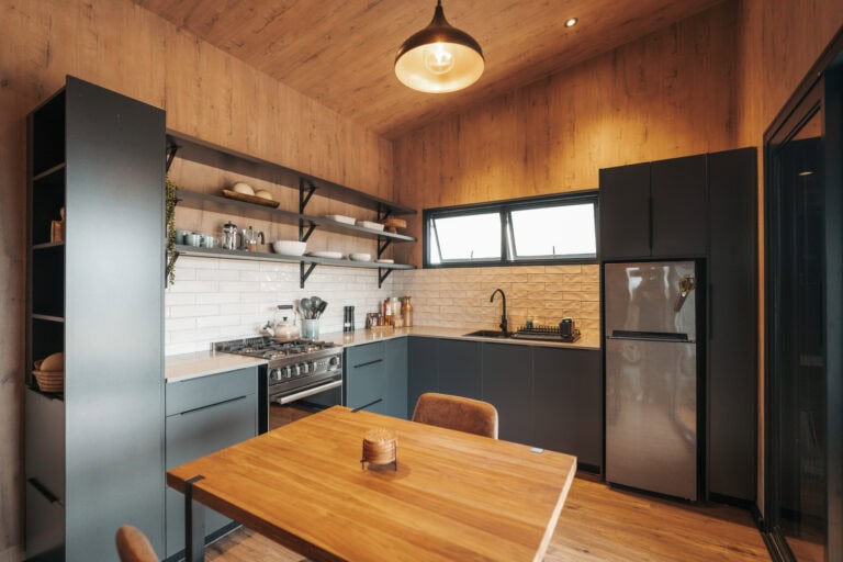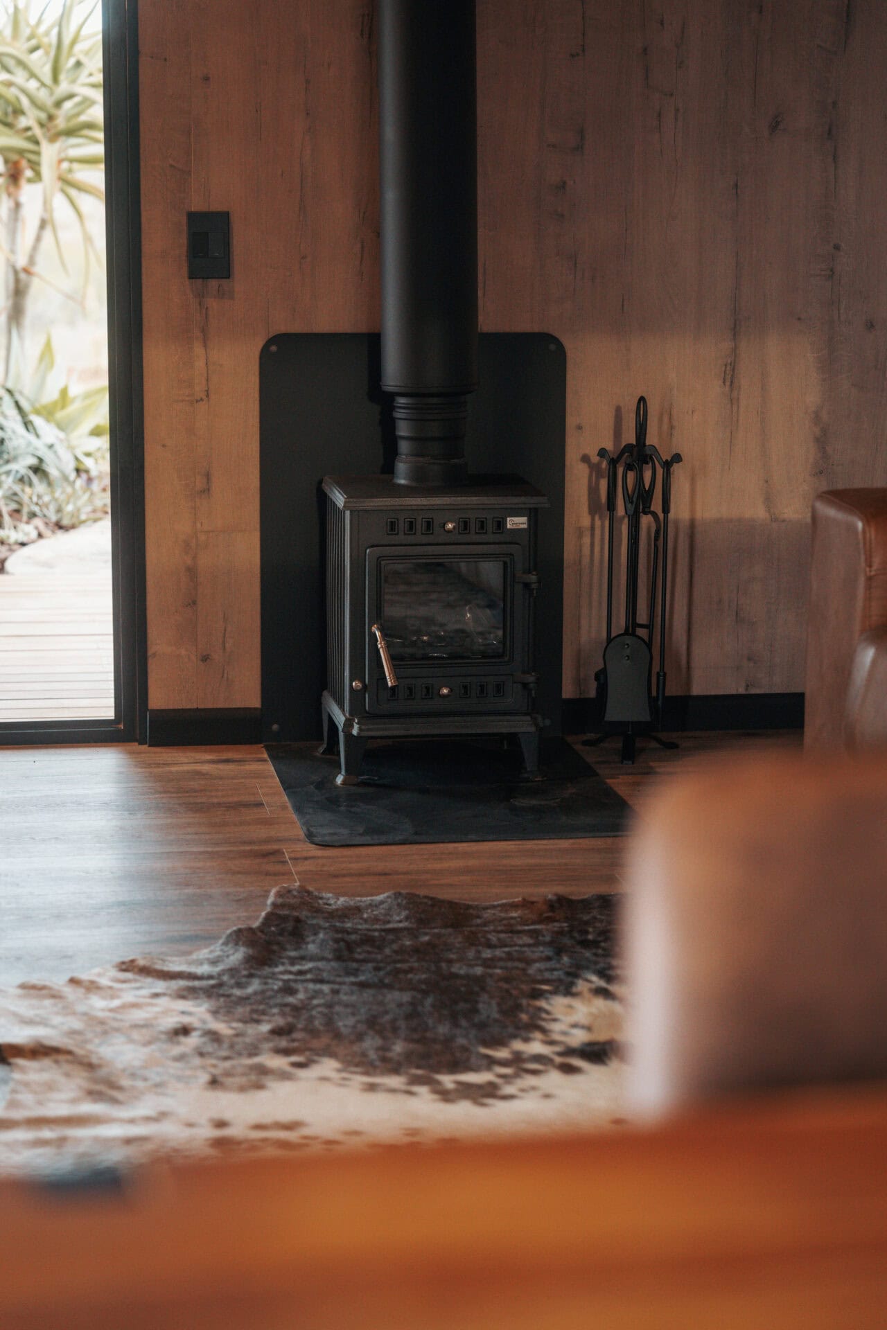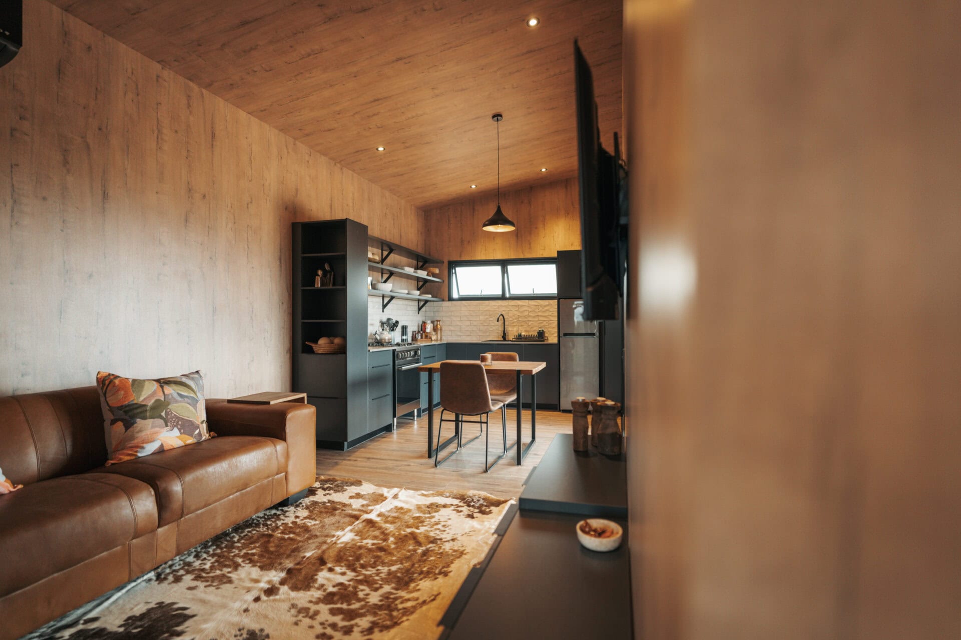 There’s a small dining table, a beautiful leather couch, indoor fireplace, aircon and a Smart TV so you can log into your Netflix account etc. It’s the perfect space to relax, whether it’s cozy nights by the fire or lazy afternoons watching your favourite series.