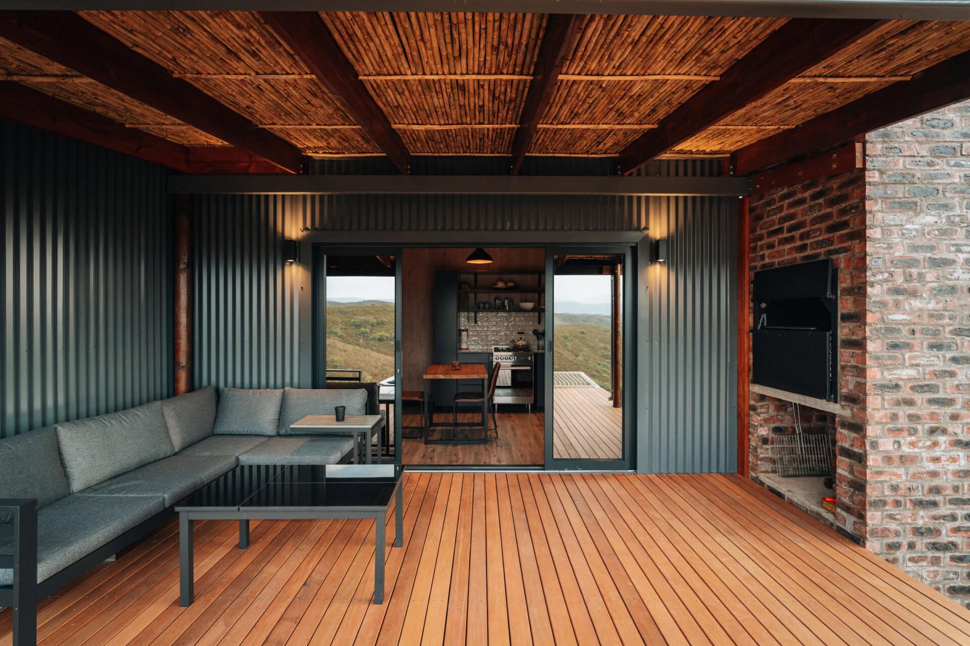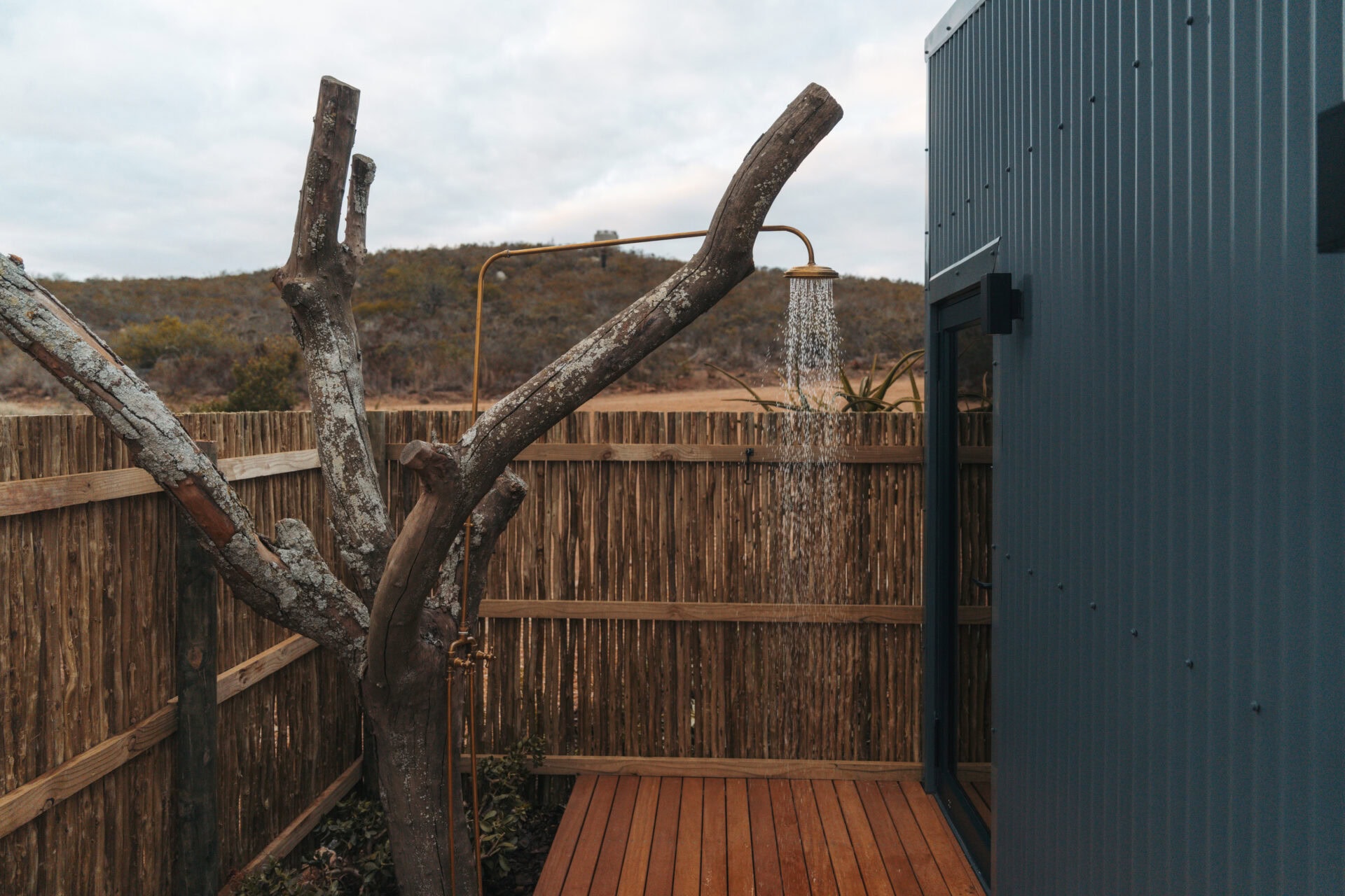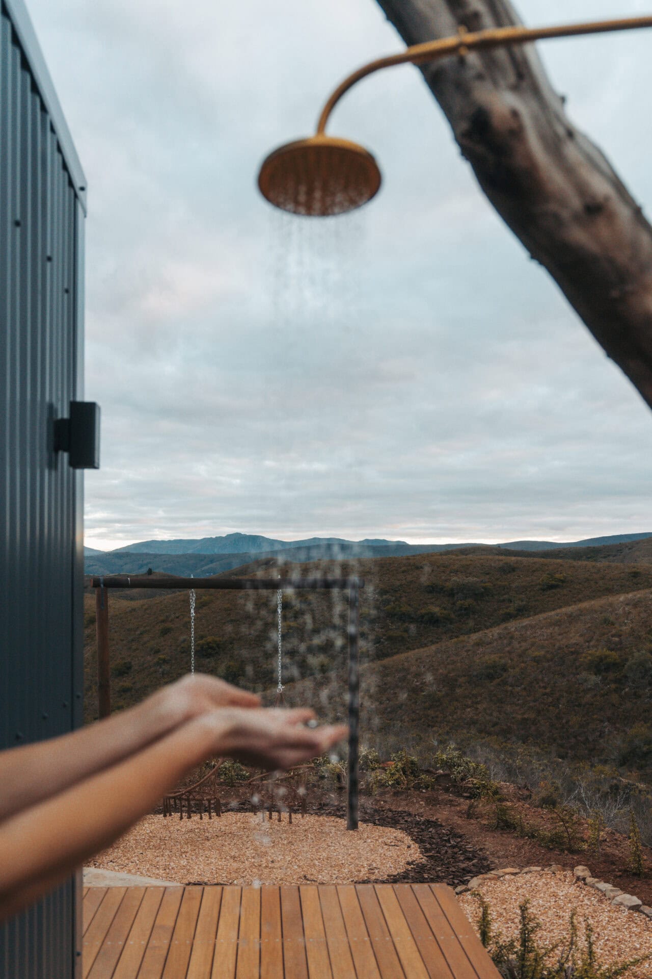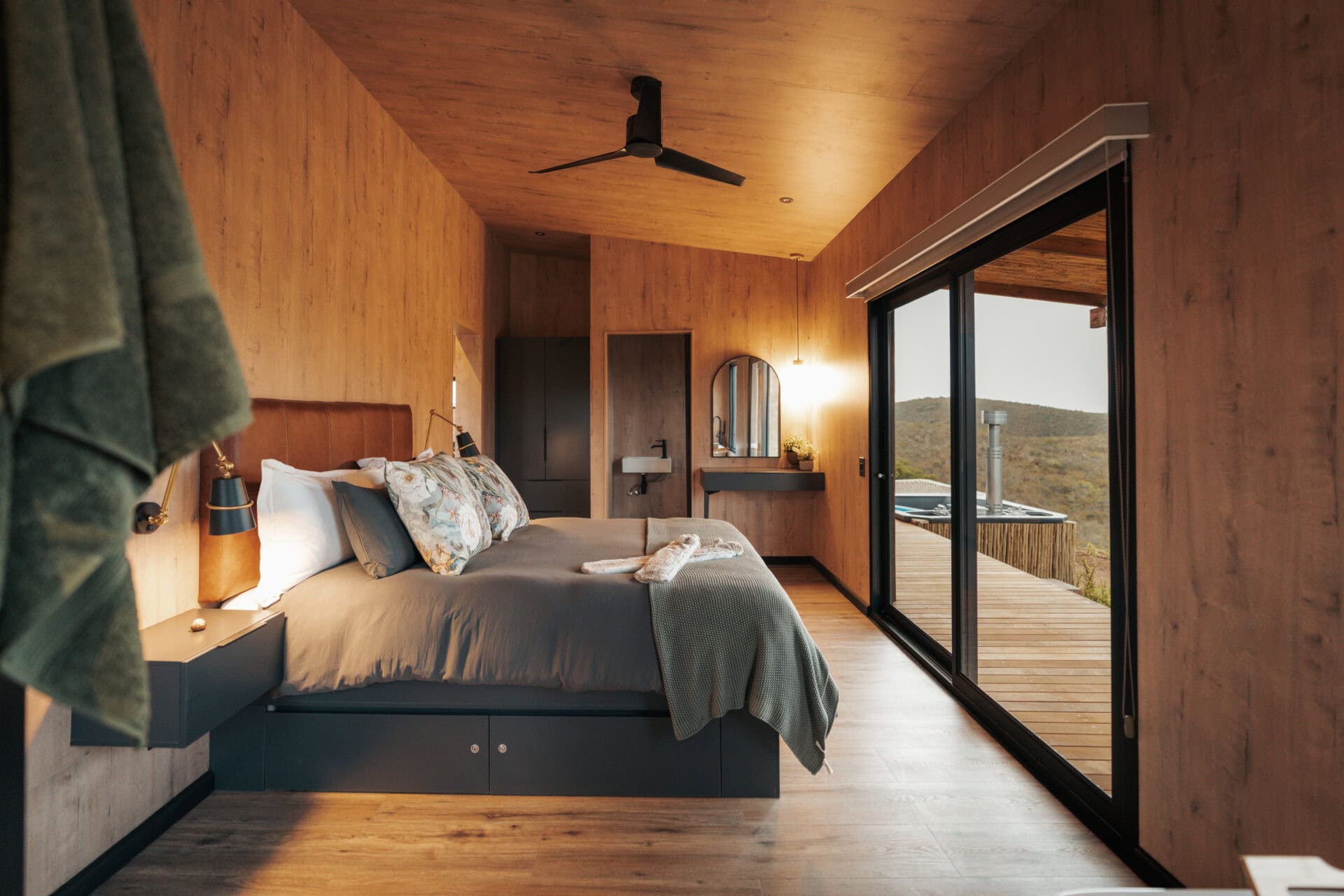 The living space opens out onto a spacious deck with an outdoor lounge area and built in braai. There is also a wood-fired hot tub, cargo nets, and even an outdoor shower! Steps lead down to two bucket swings which look out over the rolling hills.