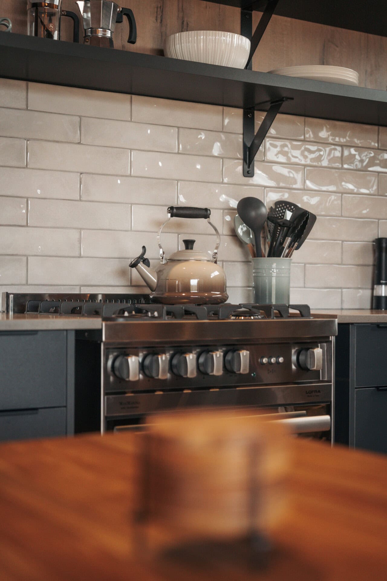 The kitchenette is fully equipped with a gas oven and stove, a whistling kettle, and a medium fridge-freezer. Instant coffee, tea, sugar, rusks, olive oil, basic spices, and salt & pepper are provided.