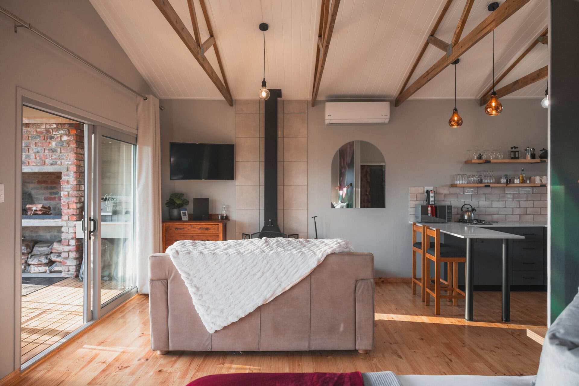 There’s a large leather couch positioned in front of the fireplace with a flat screen TV. You can choose to dine indoors at the kitchen counter or outdoors on the wooden deck. There is also an aircon for summer.