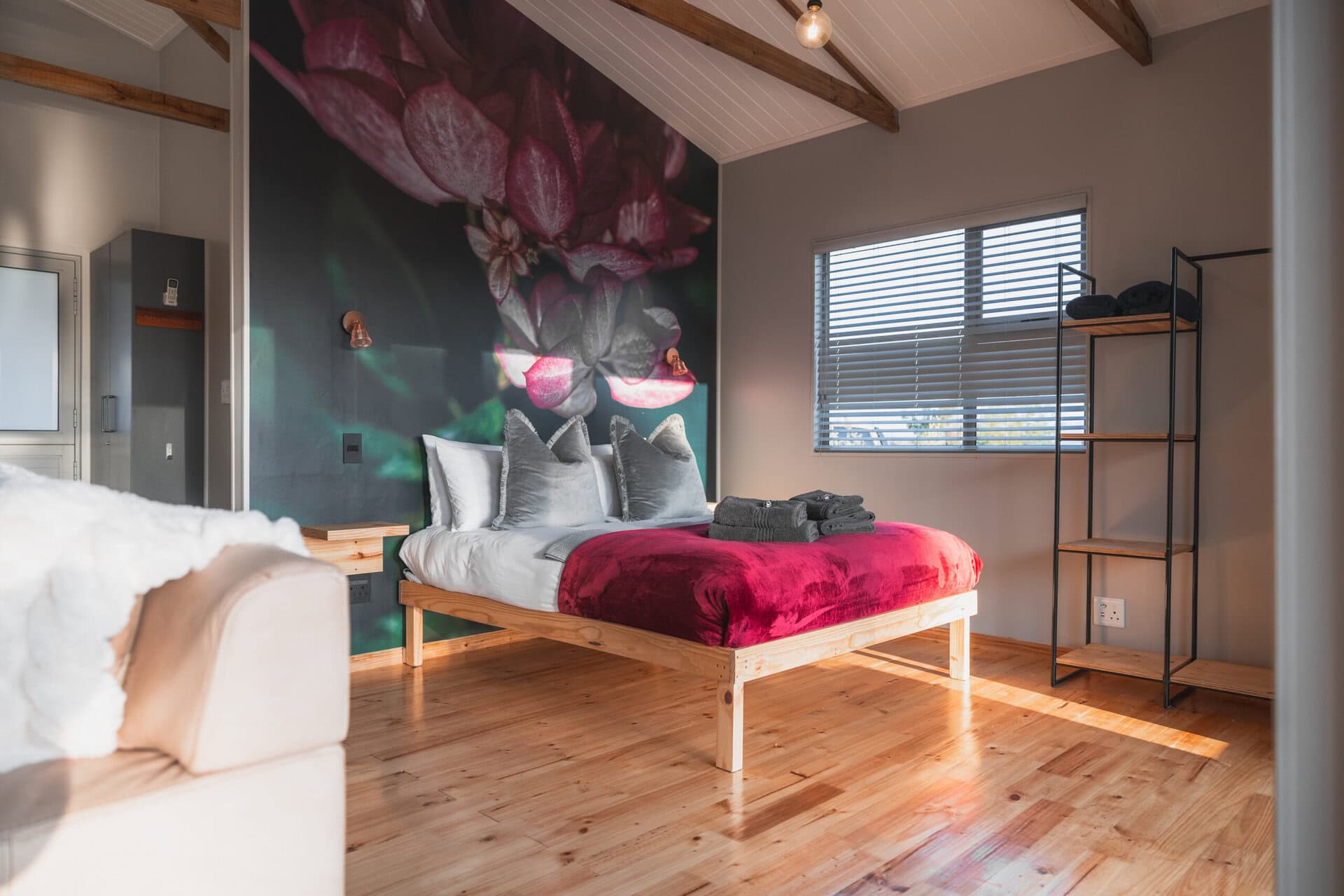 The bedroom features a queen sized bed set against a stunning floral wallpaper backdrop. There are extra blankets for winter, electric blankets and a clothing rail/shelves for storage.
