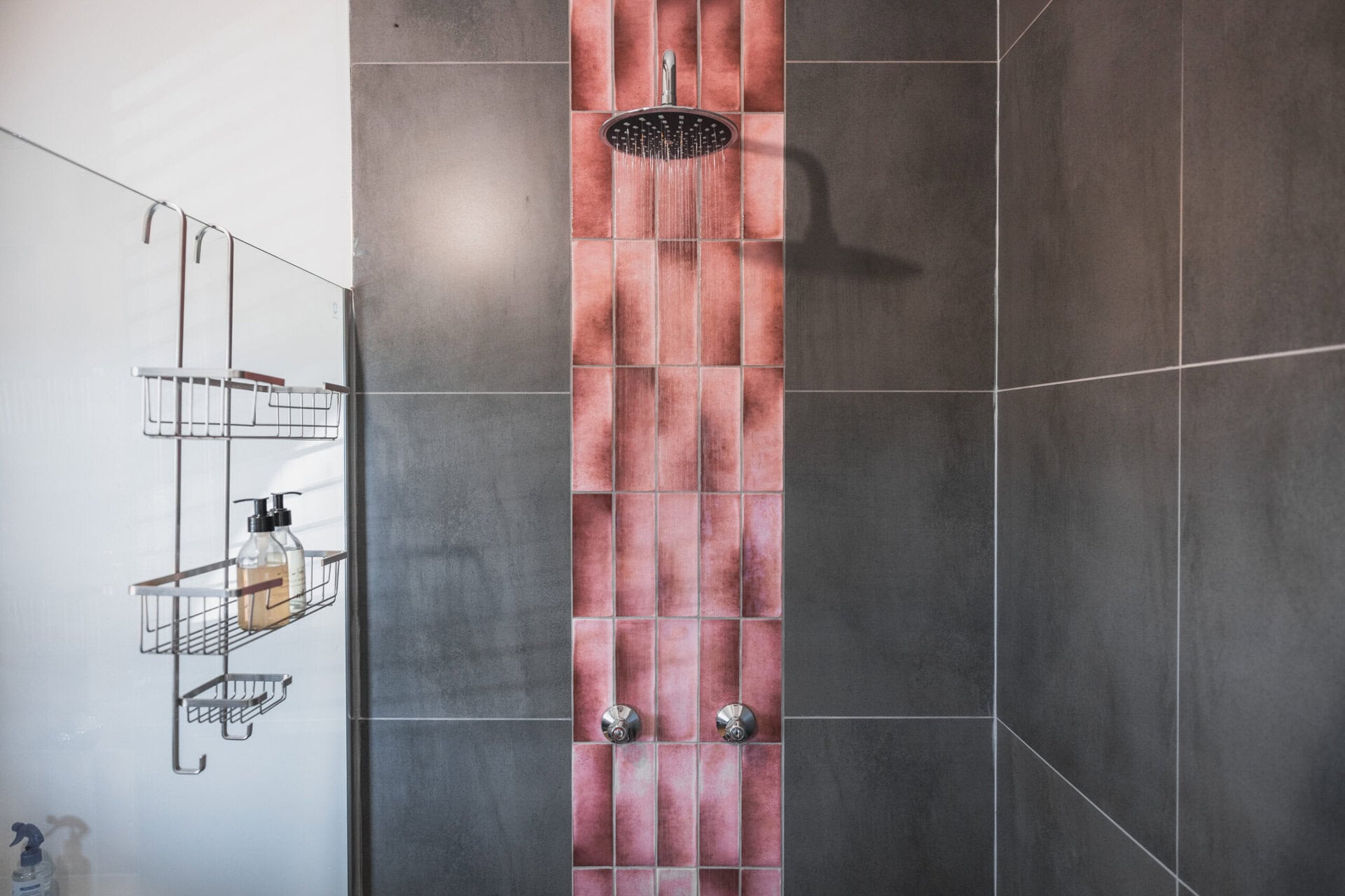 The pink and grey themed bathroom features a large shower. There is also an outdoor shower if you want to shower outside with views of the farm and sometimes horses in the distance. Steps will lead you down to the Hoopoe Hideout – a large bath surrounded by trees and birds chirping.