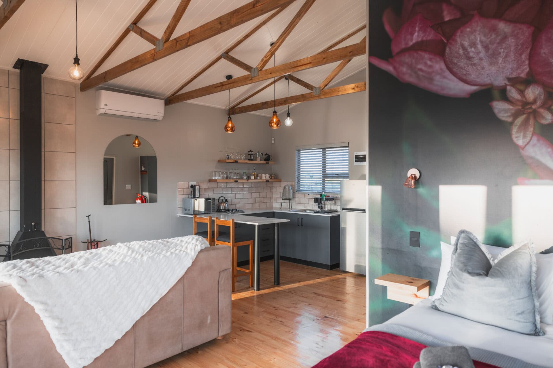 There’s a large leather couch positioned in front of the fireplace with a flat screen TV. You can choose to dine indoors at the kitchen counter or outdoors on the wooden deck. There is also an aircon for summer.