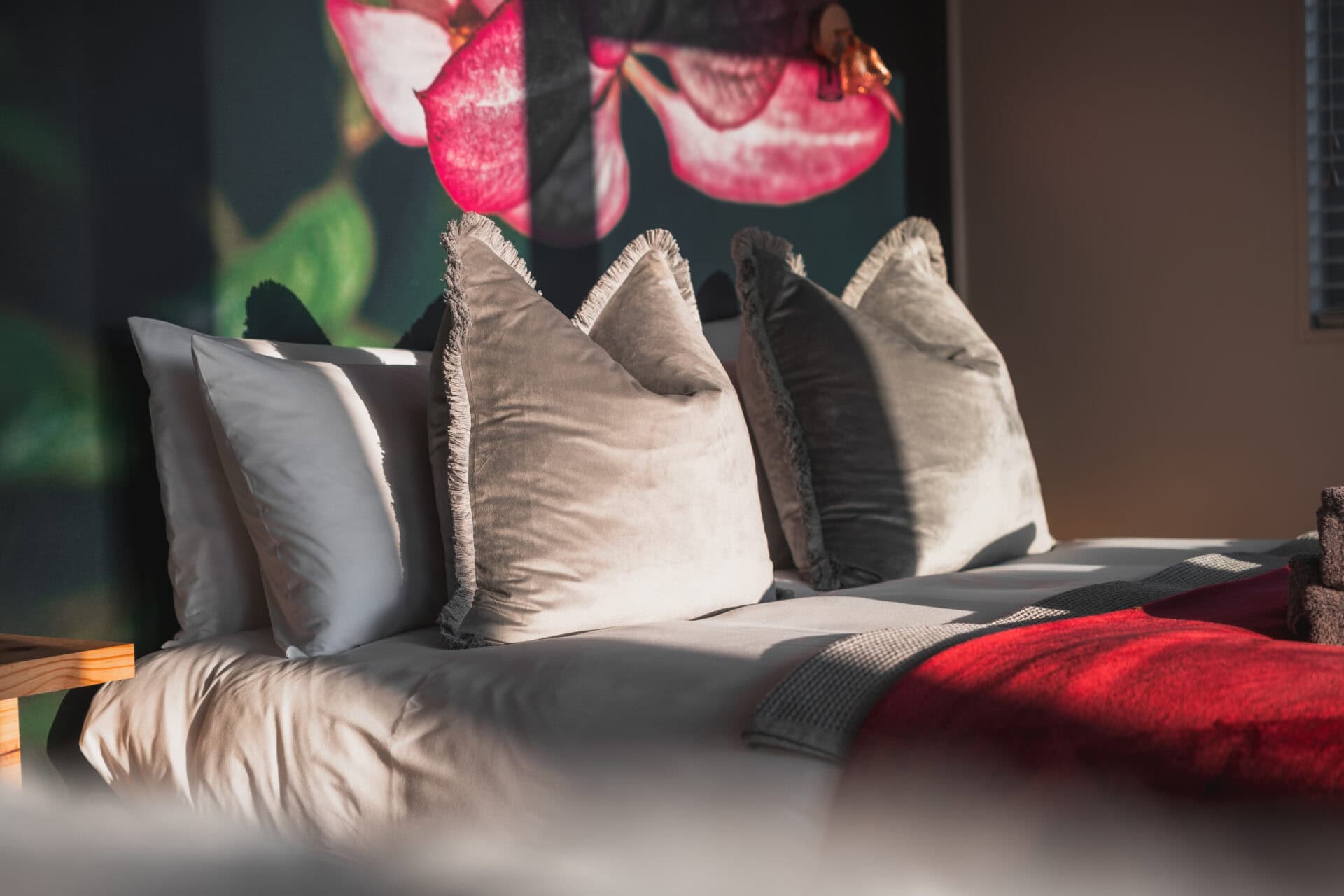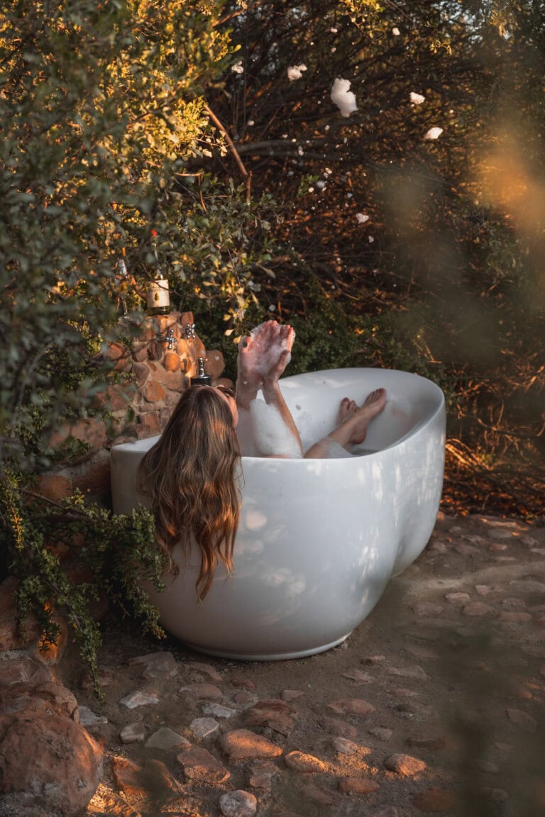 The pink and grey themed bathroom features a large shower. There is also an outdoor shower if you want to shower outside with views of the farm and sometimes horses in the distance. Steps will lead you down to the Hoopoe Hideout – a large bath surrounded by trees and birds chirping.