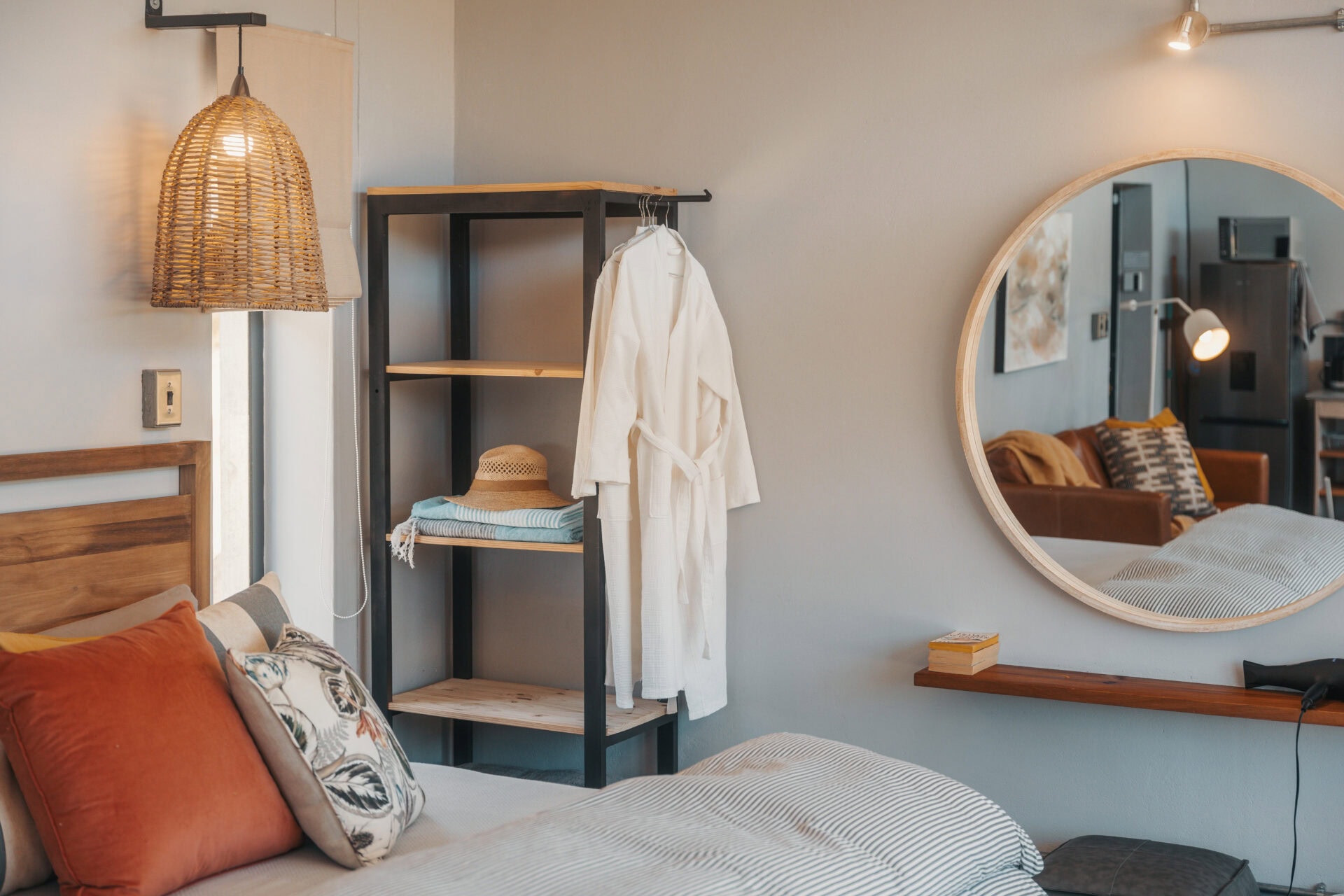 The bedroom opens out onto the deck and boasts stunning mountain, vineyard and river views. The king-sized bed comes with luxurious linen, and extra blankets and hot water bottles are provided for winter. There’s also an aircon for those hot summer nights and a clothes rail for storage.