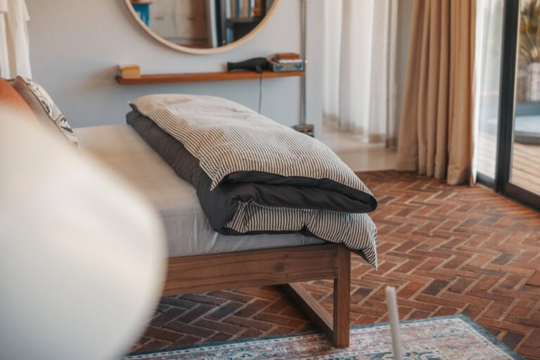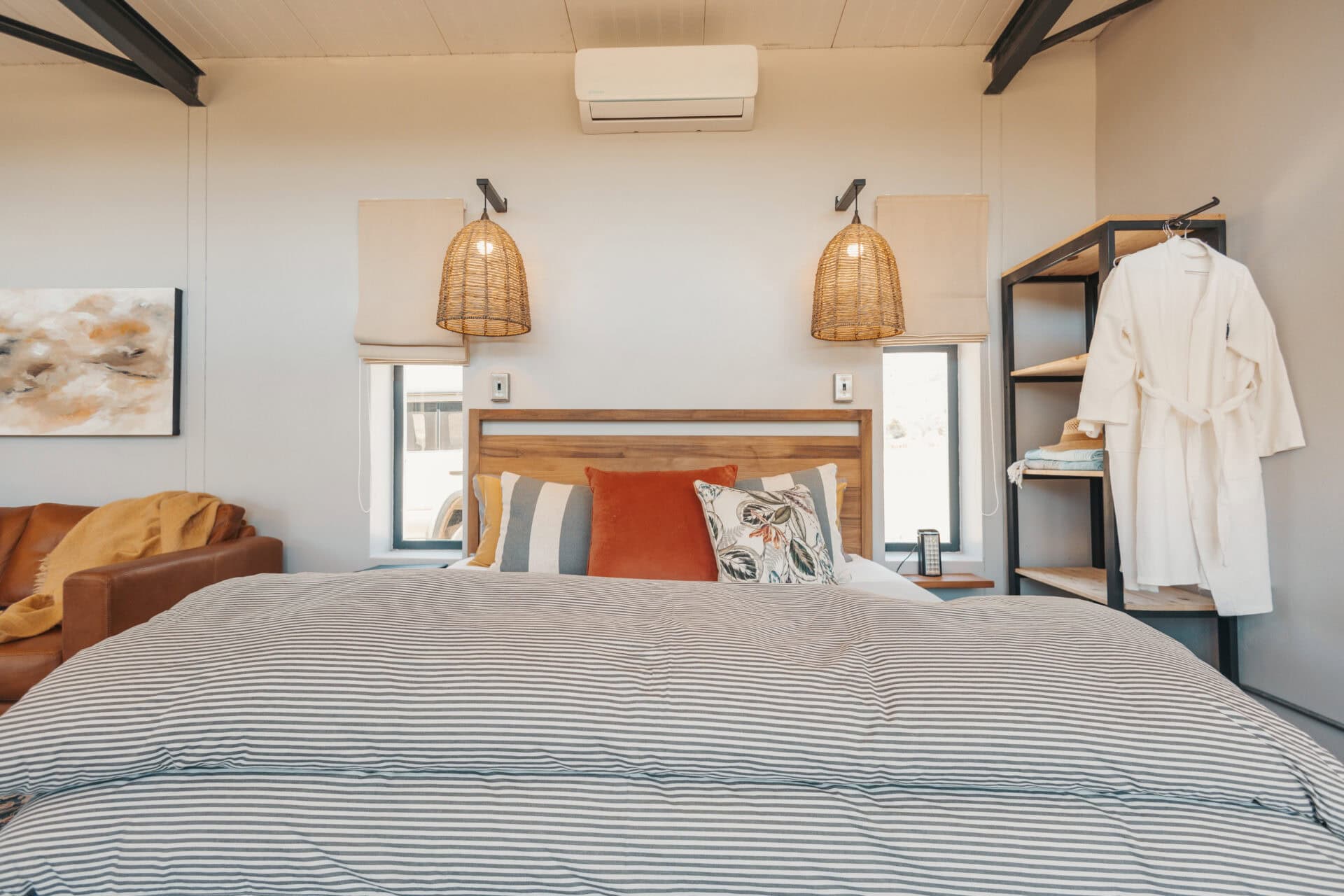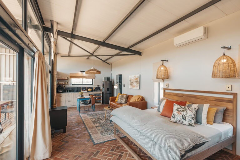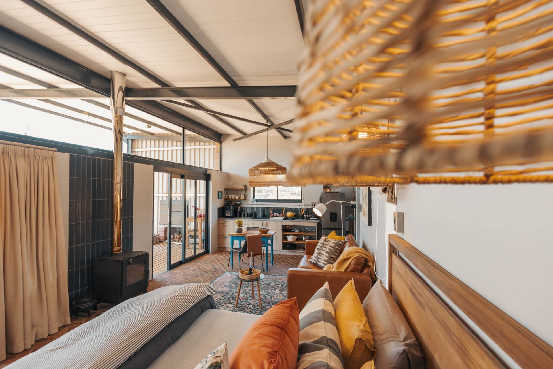 The bedroom opens out onto the deck and boasts stunning mountain, vineyard and river views. The king-sized bed comes with luxurious linen, and extra blankets and hot water bottles are provided for winter. There’s also an aircon for those hot summer nights and a clothes rail for storage.