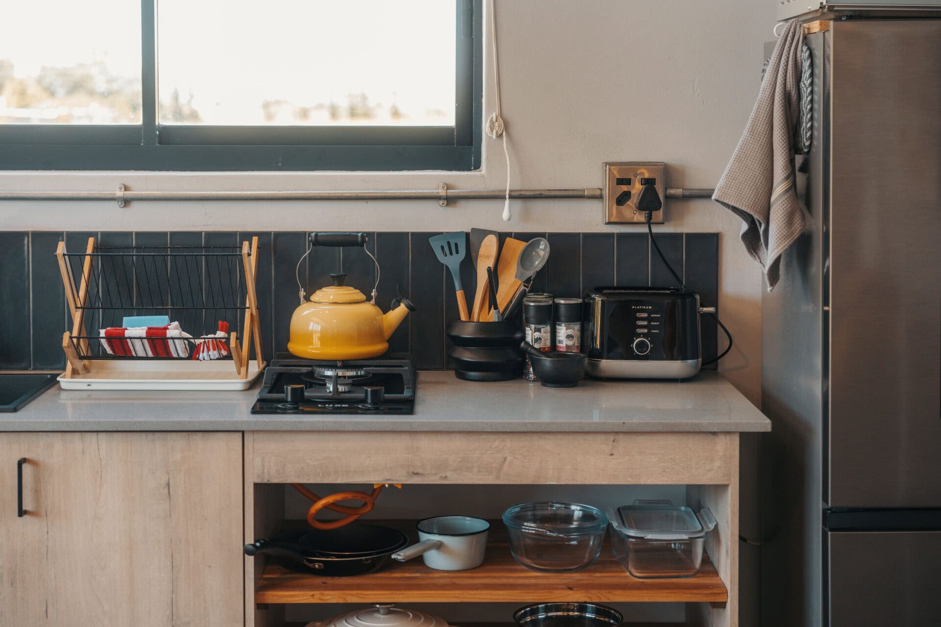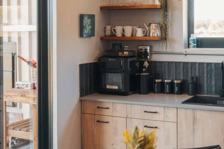 There’s a fully equipped kitchenette with a gas hob, airfryer, microwave, fridge-freezer, whistling kettle, and toaster. Instant coffee, ground coffee, tea, sugar, 250ml milk, olive oil and salt & pepper are provided.