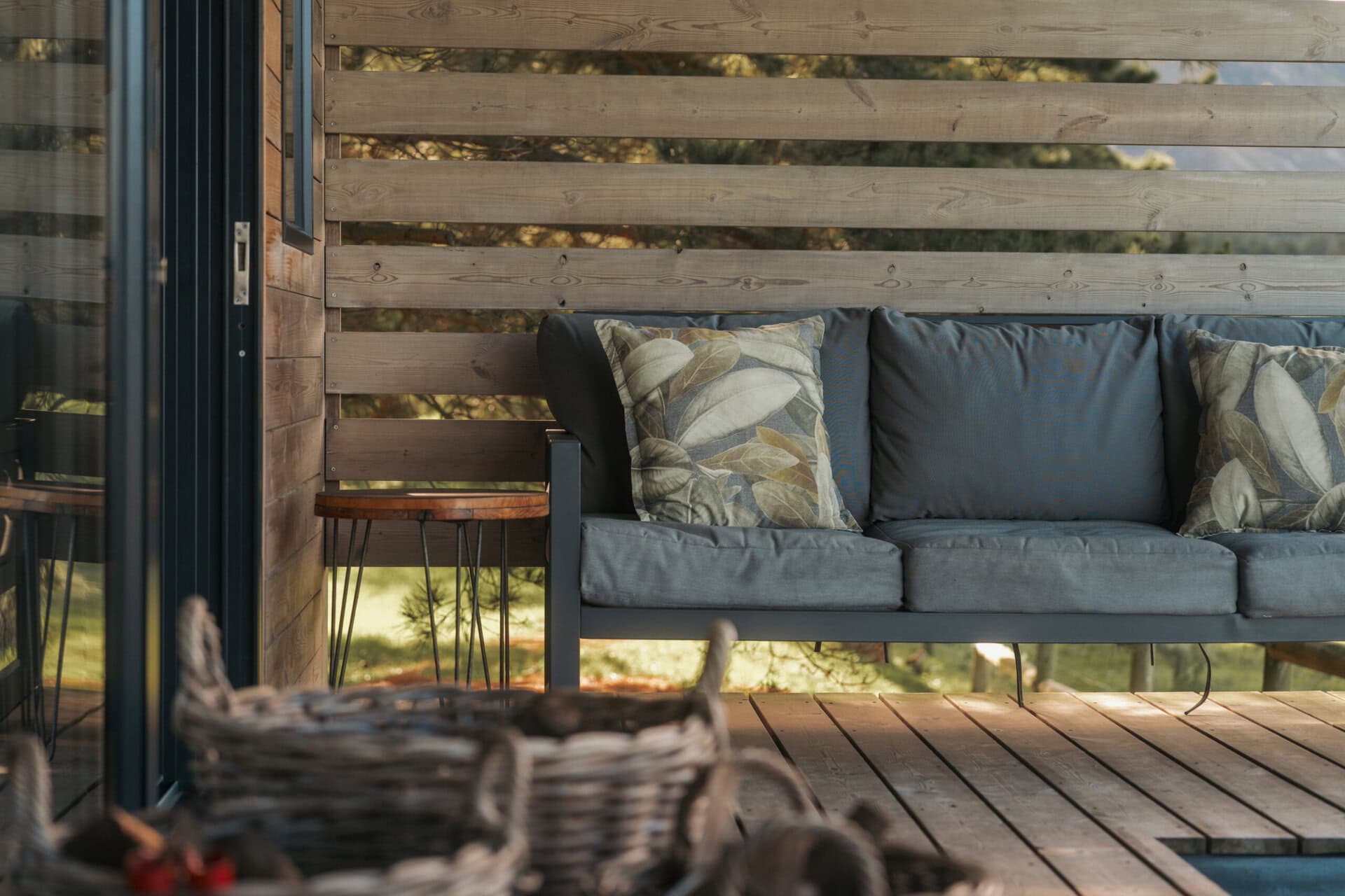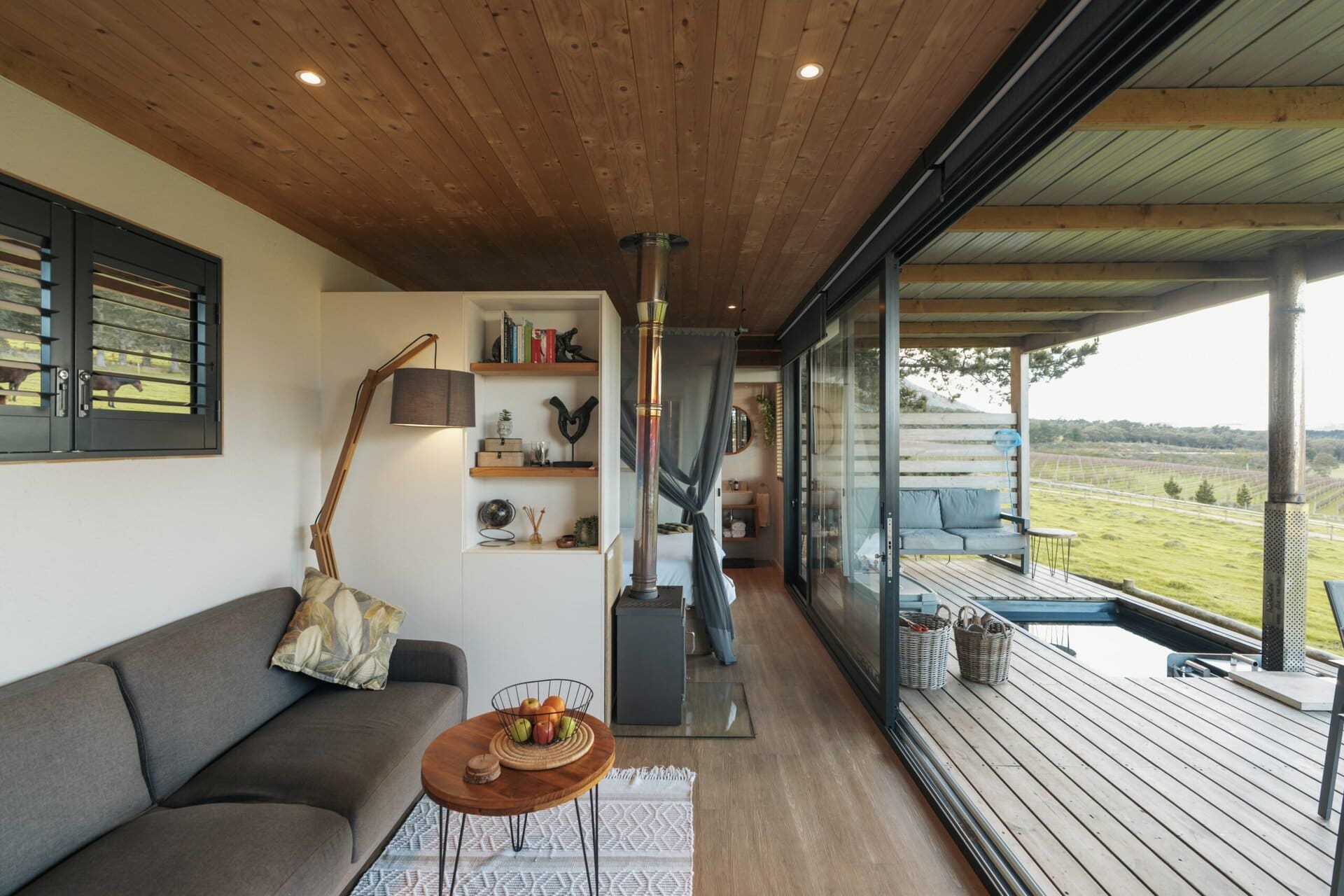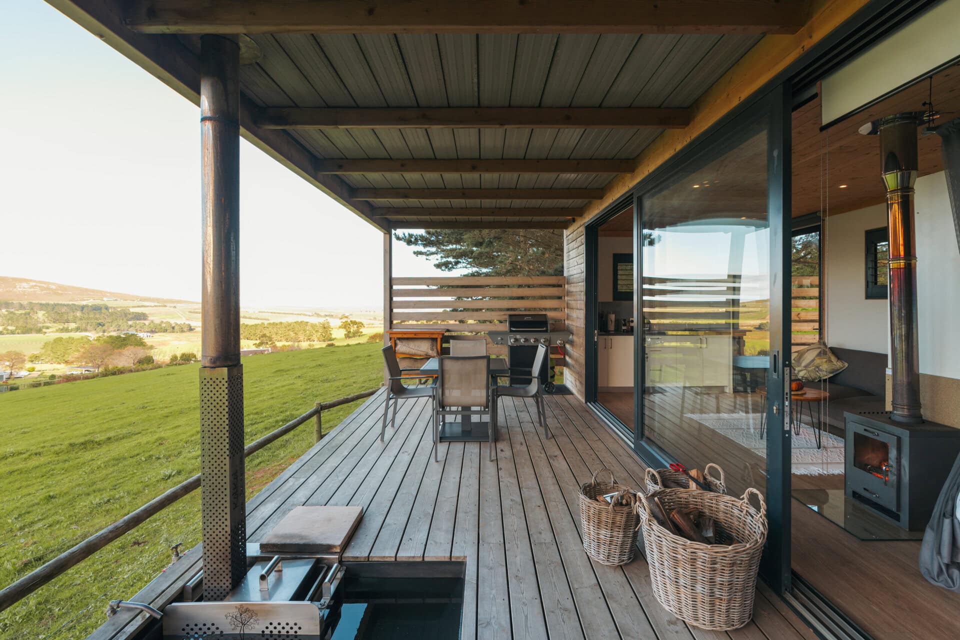 The cabin has decks on both sides, allowing you to soak in the views from every angle. The front deck offers a wood-fired hot tub, a dining table and a comfy lounge area overlooking the paddocks and dam – perfect for meals, sunsets, or simply unwinding. The back deck is a quieter spot and comes with another lounge area and an outdoor shower.
