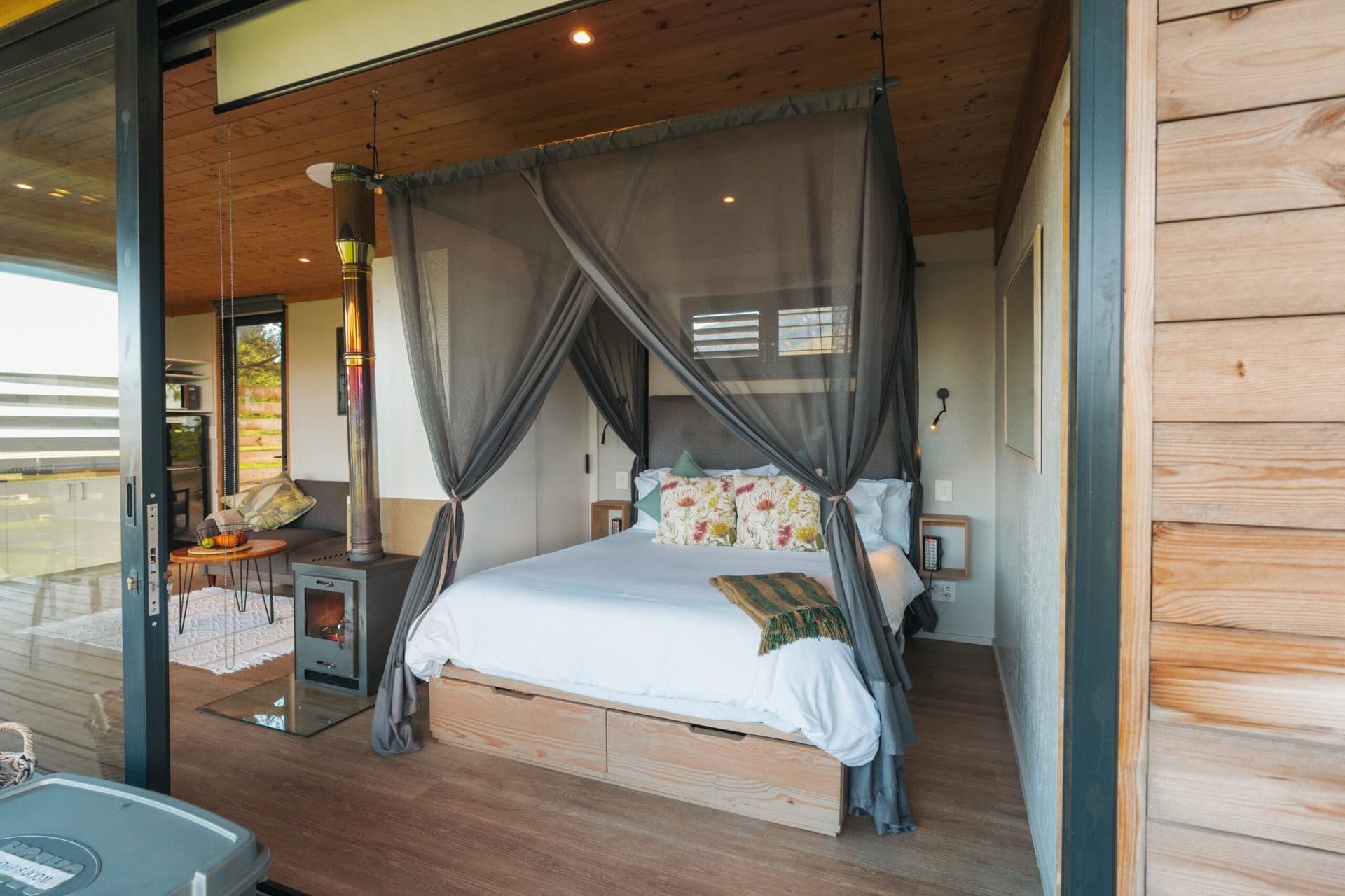 The four-poster queen-sized bed is fitted with luxurious linen, electric blankets and the fireplace heats up the cabin really nicely in winter. There’s also a cupboard for storage and robes are provided too.