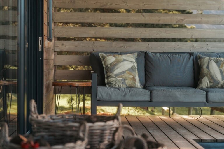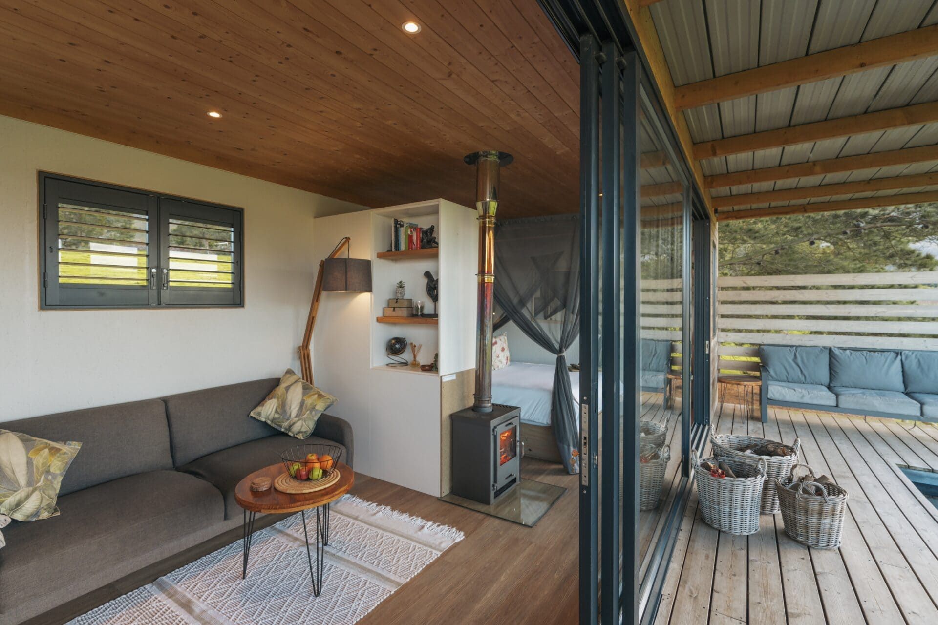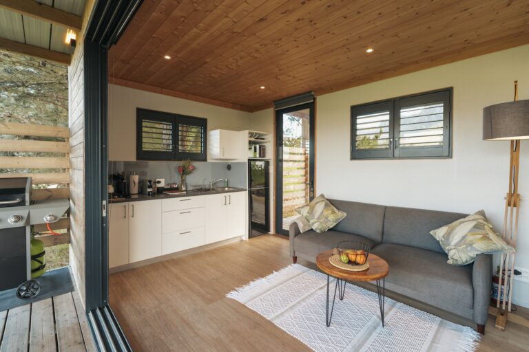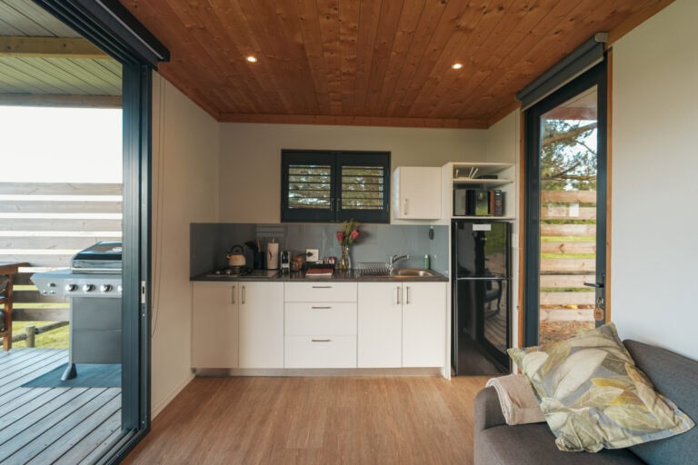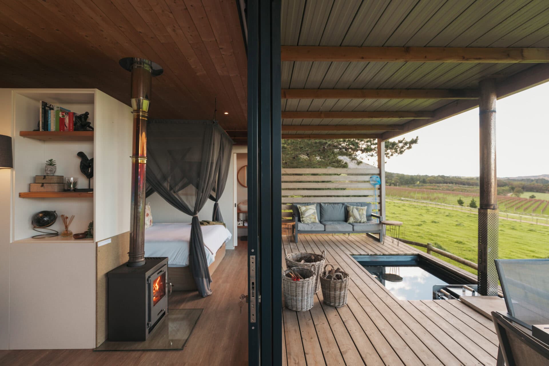 The cabin has decks on both sides, allowing you to soak in the views from every angle. The front deck offers a wood-fired hot tub, a dining table and a comfy lounge area overlooking the paddocks and dam – perfect for meals, sunsets, or simply unwinding. The back deck is a quieter spot and comes with another lounge area and an outdoor shower.