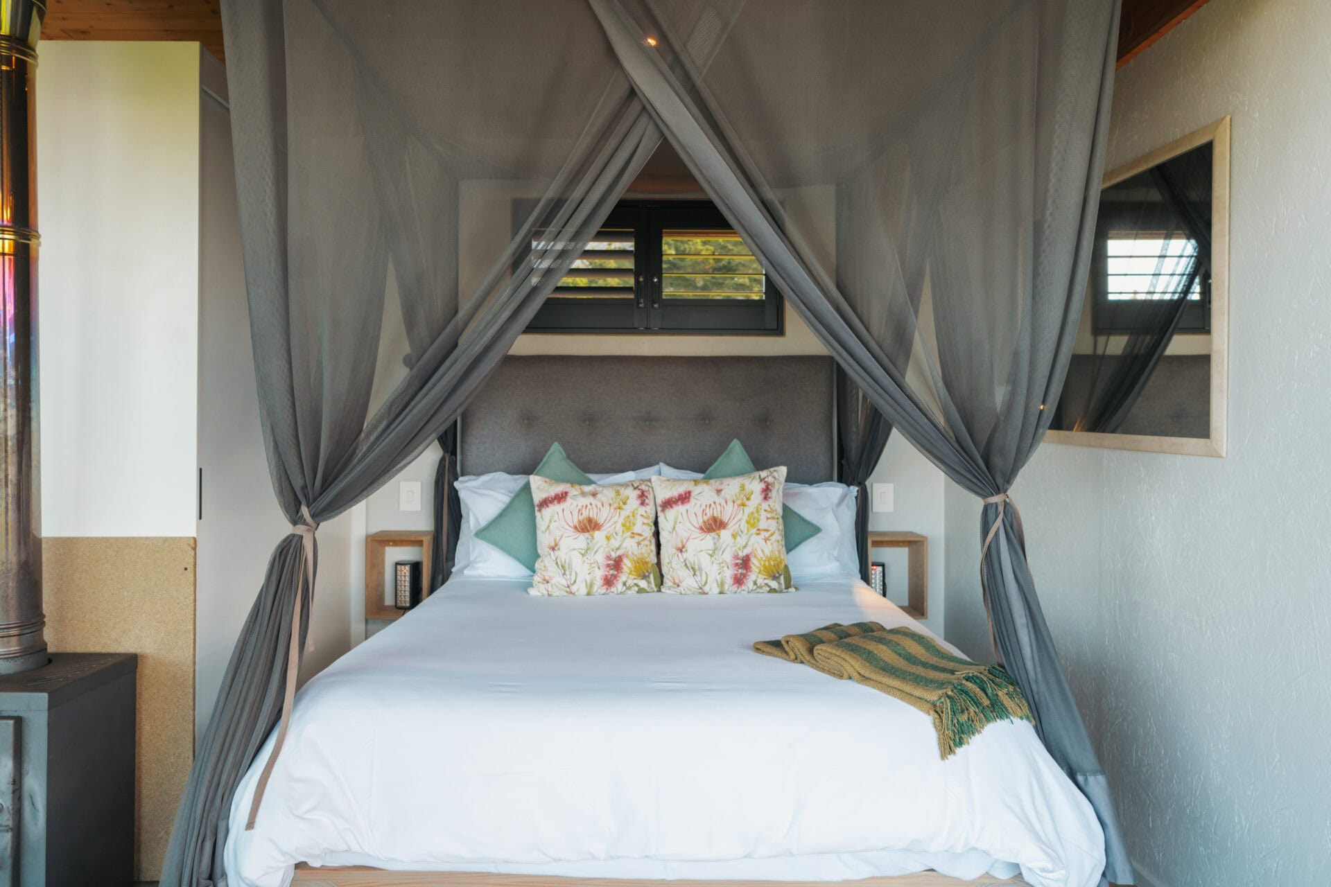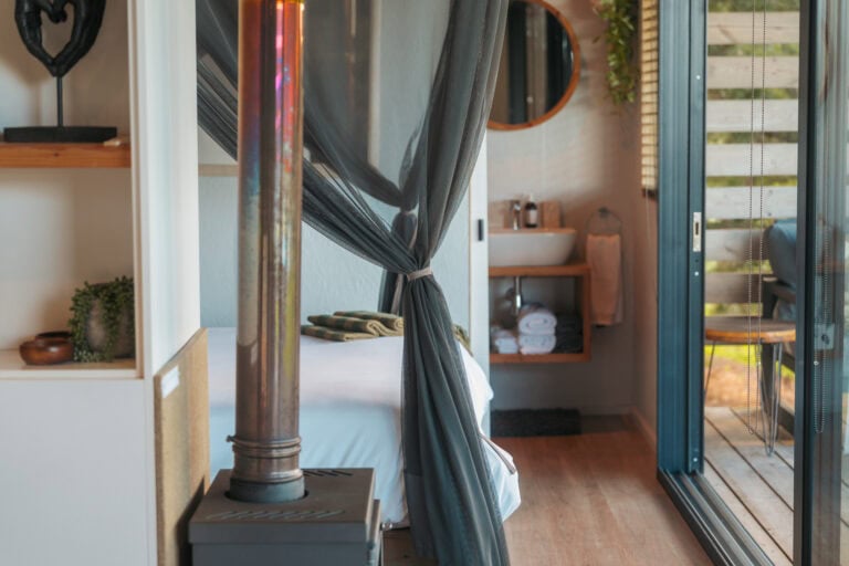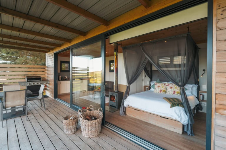 The four-poster queen-sized bed is fitted with luxurious linen, electric blankets and the fireplace heats up the cabin really nicely in winter. There’s also a cupboard for storage and robes are provided too.