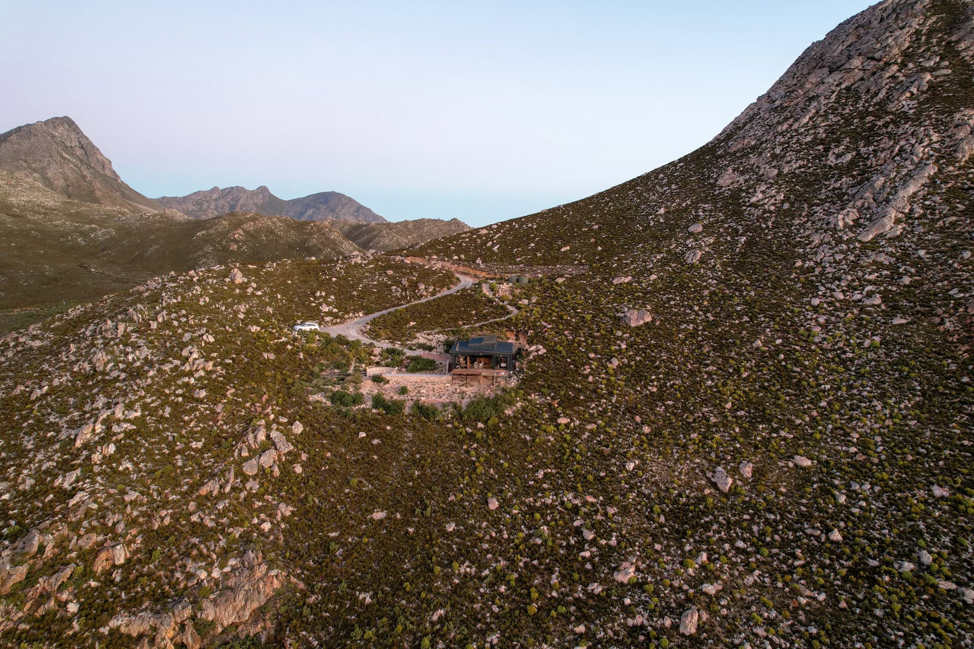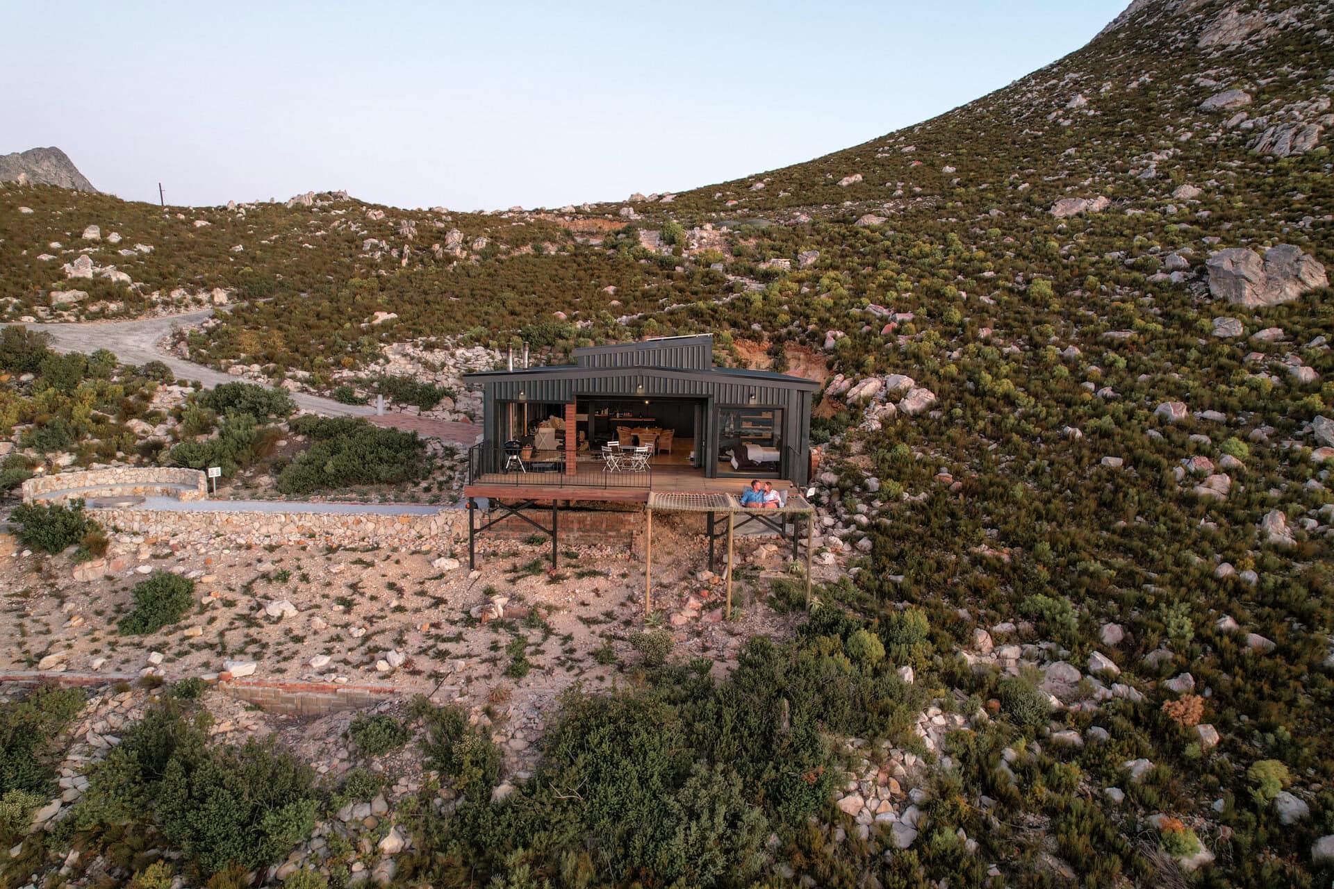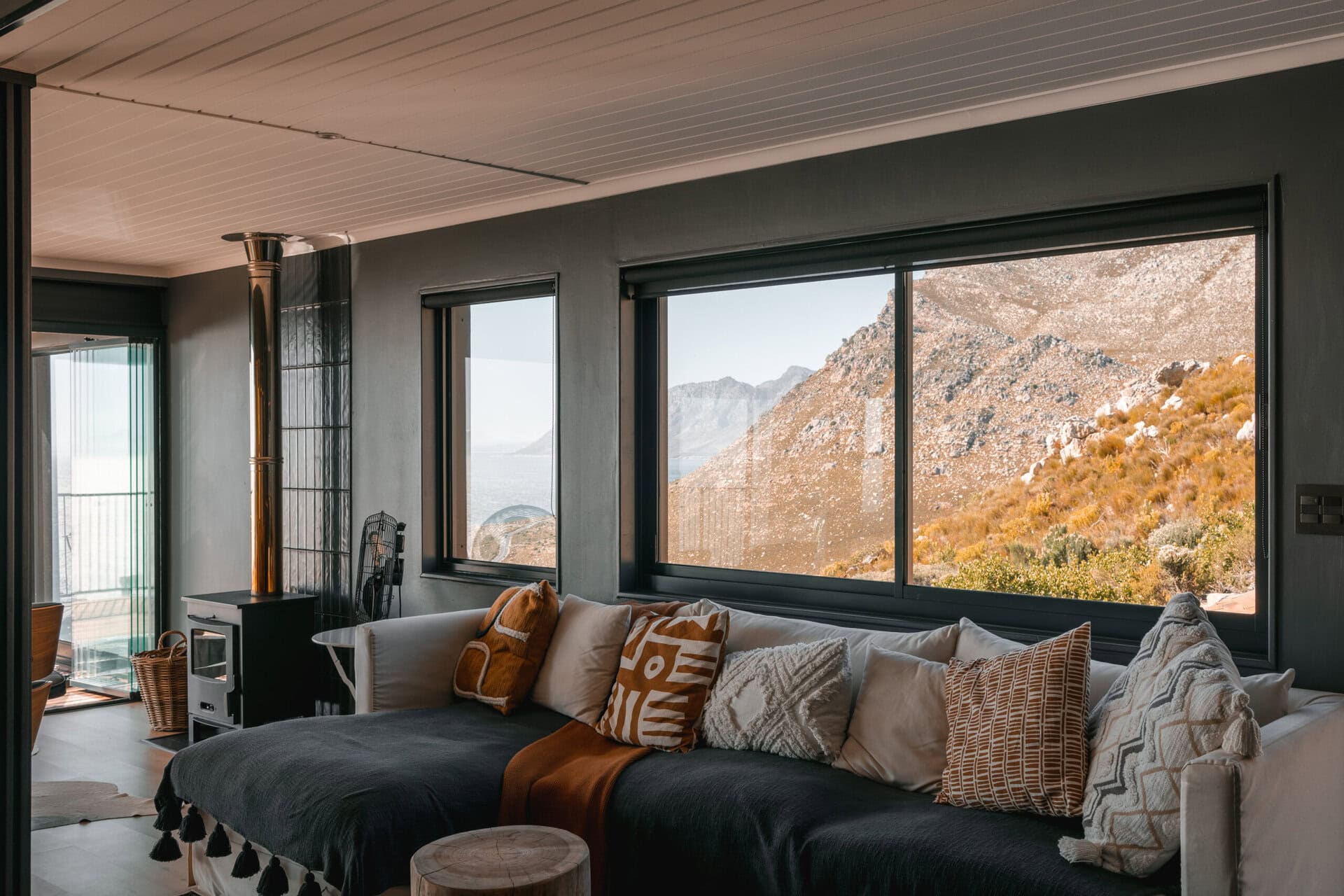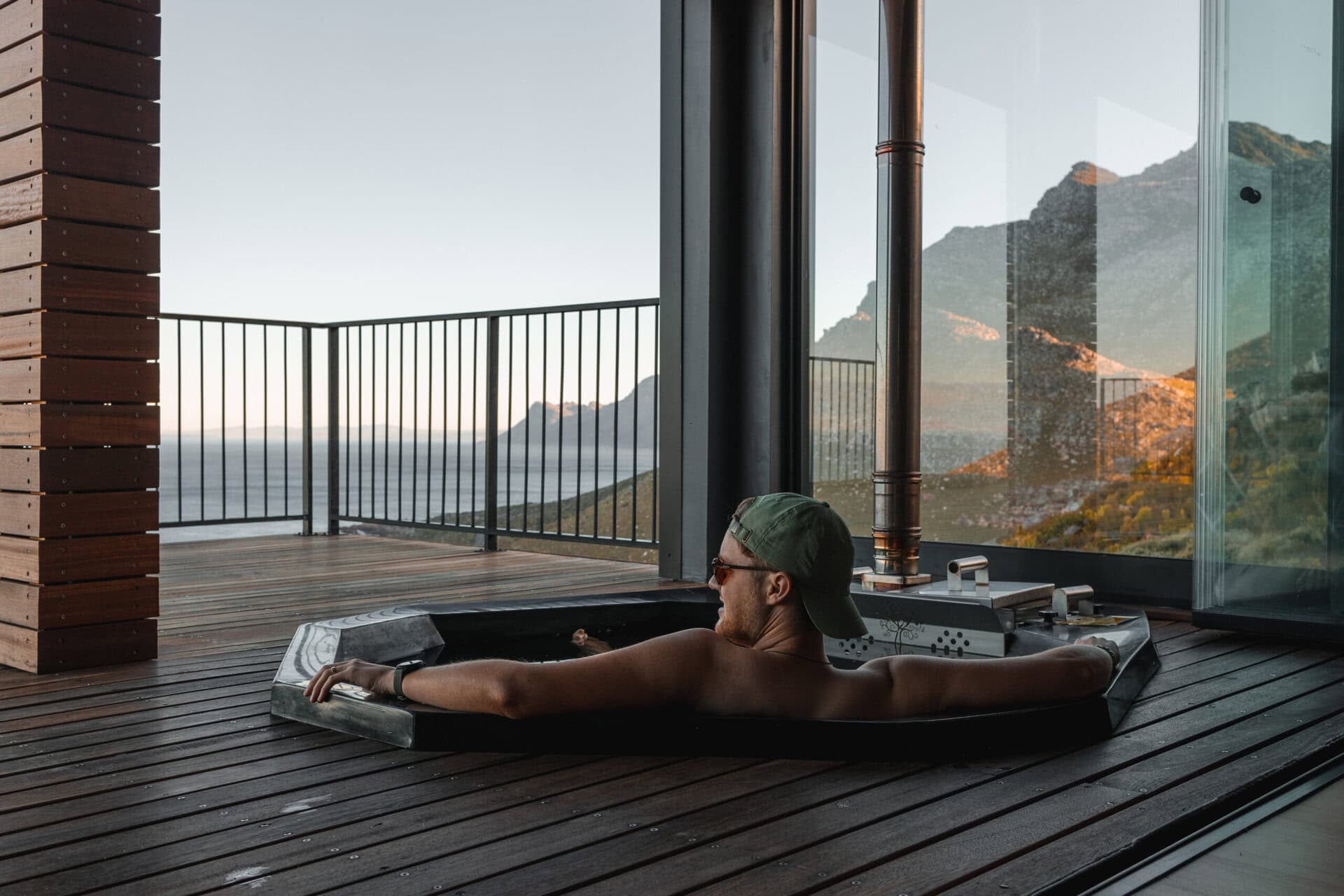 This off-grid Japandi-style eco cabin blends black and wood accents for a super luxurious feel. It comes with two bedrooms and 1.5 bathrooms and the open plan living space features fully glassed stacking doors so you can enjoy the views from every space. The large deck comes with cargo nets to enjoy the 360 degree views which will make you feel on top of the world looking over Rooi Els and out to the ocean. Half the deck is undercover so you can enjoy the wood fired hot tub no matter what the weather. The cabin also has backup power for when loadshedding hits and there is high-speed Wi-Fi which is perfect if you’re looking to work remotely.