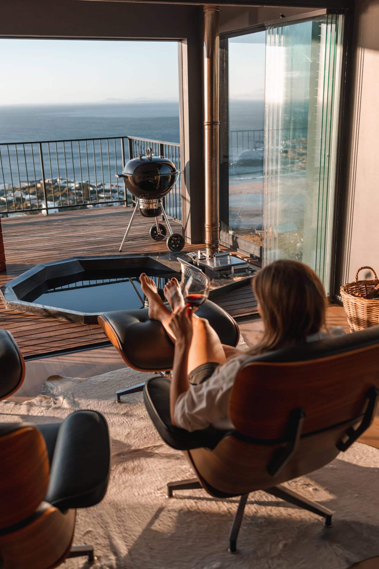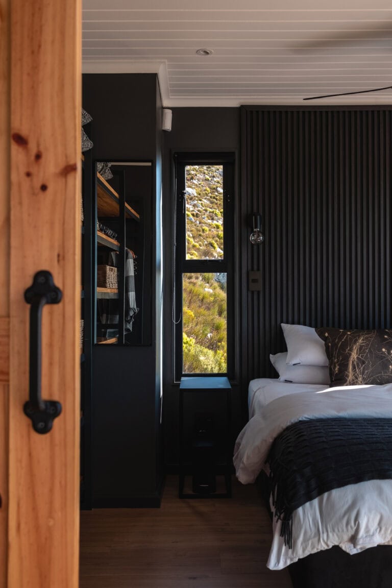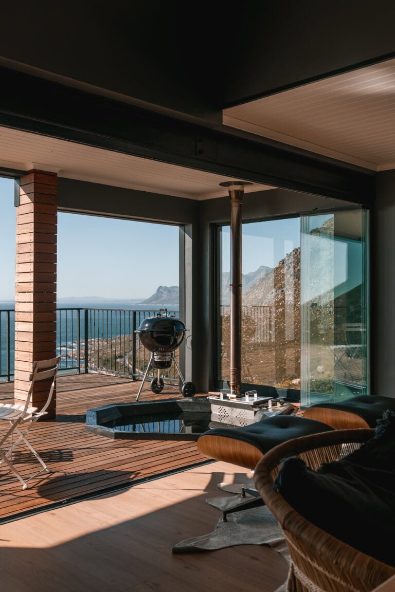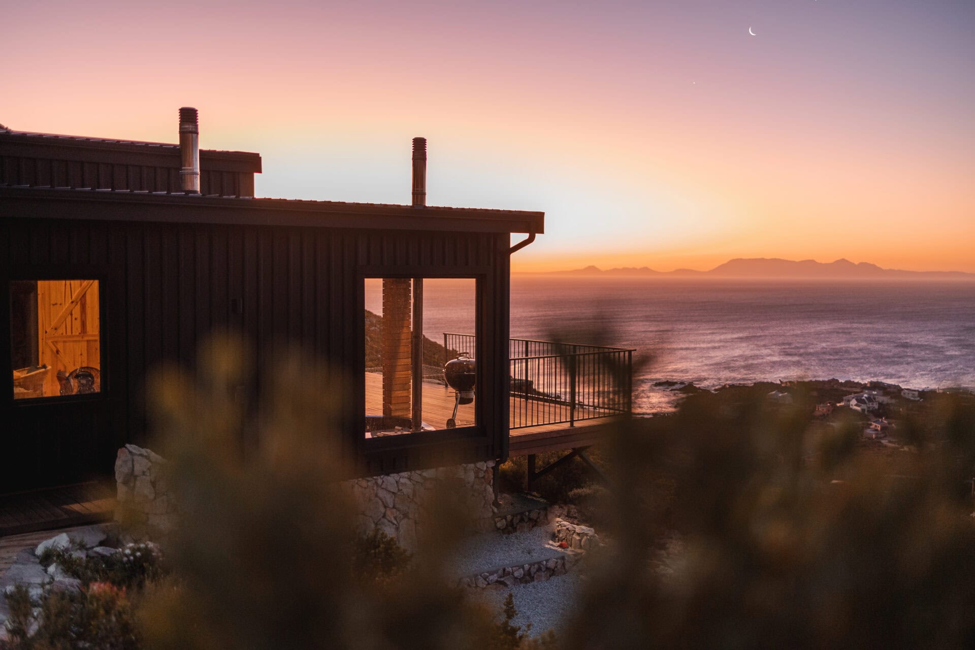 This off-grid Japandi-style eco cabin blends black and wood accents for a super luxurious feel. It comes with two bedrooms and 1.5 bathrooms and the open plan living space features fully glassed stacking doors so you can enjoy the views from every space. The large deck comes with cargo nets to enjoy the 360 degree views which will make you feel on top of the world looking over Rooi Els and out to the ocean. Half the deck is undercover so you can enjoy the wood fired hot tub no matter what the weather. The cabin also has backup power for when loadshedding hits and there is high-speed Wi-Fi which is perfect if you’re looking to work remotely.