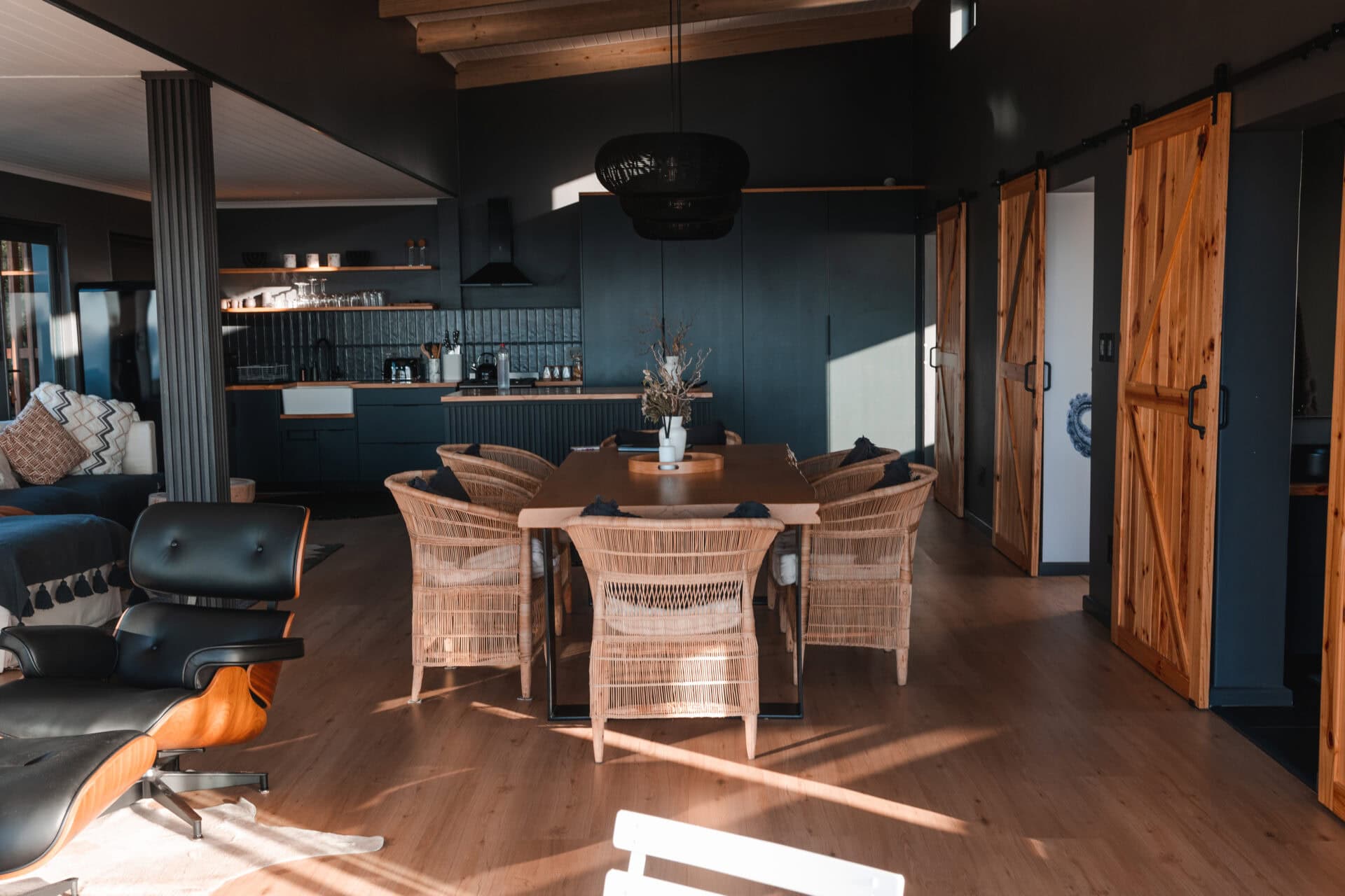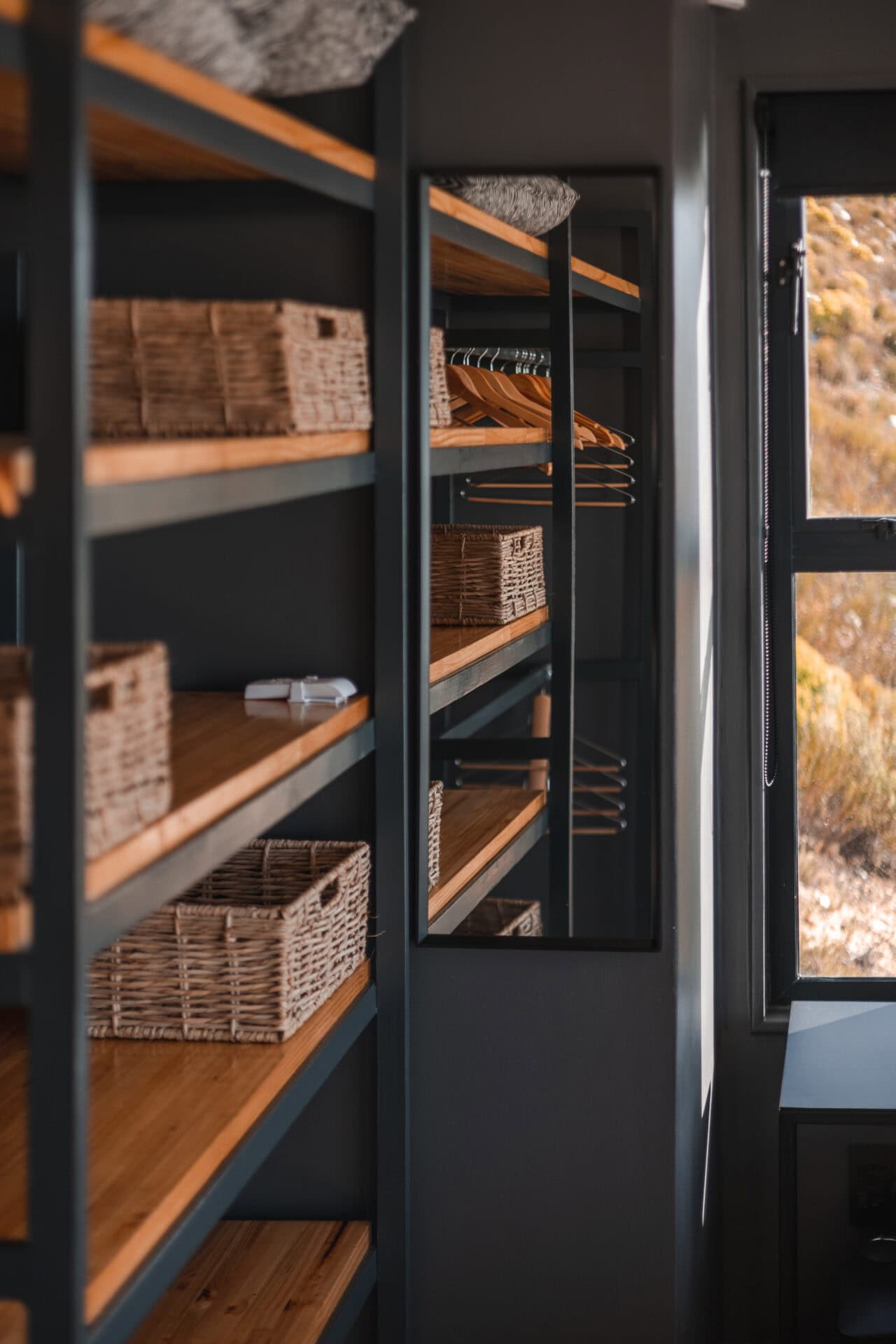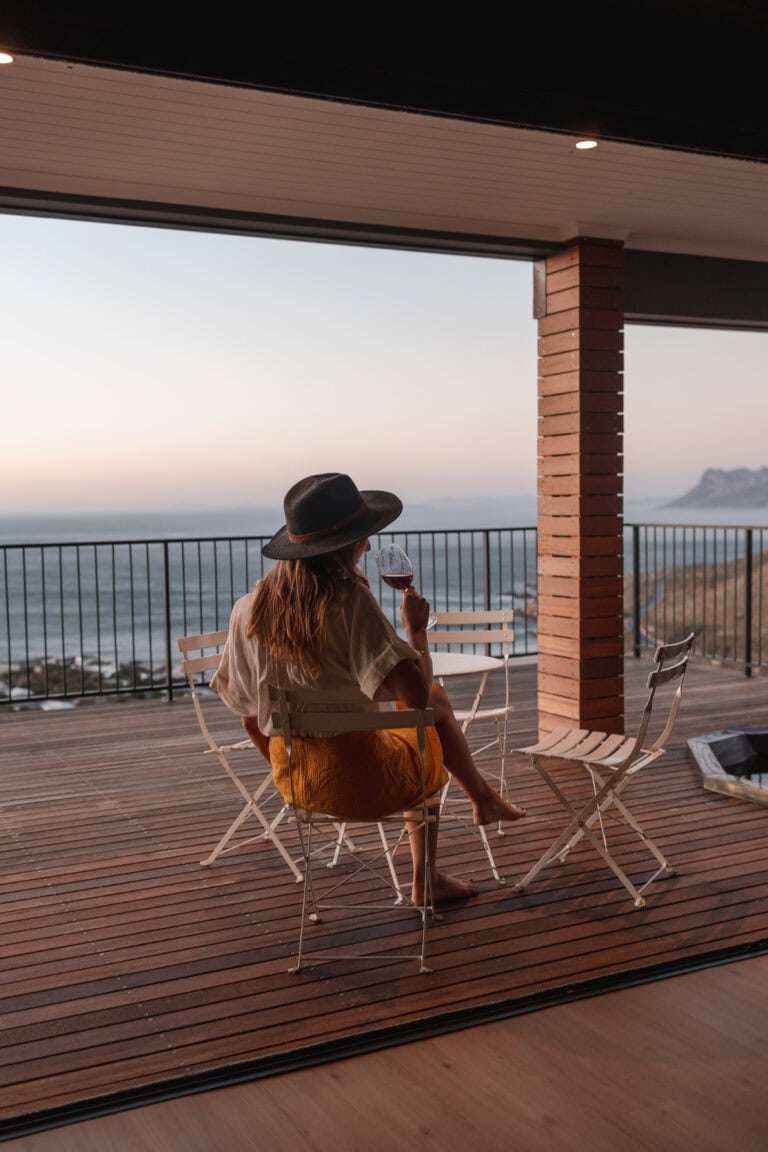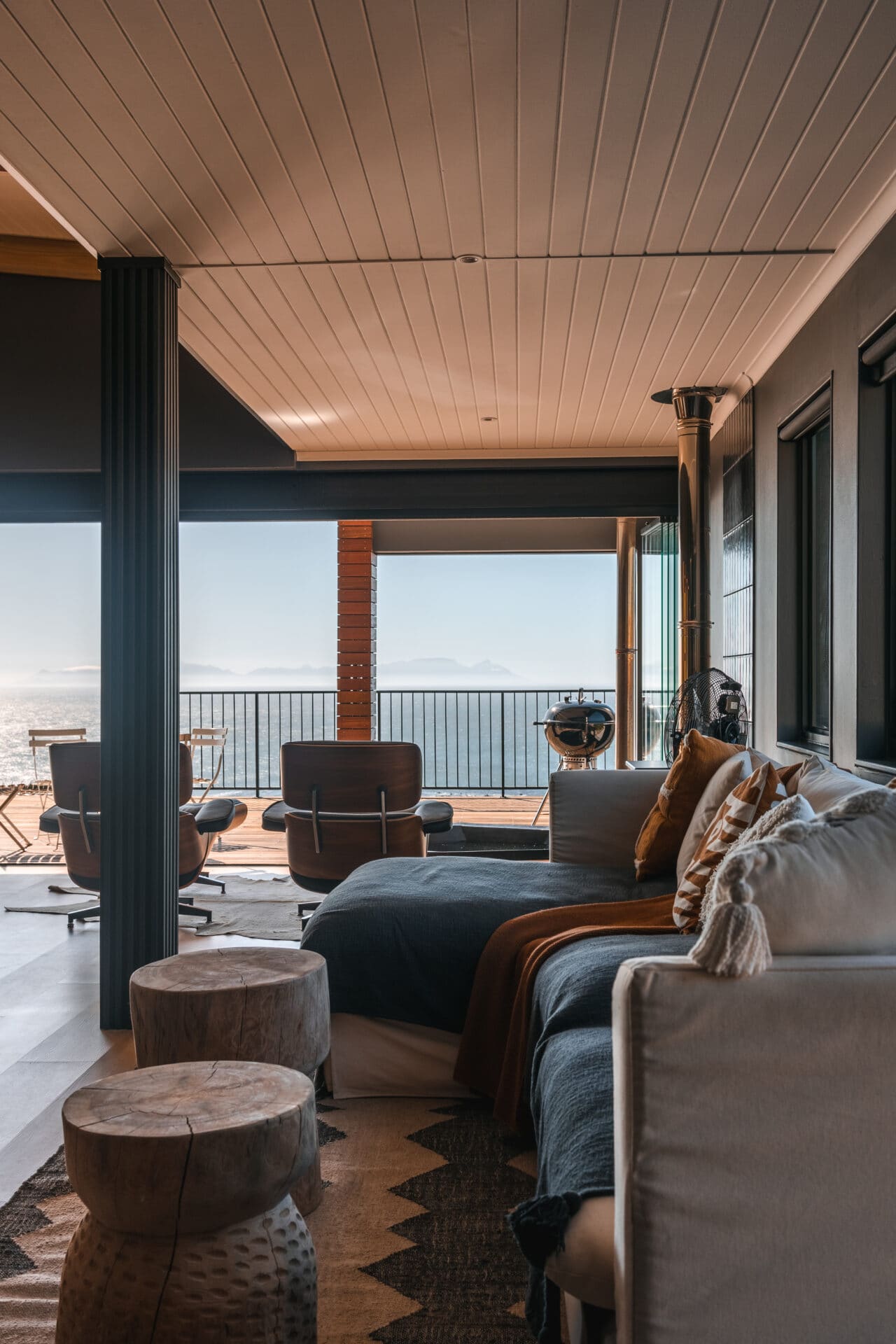 This off-grid Japandi-style eco cabin blends black and wood accents for a super luxurious feel. It comes with two bedrooms and 1.5 bathrooms and the open plan living space features fully glassed stacking doors so you can enjoy the views from every space. The large deck comes with cargo nets to enjoy the 360 degree views which will make you feel on top of the world looking over Rooi Els and out to the ocean. Half the deck is undercover so you can enjoy the wood fired hot tub no matter what the weather. The cabin also has backup power for when loadshedding hits and there is high-speed Wi-Fi which is perfect if you’re looking to work remotely.