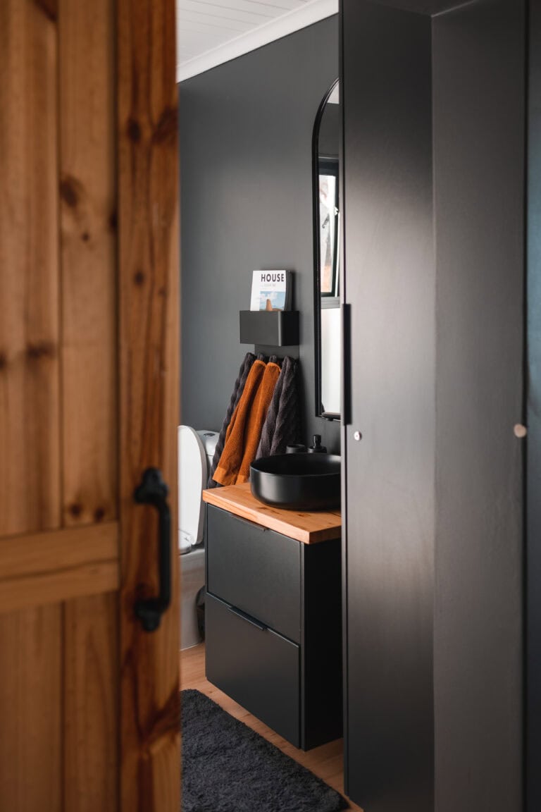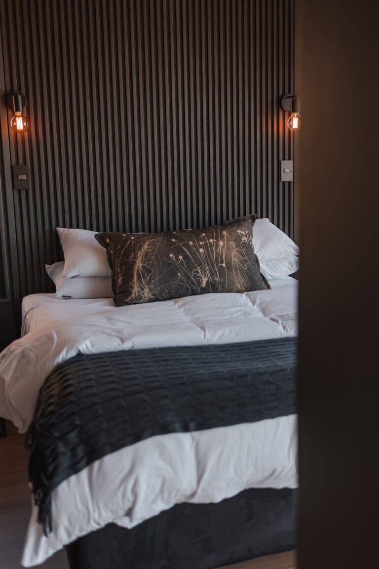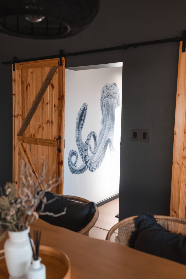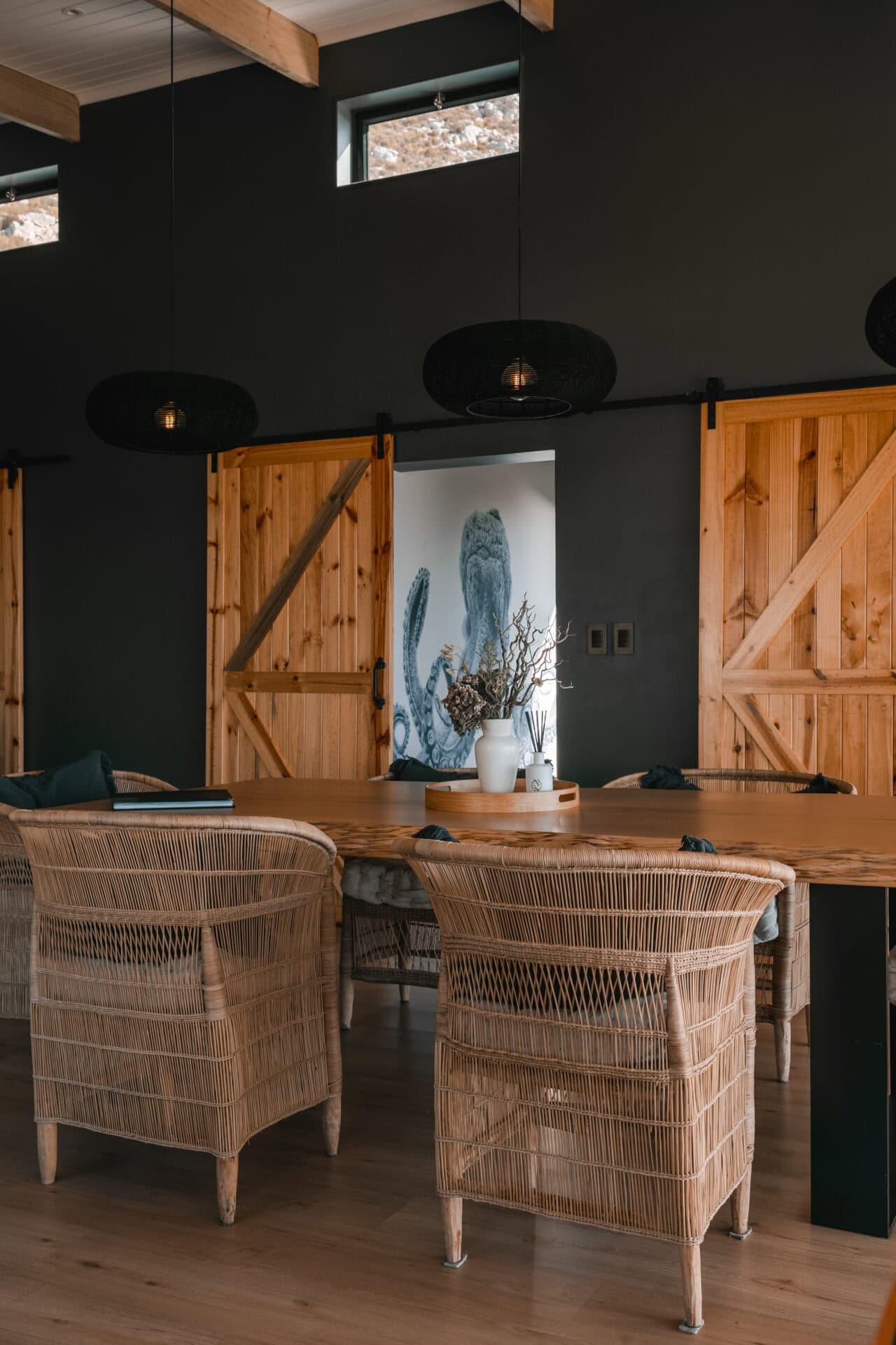 This off-grid Japandi-style eco cabin blends black and wood accents for a super luxurious feel. It comes with two bedrooms and 1.5 bathrooms and the open plan living space features fully glassed stacking doors so you can enjoy the views from every space. The large deck comes with cargo nets to enjoy the 360 degree views which will make you feel on top of the world looking over Rooi Els and out to the ocean. Half the deck is undercover so you can enjoy the wood fired hot tub no matter what the weather. The cabin also has backup power for when loadshedding hits and there is high-speed Wi-Fi which is perfect if you’re looking to work remotely.