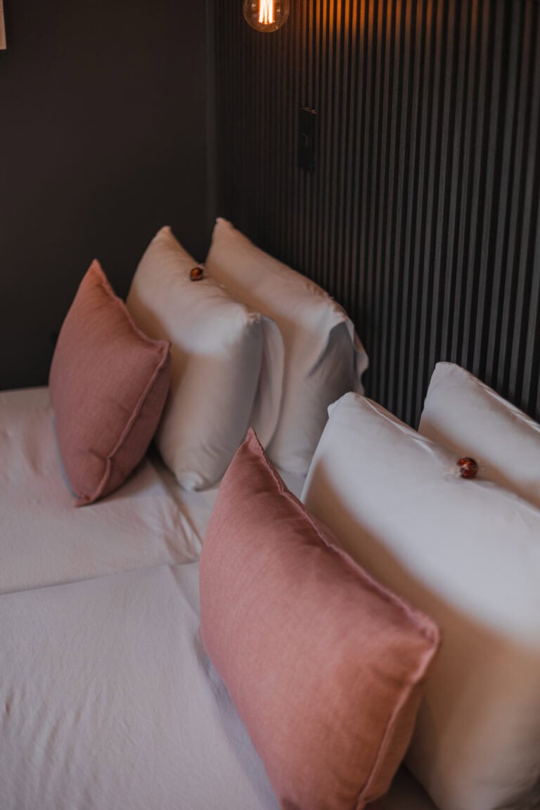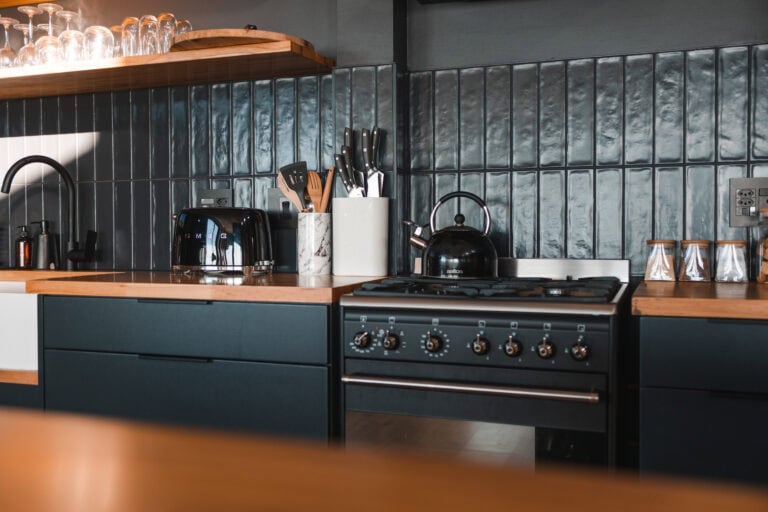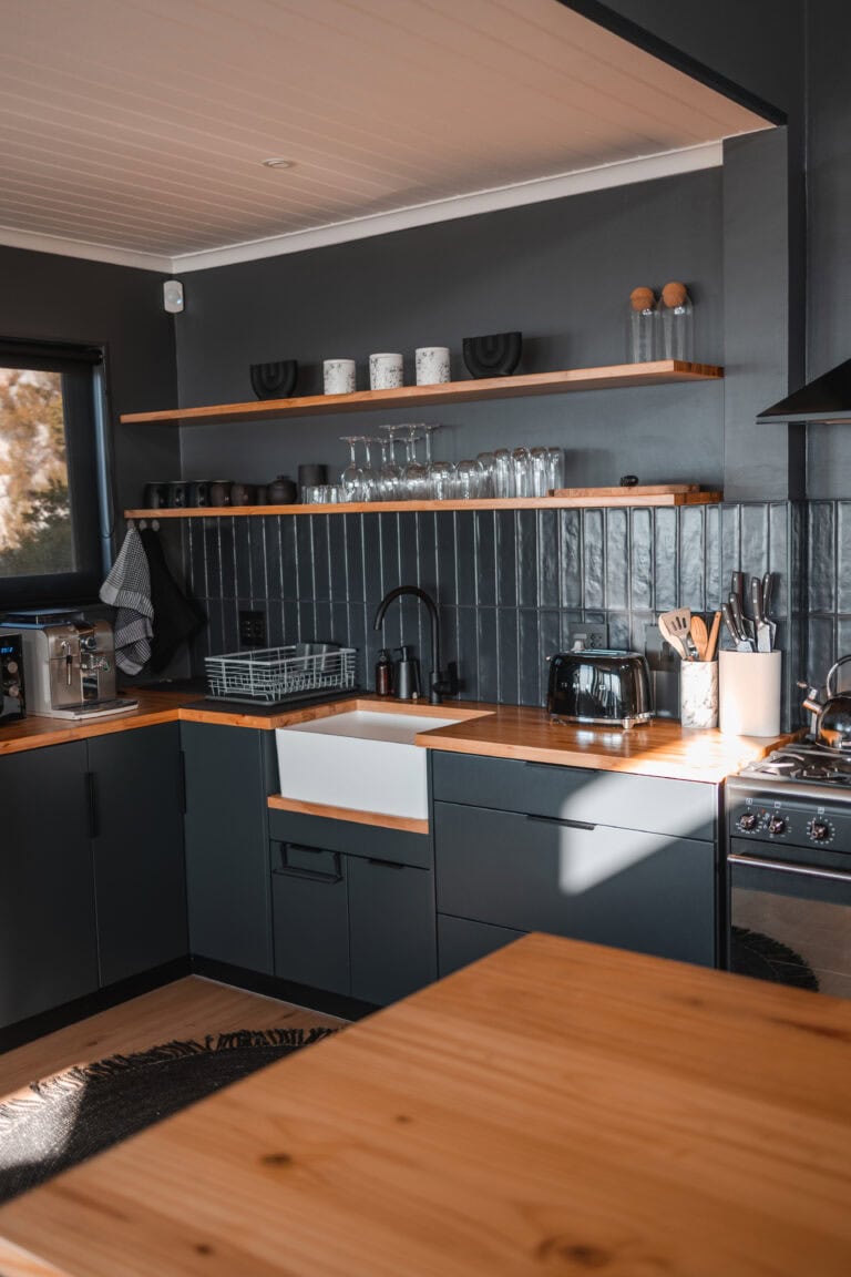 The fully equipped kitchen features sleek black cabinetry and warm wooden countertops and comes with a SMEG fridge and toaster, coffee machine, freestanding oven with a gas hob, a whistling kettle, microwave and dishwasher. Coffee, tea, sugar, milk, rusks, olive oil, balsamic vinegar and salt & pepper are provided.
