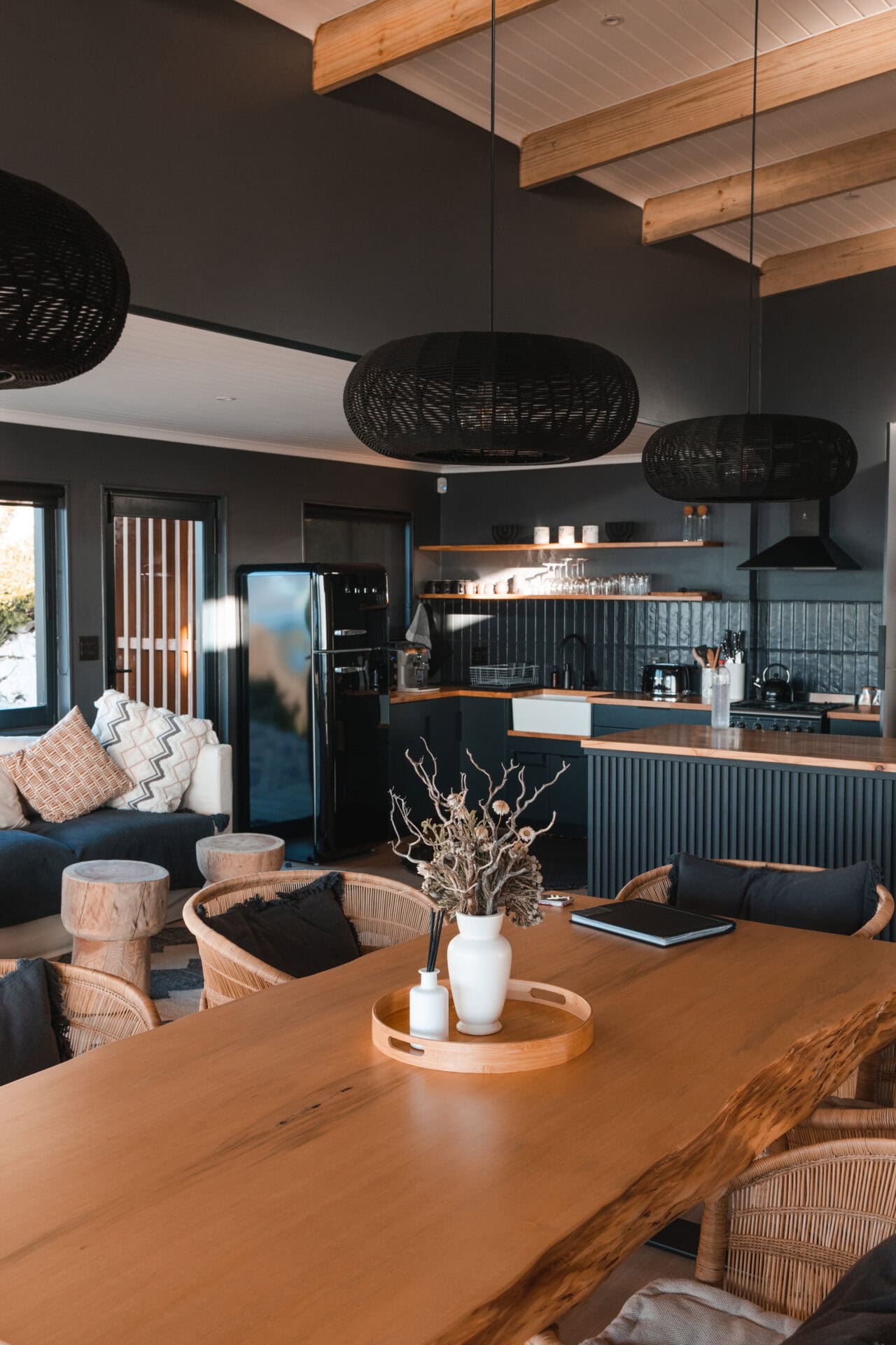 The open plan living space has been designed for relaxation and comfort with a L-shaped couch and two leather armchairs (with foot rests!) next to the fireplace. There is also a large six seater dining table complete with malawi chairs. The glassed stacking doors frame stunning sea views and open out onto the deck.