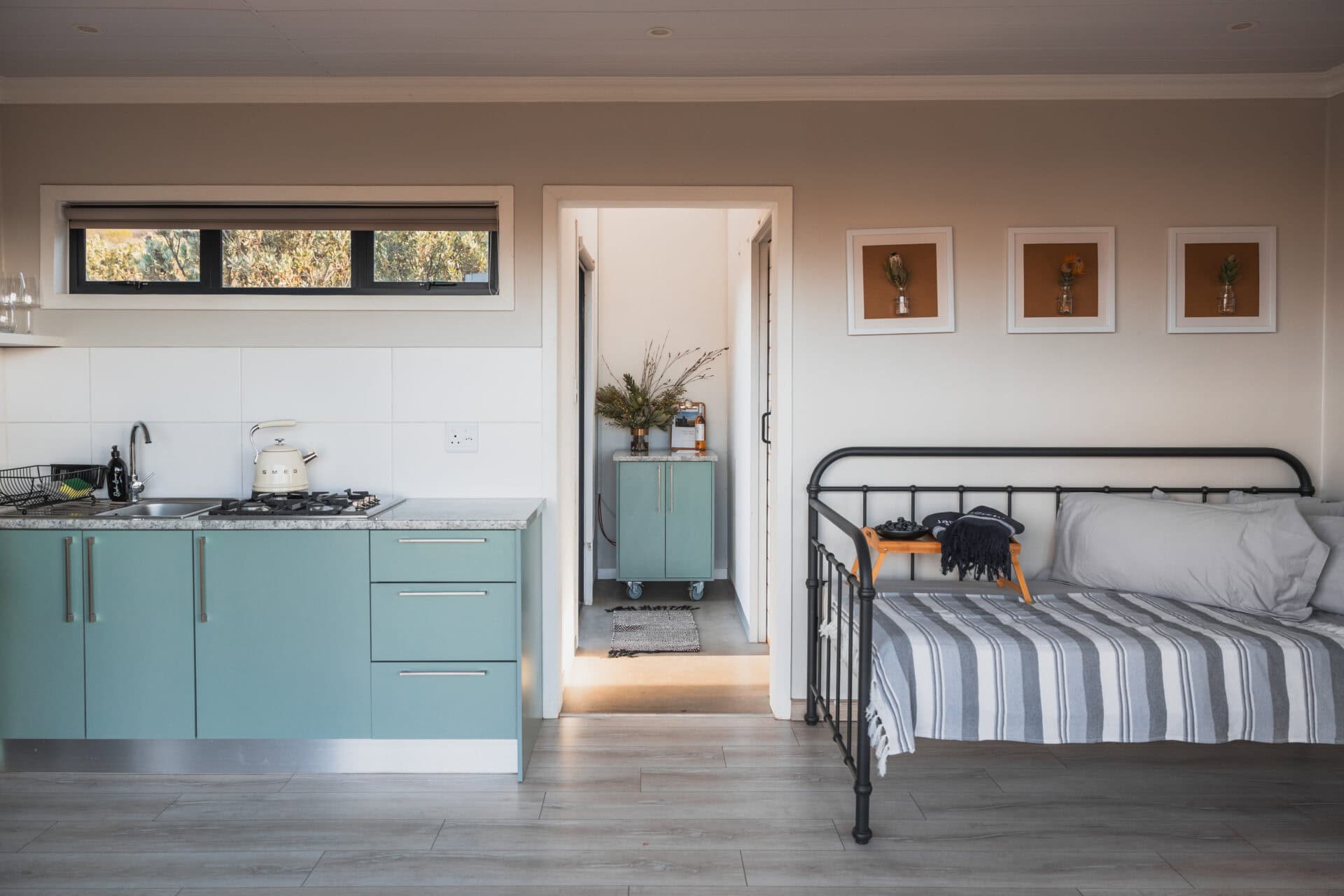 There’s a fully equipped kitchenette with a gas hob, fridge-freezer and SMEG whistling kettle. Ground coffee, instant coffee, tea, sugar, hot chocolate, marshmallows, braai spices, salt & pepper are provided.