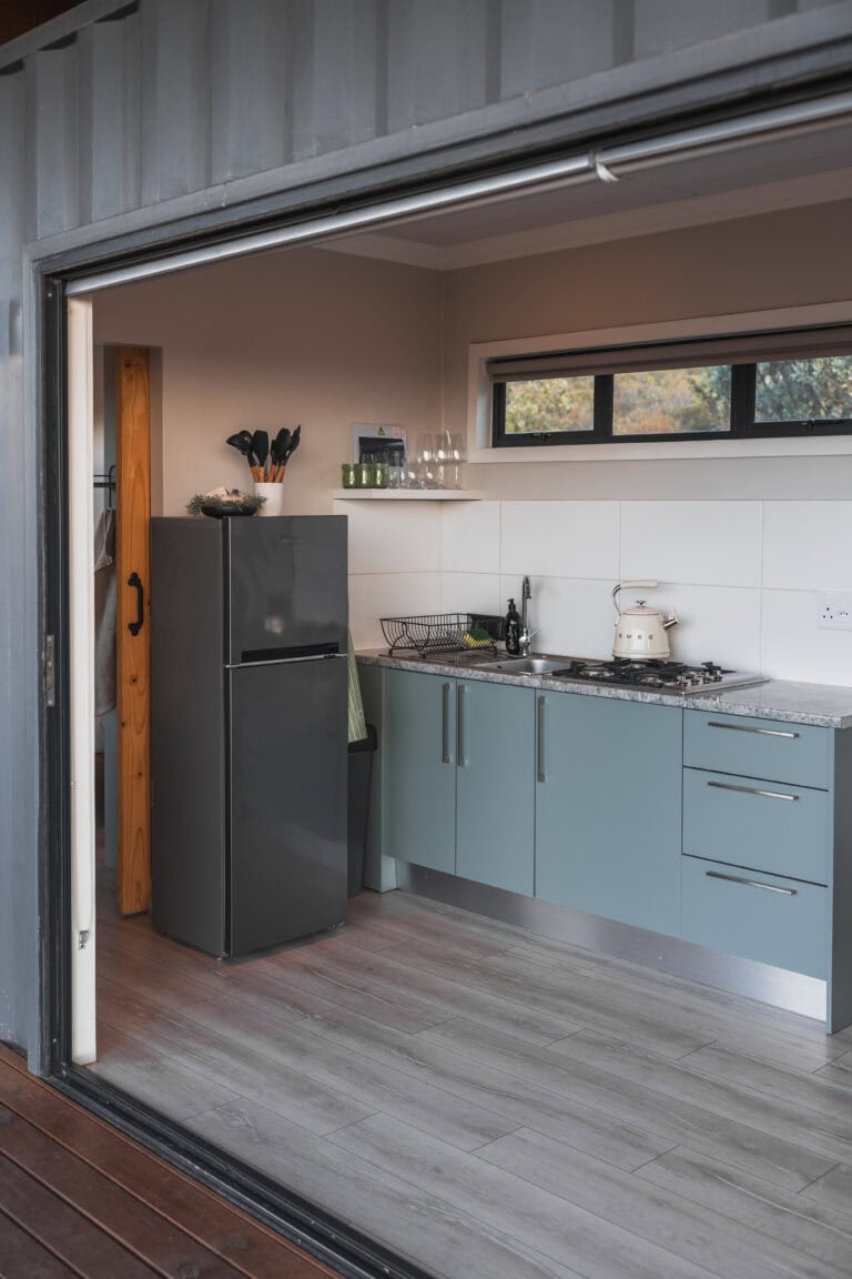 There’s a fully equipped kitchenette with a gas hob, fridge-freezer and SMEG whistling kettle. Ground coffee, instant coffee, tea, sugar, hot chocolate, marshmallows, braai spices, salt & pepper are provided.