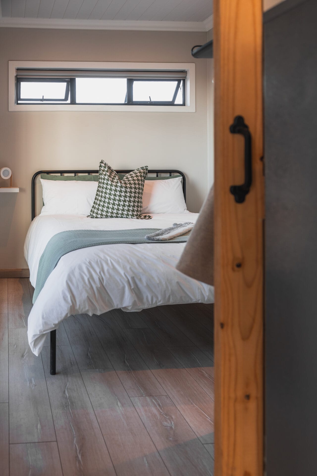 The two bedrooms are located on opposite sides of the cabin and are mirror images of each other. Each room comes with a queen-sized bed and cupboard for storage. Hot water bottles and extra blankets are provided for winter.