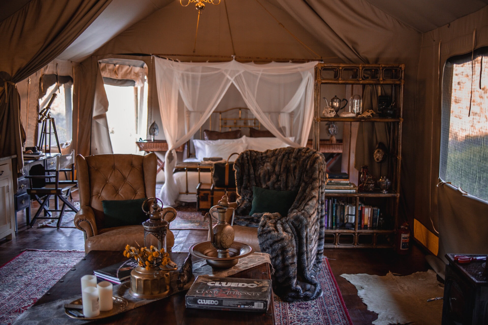 This spacious, open-plan tented stay offers the ultimate glamping experience for two. The colonial-inspired decor, complemented by antiques and memorabilia, will transport you back to the era of exploration. Outside, you’ll find all the amenities you could wish for, including a massive cargo net. A walkway leads around to the splash pool, which doubles as a hot tub. Another path takes you to the outdoor lounge and braai area, equipped with a braai and pizza oven. Accessible only by 4×4, this secluded retreat is perfect for those seeking an off-grid adventure away from everything and everyone.